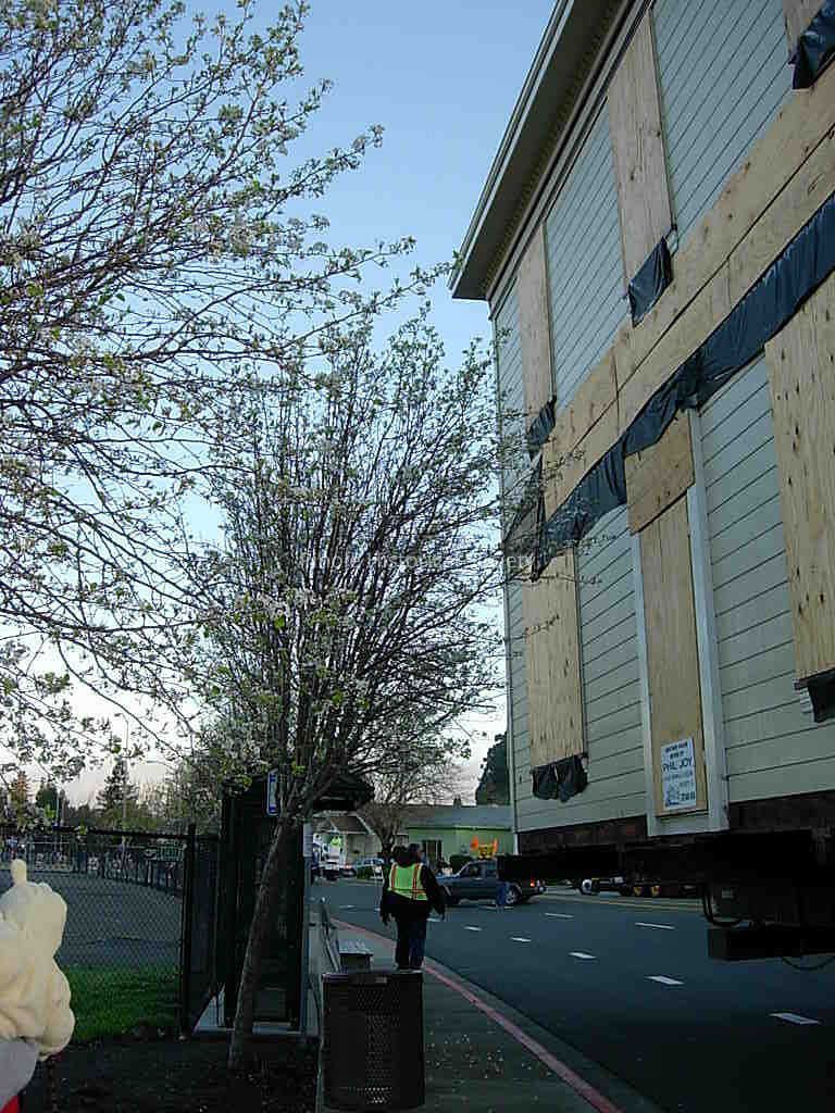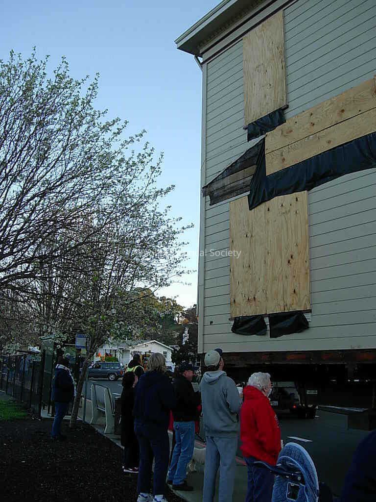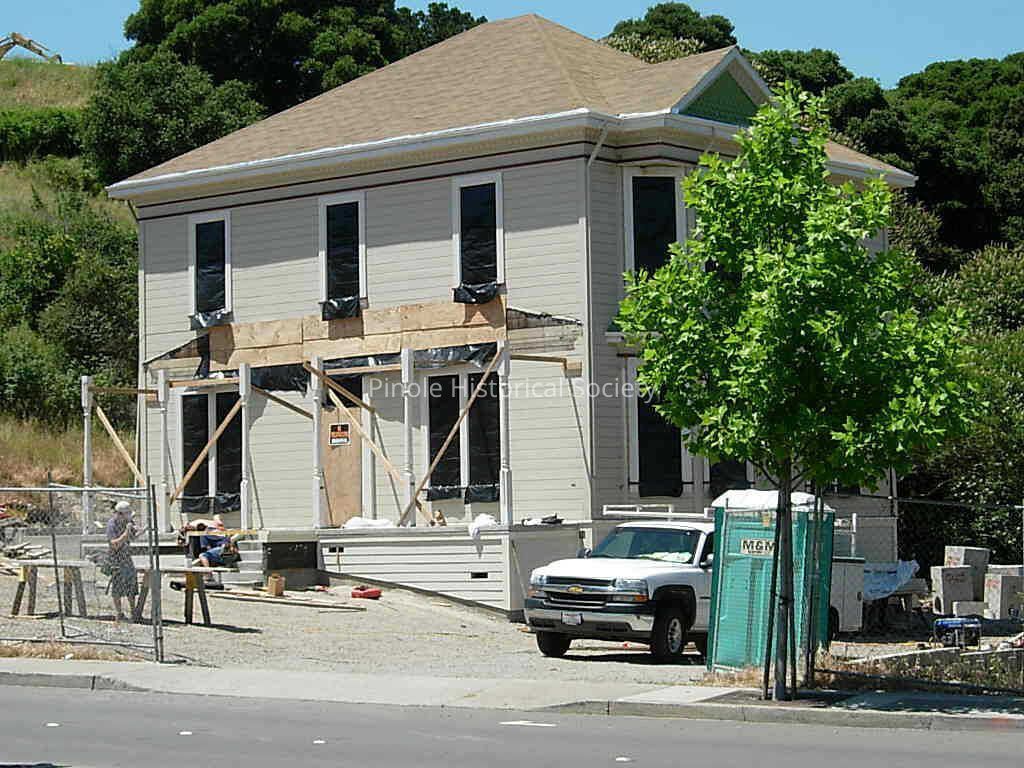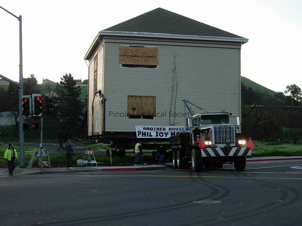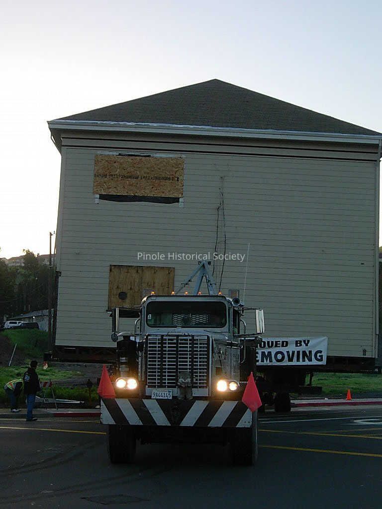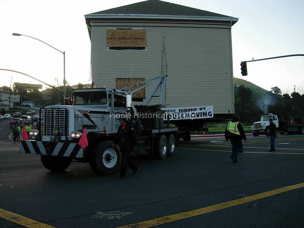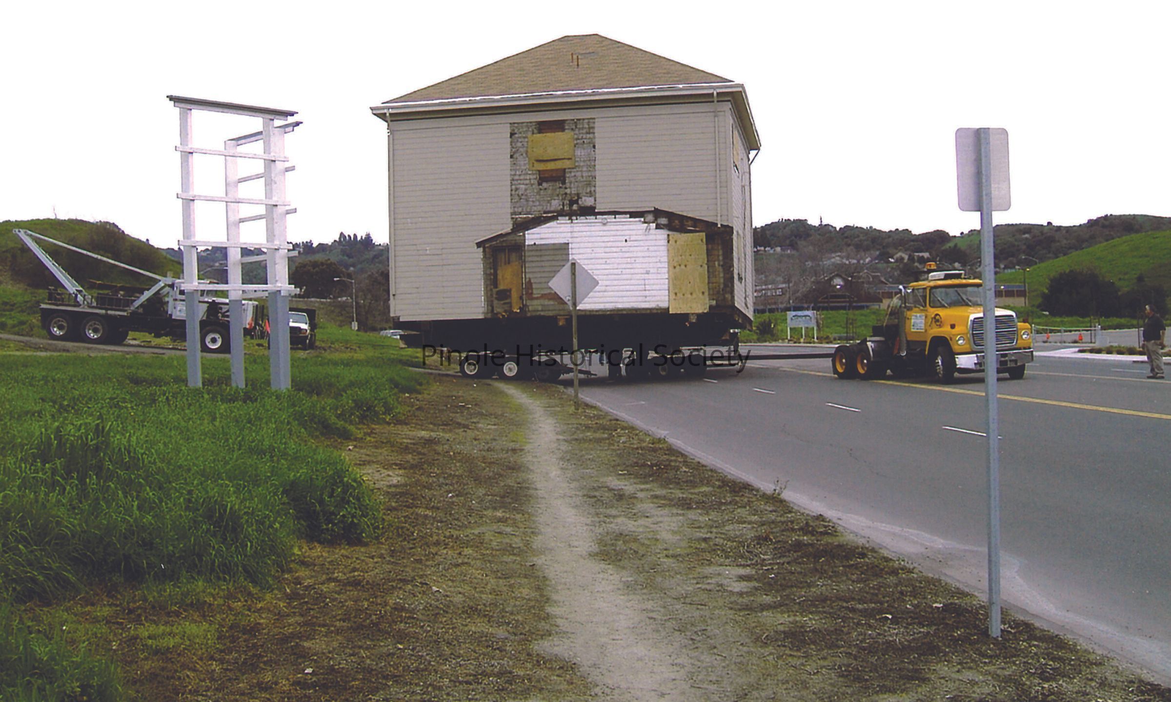 The move of the Faria House to downtown Pinole in 2005 was a citywide event that attracted numerous onlookers along its one-mile journey. Hoisted onto a flatbed truck, the 1880 home built for the son and daughter-in-law of Dr. Samuel J. Tennent inched its way north down Tennent Avenue before turning west on San Pablo Avenue, on the way to its new residence in Heritage Park. The vacant building, photographed by Larry Neptune, was recently painted, and the Pinole Garden Club tends to its rose bushes.Copyright