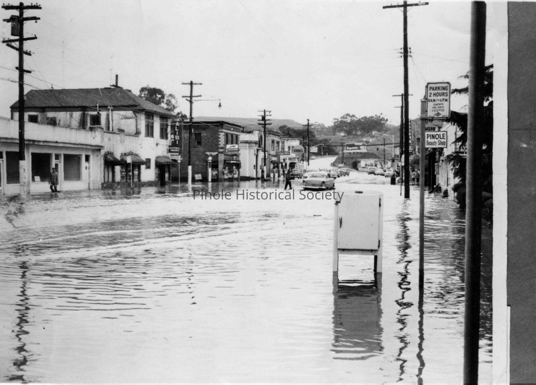 On April 2, 1958, after several days of hard rain, high tides contributed to the overflow of Pinole Creek, which flooded the downtown area. Boats tied up along Tennent Avenue so the Pinole Fire Department could rescue people from their flooded homes. Boats went up and down Tennent Avenue, which was like a river. Fernandez Park was under three feet of water. Children got on the bridge connecting Valley Avenue with Prune Street in makeshift rafts and “surfed” down the creek. In the 1960s the U.S. Army Corps of Engineers came to Pinole and widened, straightened, and deepened the creek. The corps took only three homes to realign the creek. Downtown Pinole has not flooded since.Copyright