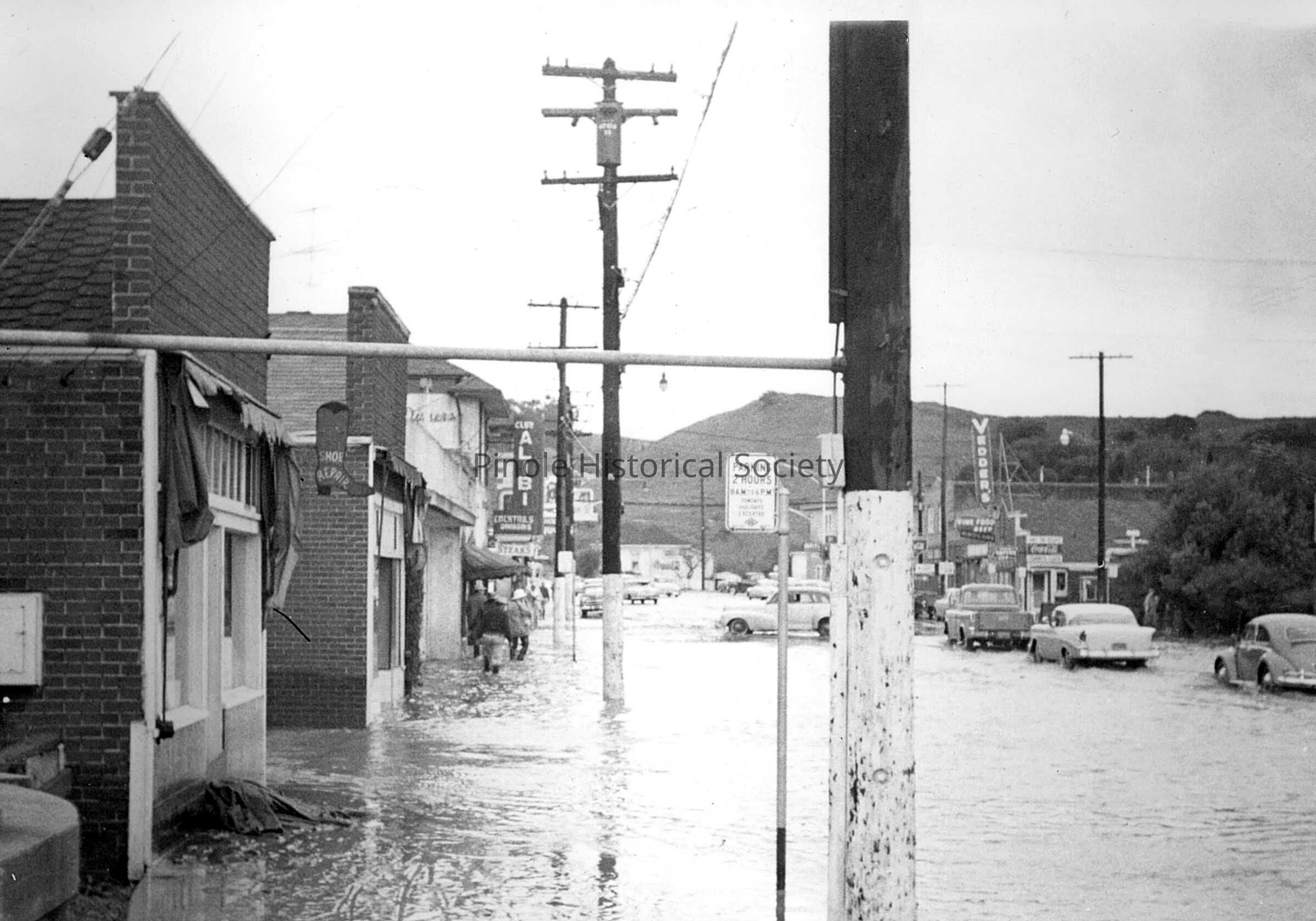 NORTH SIDE OF SAN PABLO AVENUE LOOKING WEST: The flood of 1958 produced many dramatic photos of downtown Pinole. Stores and homes were flooded, as were some cars that tried to navigate through the water. All of the buildings on the south side of San Pablo Avenue in the above photo are gone today. Vedder’s, a restaurant, and all of the businesses in the brick building at the northeast intersection of San Pablo and Tennent avenues, are also part of the city’s history. The Pinole United Methodist Church now sits atop Shale Hill.Copyright