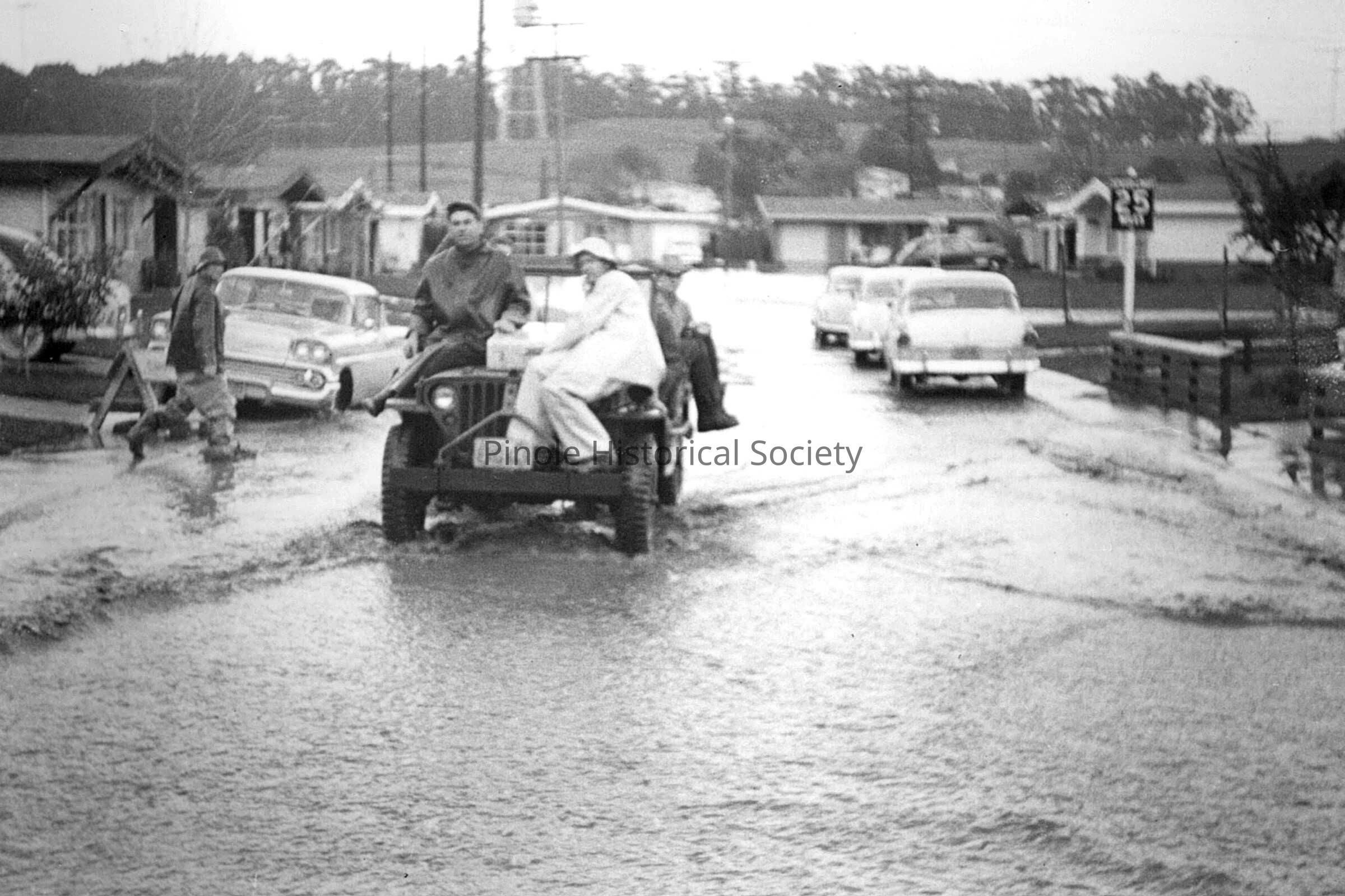 1958 FLOOD FROM LA SALLE DRIVE: Pinole Creek took a circuitous route on the way from its Alhambra Valley watershed to San Pablo Bay. Its hairpin turns and shallow depth created havoc for the city’s residents throughout the first 60 years of the 20th century. The 1916 Pinole Creek flood floated wooden sidewalks into the bay, and the 1940 flood left three feet of water downtown. The last of the Bernardo Fernandez warehouses are seen at the end of Tennent Avenue from the intersection of Tennent Avenue and La Salle Drive during the 1958 flood. A motor home storage yard occupies that space today.Copyright