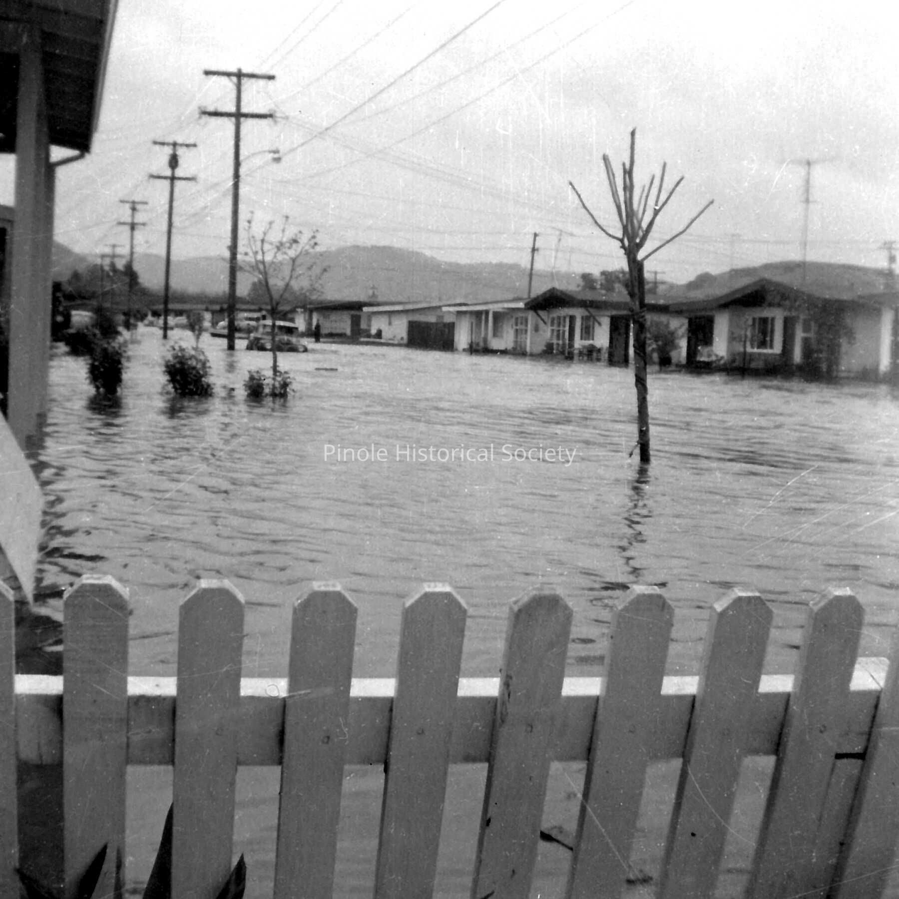 1958 FLOOD FROM 280 CALAIS DRIVE: Pinole Creek took a circuitous route on the way from its Alhambra Valley watershed to San Pablo Bay. Its hairpin turns and shallow depth created havoc for the city’s residents throughout the first 60 years of the 20th century. The 1916 Pinole Creek flood floated wooden sidewalks into the bay, and the 1940 flood left three feet of water downtown. The last of the Bernardo Fernandez warehouses are seen at the end of Tennent Avenue from the intersection of Tennent Avenue and LaSalle Drive during the 1958 flood. A motor home storage yard occupies that space today.Copyright