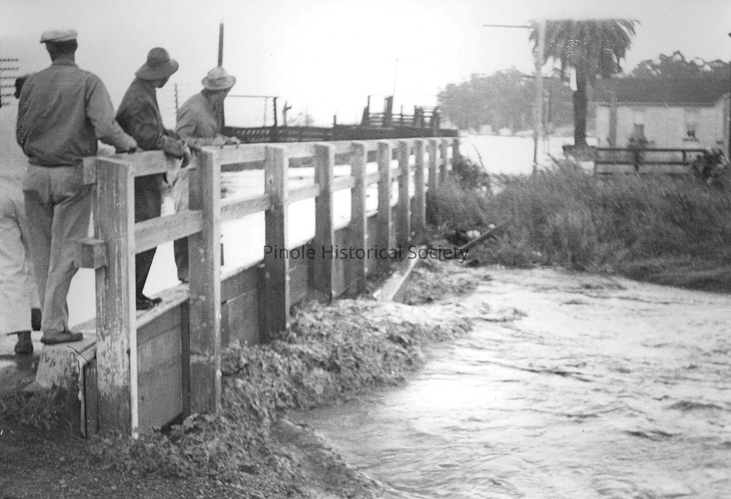Flood of 1958, mouth of Pinole Creek: On April 2, 1958, after several days of hard rain, high tides contributed to the overflow of Pinole Creek, which flooded the downtown area. Boats tied up along Tennent Avenue so the fire department could rescue people from their flooded homes. Boats went up and down Tennent Avenue, which was like a river. Fernandez Park was under three feet of water. Children got on the bridge connecting Valley Avenue with Prune Street in makeshift rafts and “surfed” down the creek. The flood almost wiped out the Railroad Avenue Bridge. In the 1960s, the U.S. Army Corps of Engineers widened, straightened, and deepened the creek. Downtown Pinole has not flooded since.Copyright