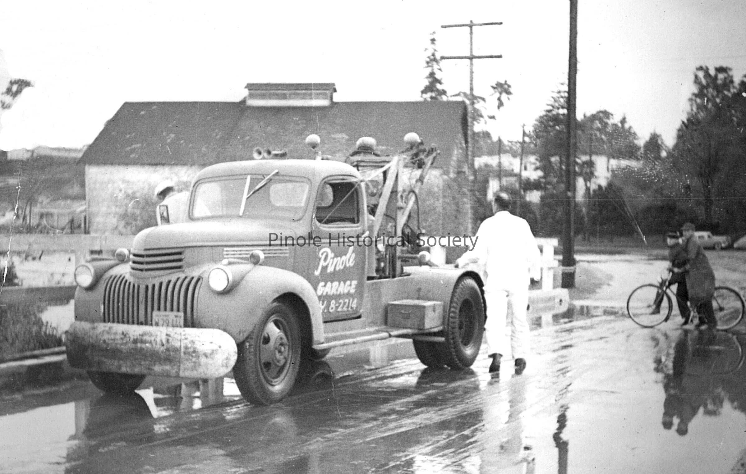 Flood of 1958, mouth of Pinole Creek: On April 2, 1958, after several days of hard rain, high tides contributed to the overflow of Pinole Creek, which flooded the downtown area. Boats tied up along Tennent Avenue so the fire department could rescue people from their flooded homes. Boats went up and down Tennent Avenue, which was like a river. Fernandez Park was under three feet of water. Children got on the bridge connecting Valley Avenue with Prune Street in makeshift rafts and “surfed” down the creek. The flood almost wiped out the Railroad Avenue Bridge. In the 1960s, the U.S. Army Corps of Engineers widened, straightened, and deepened the creek. Downtown Pinole has not flooded since.Copyright