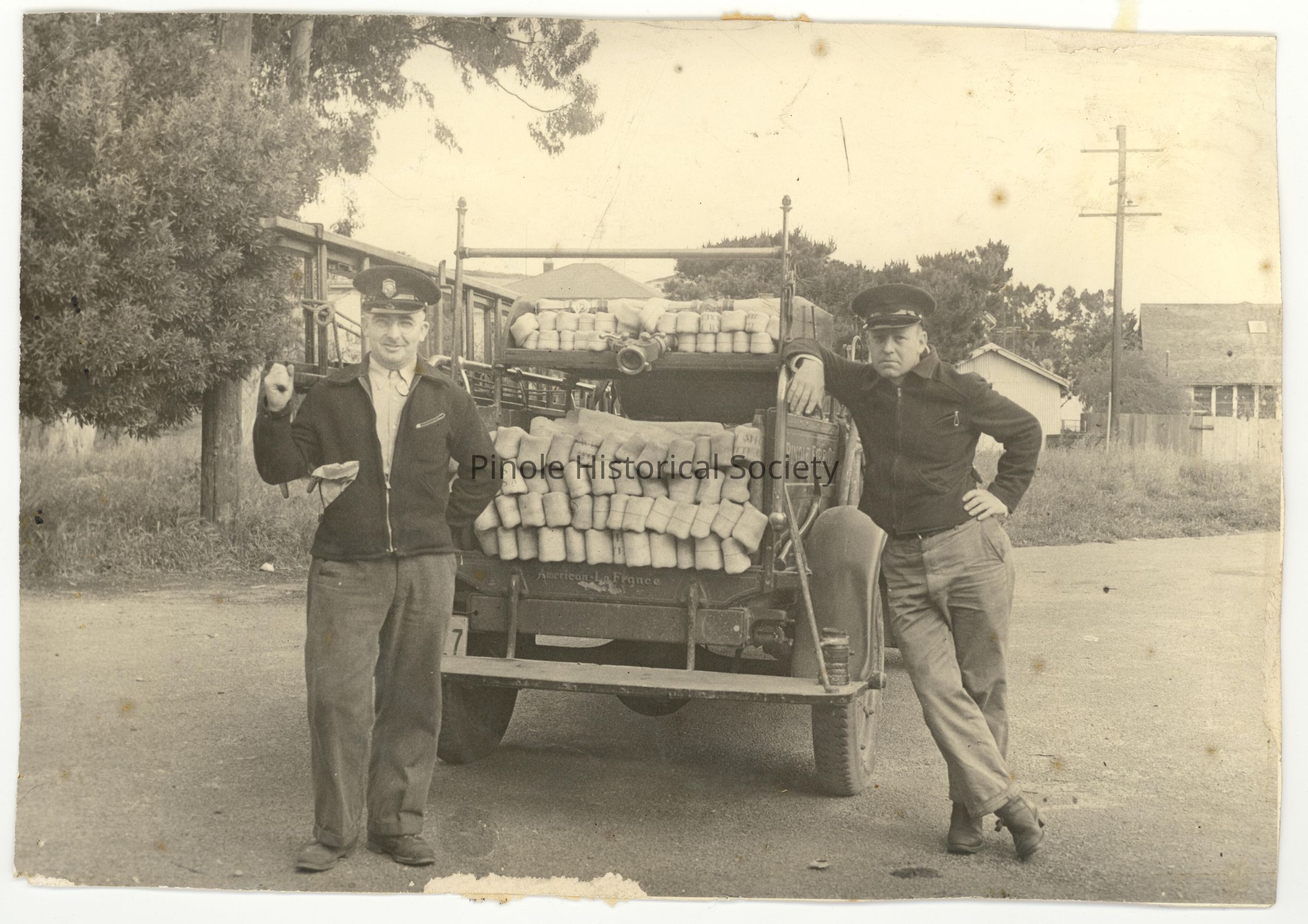 George Hodgskins (L) Carl Fausset (R) Pinole’s First Engine. This 1921 American La France engine was Pinole’s first. George Hodgkins Sr. (left) and Carl Fawcett are the firefighters in this photo, taken in the late 1930s or early 1940s. The red light from this engine is on the front of downtown Station 73, over the center-engine bay door.Made/Created