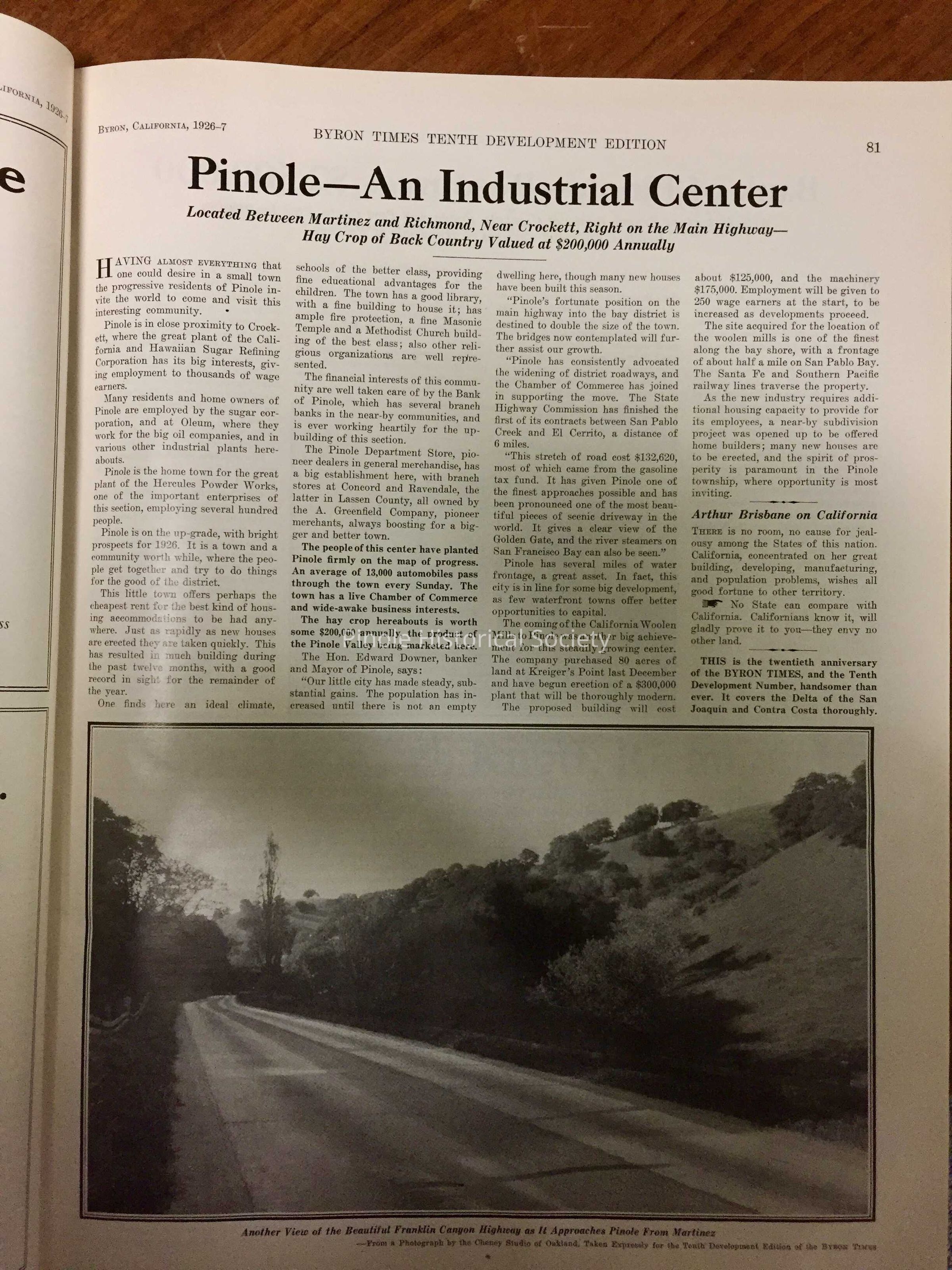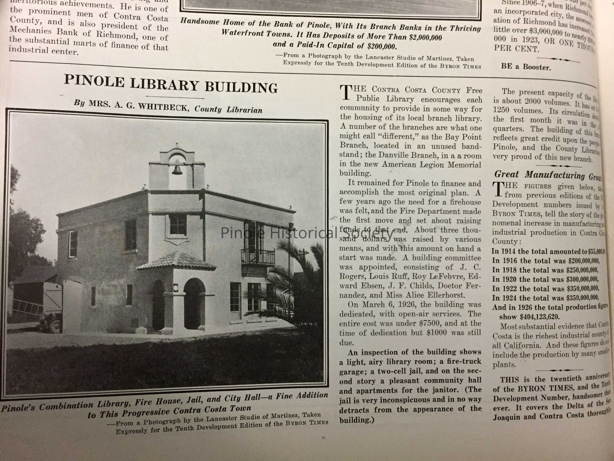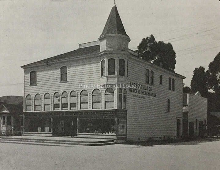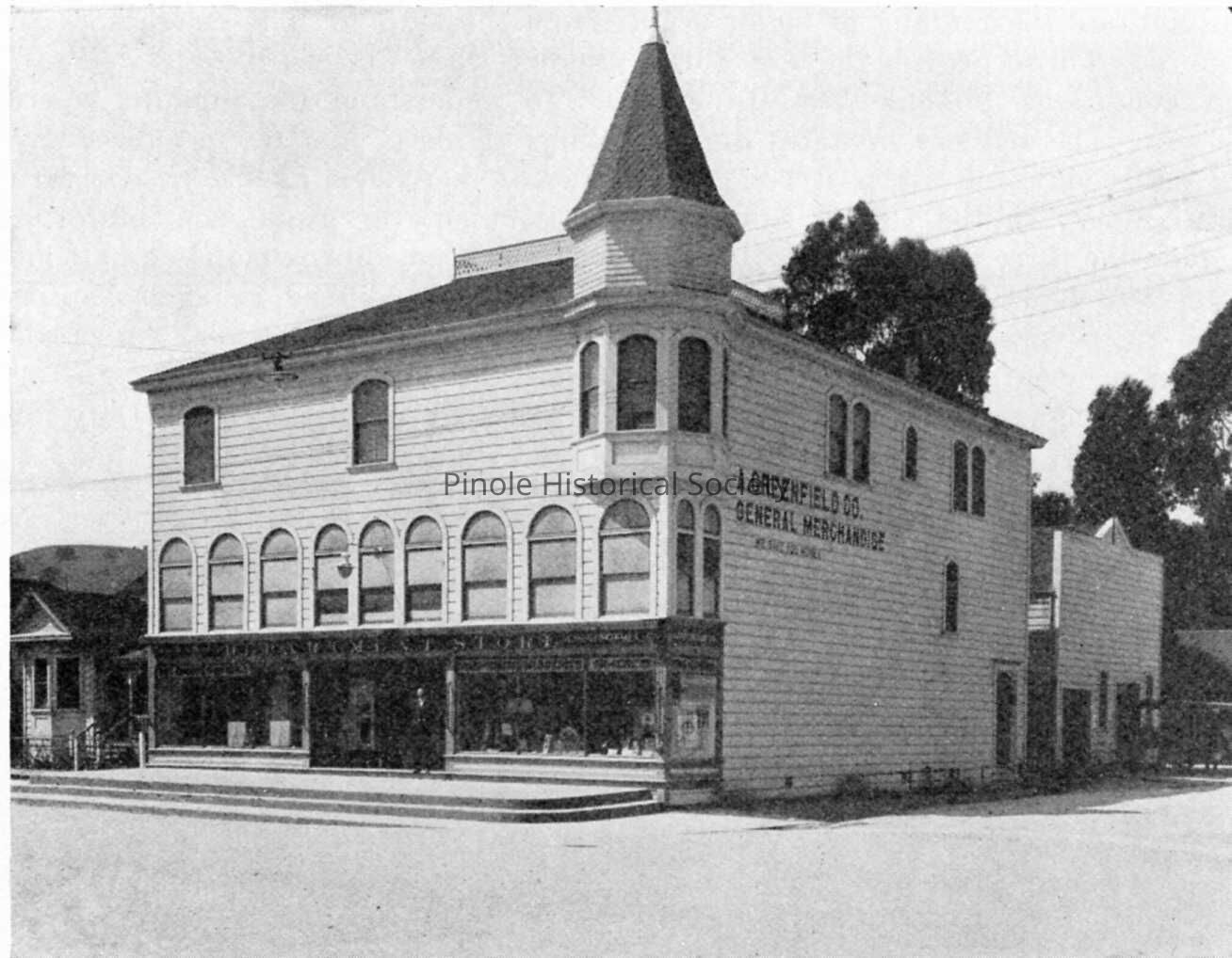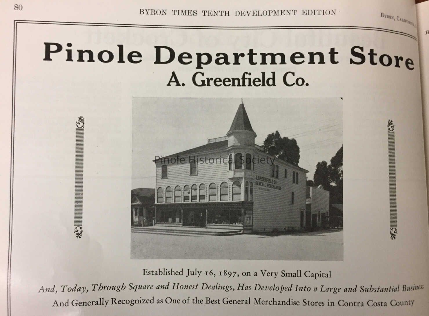 GREENFIELD’S DEPARTMENT STORE: In 1905, Pinole merchant Abraham Greenfield built a large, three-story building with a cupola and a skylight on Pear Street, across from St. Joseph’s Church, and called it the “Big Department Store.” Greenfield sold everything one would need without having to go out of town — hardware, furniture, groceries, notions, liquor, tobaccos, kerosene, farming tools, clothing, shoes and candies. The Greenfield building and business was a downtown landmark for many years. In the 1930s, Mr. and Mrs. Greenfield and daughter, Rosalie, moved to San Francisco. New owners removed the third story of the building. In the 1950s, the building was purchased and remodeled by locals Alex Clark and Bob Dutra. Many Fiesta del Pinole parades passed by it.Copyright