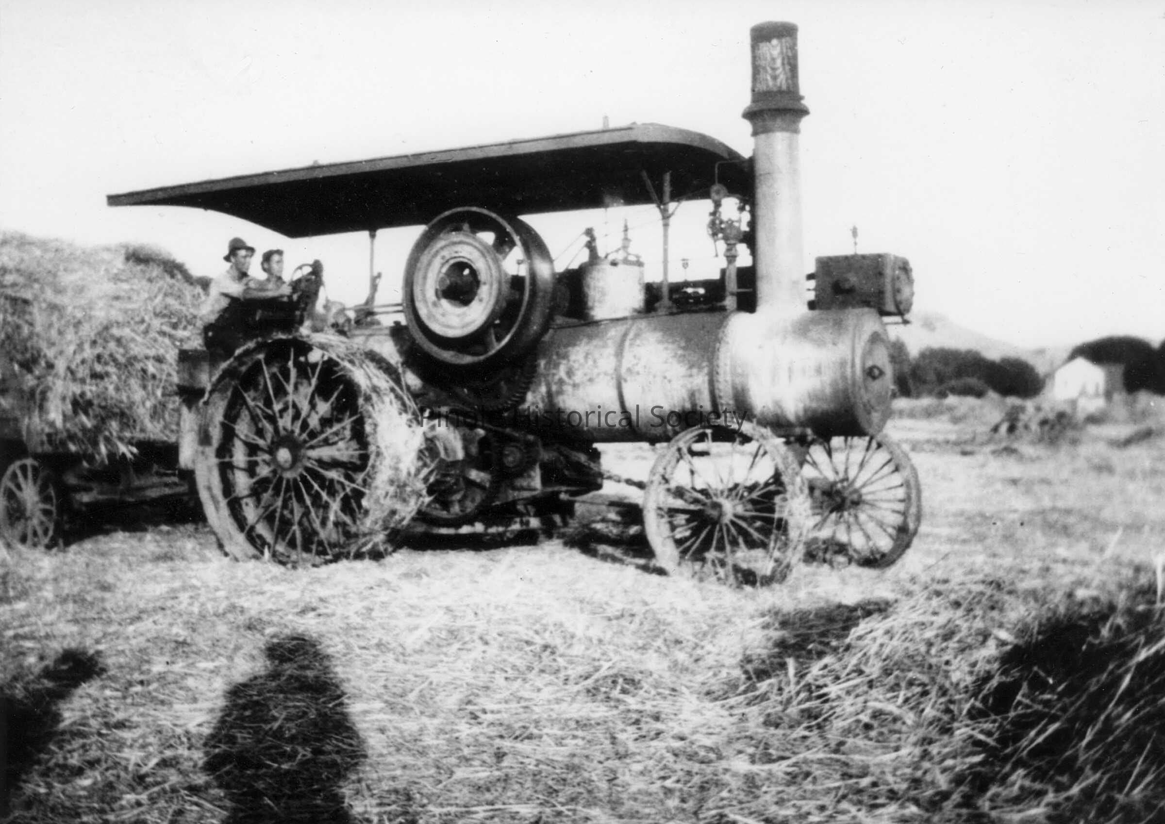 This photo shows an Amend Hay Press crew at work. Ranchers in the Pinole Valley would press hay into 250-pound bales by horse-powered presses and store them during the winter in Bernardo Fernandez’s large warehouses near San Pablo Bay. They hoped to sell the hay for a profit the following winter, as it took many tons of hay to feed the horses used by farmers and construction companies.