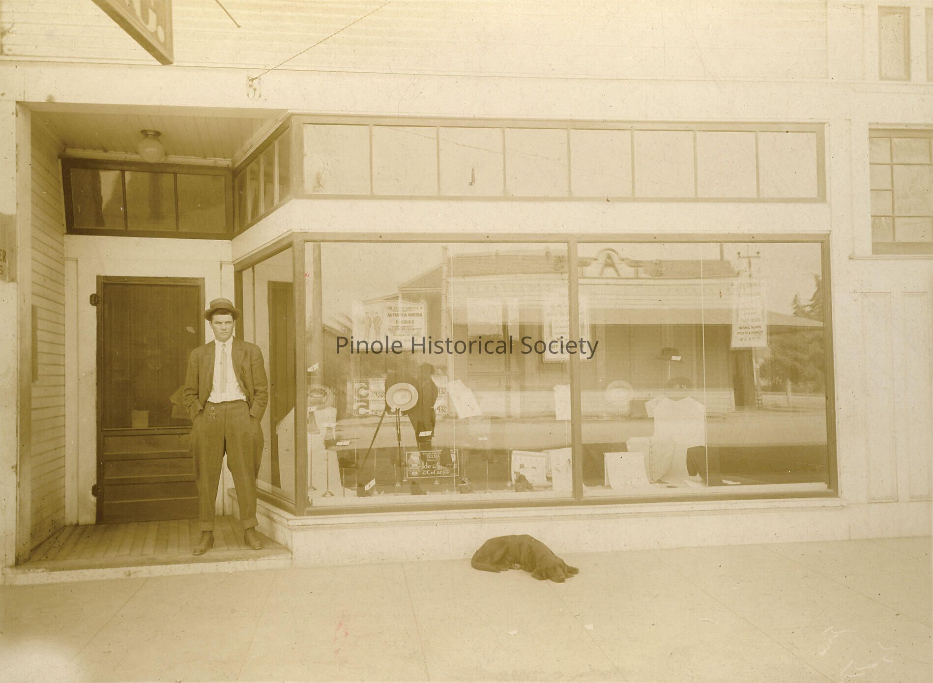 Henry Naylor, in front of Pinole Haberdashery, owned by James A. Silvas, uncle of Tessie Baldwin Curran. The store was on Tennent Avenue, next to the saloon operated by Silvas within the Golden West Hotel. It was torn down to build a Standard Oil Station, now Ye Old Pump House, which was originally the lubrication center for the gasoline station. (Bill McMaster). Henry Naylor was the adopted son of Cipriano Silvas and ran the haberdashery on the first floor of the hotel, next to Jimmy Silvas's bar. Henry Naylor was married to Ada Percival.Copyright