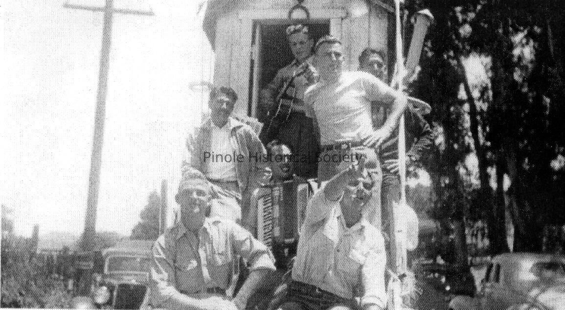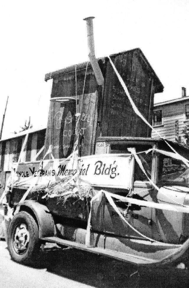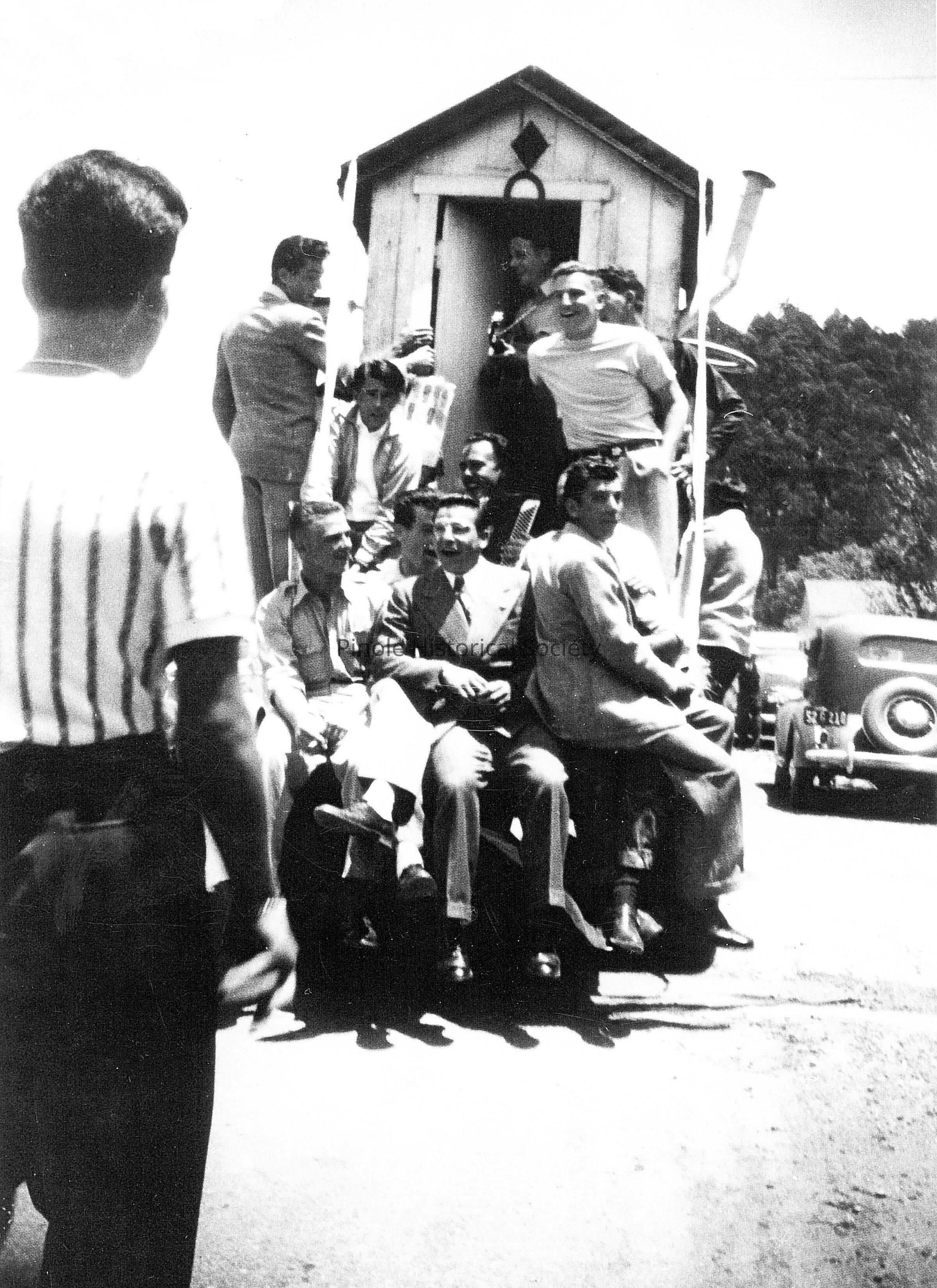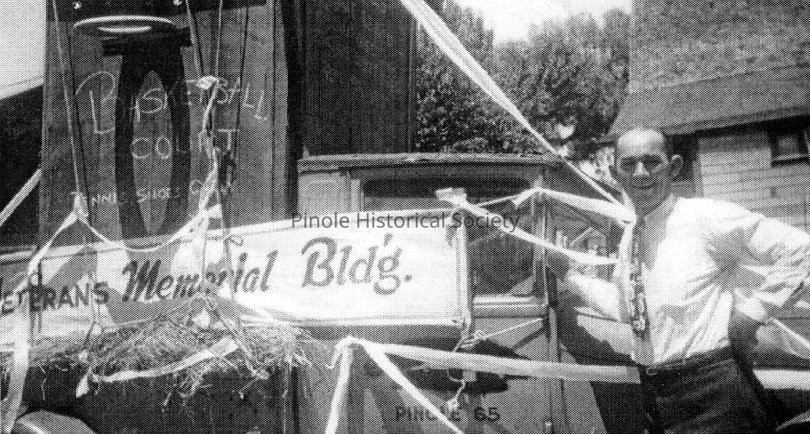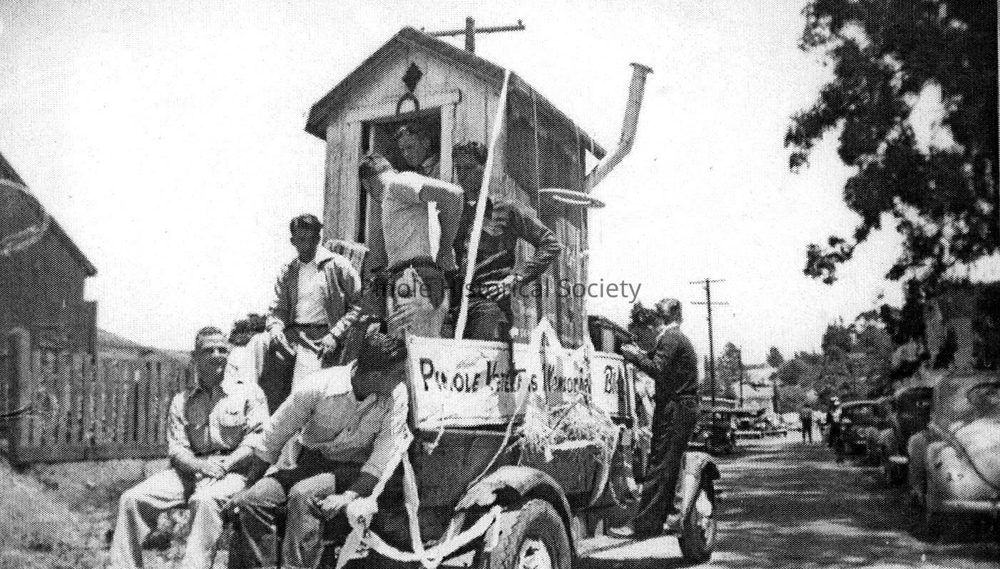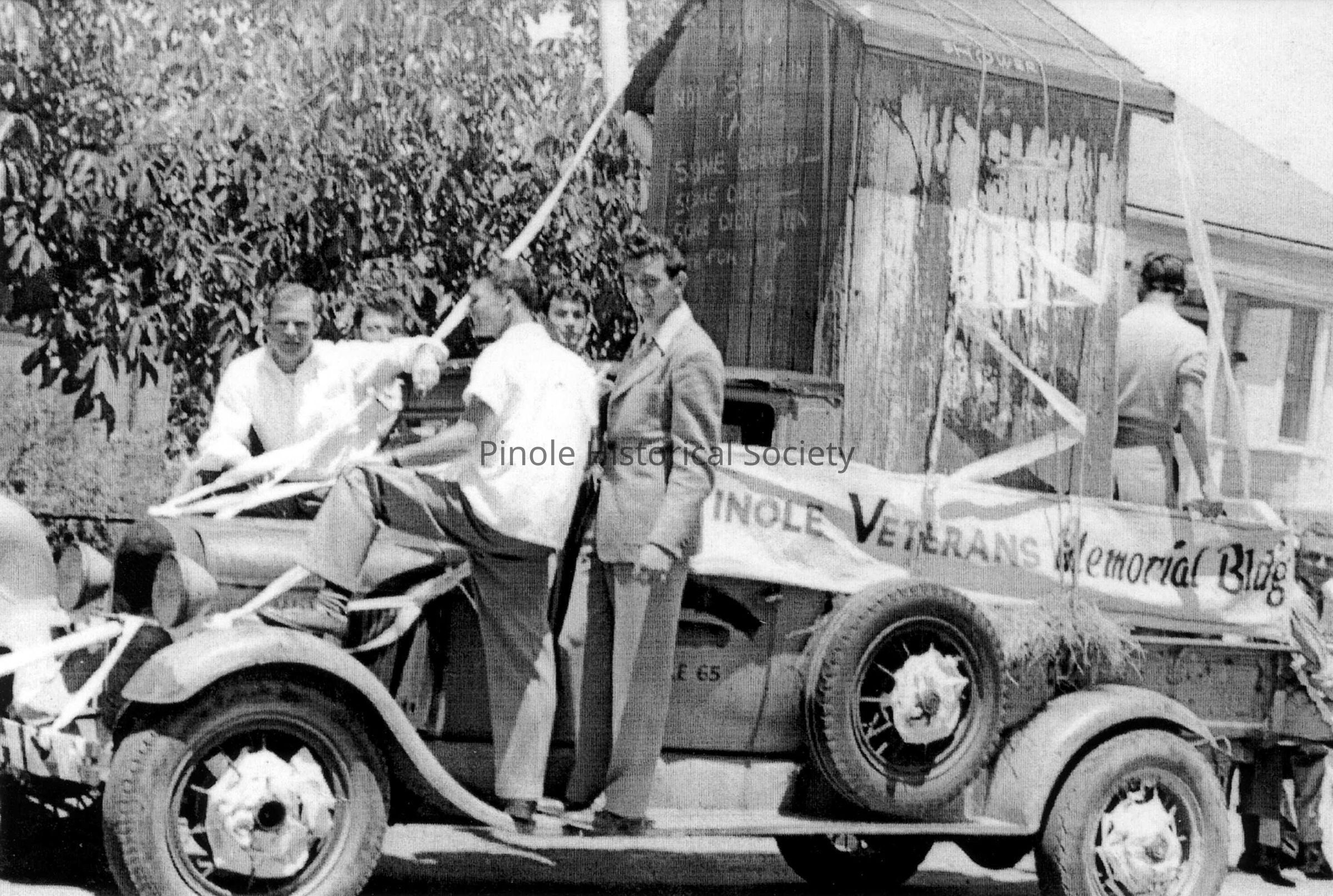 Veterans’ Memorial Protest. In 1946, a group of Pinole World War II veterans requested that the city build a war memorial honoring those who had served and died. There was a hotly contested city council vote. It did not pass. The veterans wanted to have a protest float in the Holy Ghost Parade, but were turned down by parade organizers. Bee Hansen and Ed Moellman got an outhouse, put it on the back of a pick-up truck, and snuck the truck into the parade. The float was their protest statement to the city council. On the truck are Ed LeFebvre (far left), Clarence Faria (head, fourth from left), Paul Mello (suit).Copyright
