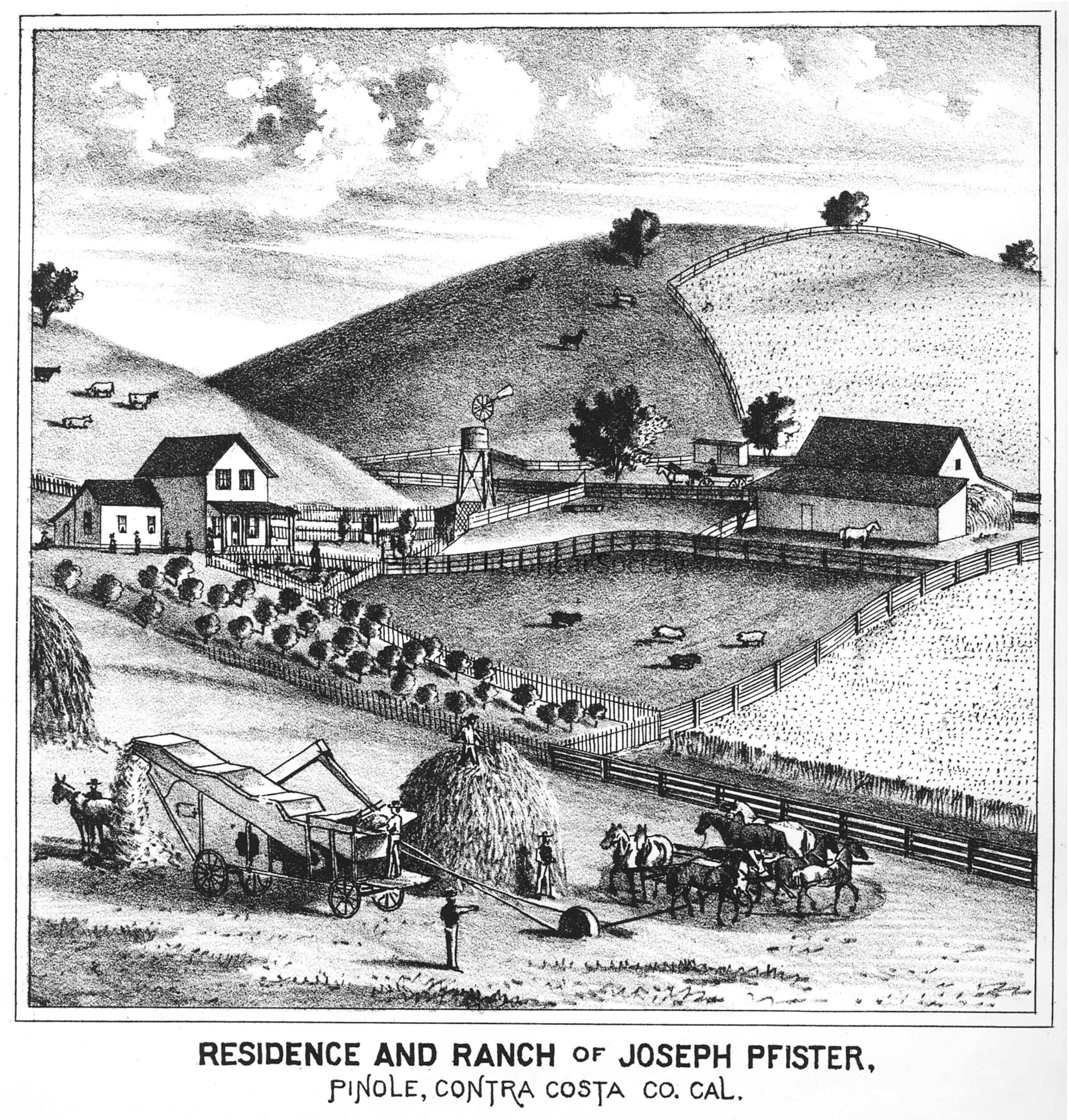Joseph Pfister Ranch, 1870s. It was a large ranch that took in the dirt road called First Avenue (now Appian Way) and San Pablo Avenue, running south to the present EBMUD reservoir near the former Doctors Hospital. In the 1860s and 1870s, central Pinole was surrounded by farms and ranches.Copyright