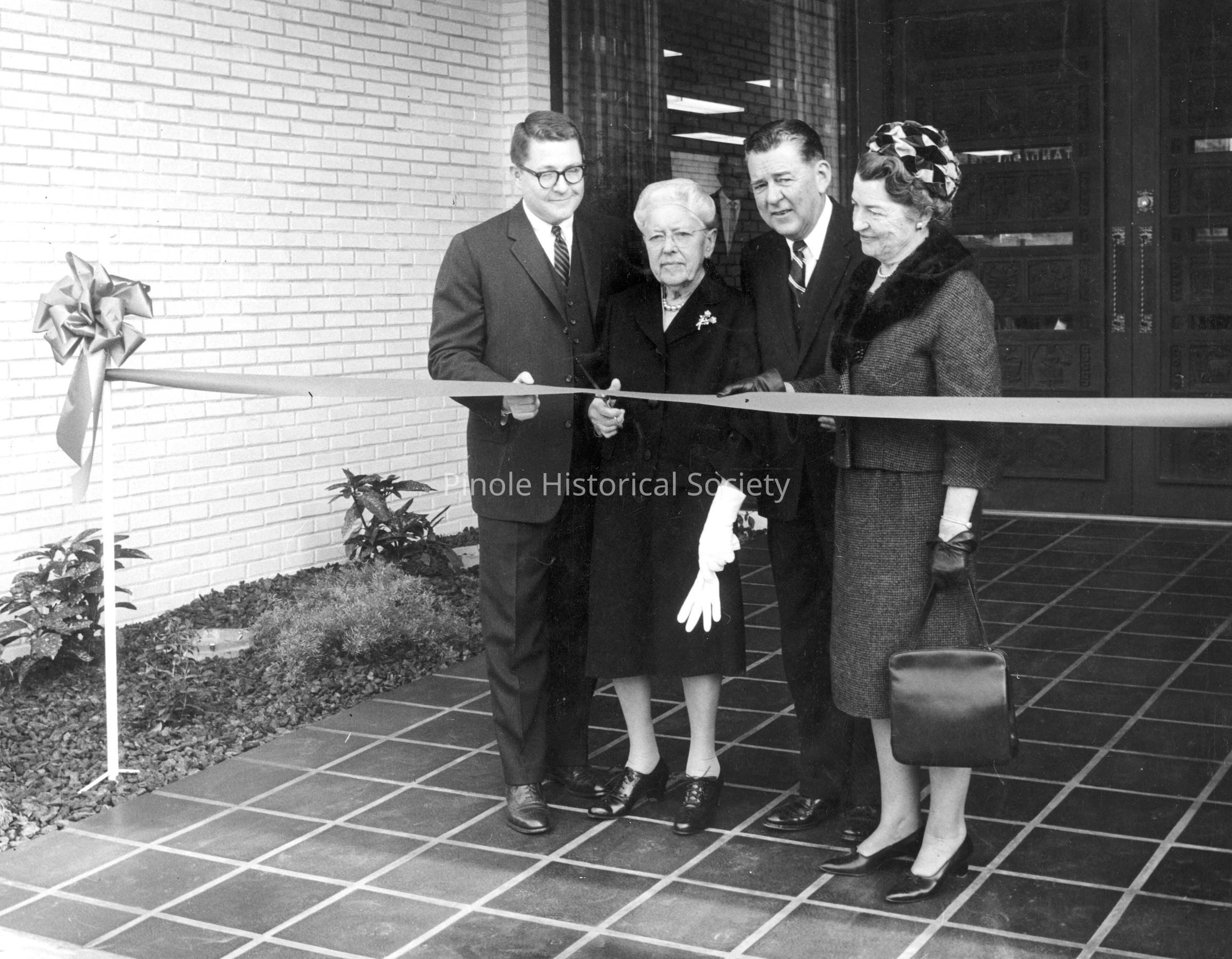 On January 3, 1966, Frances Ellerhorst (second from left) cut the ribbon to open the downtown Pinole office of Mechanics Bank. Also in the photo are (L-R): Edward M. Downer III, Edward M. Downer Jr., and Hazel Downer Thornton.Copyright