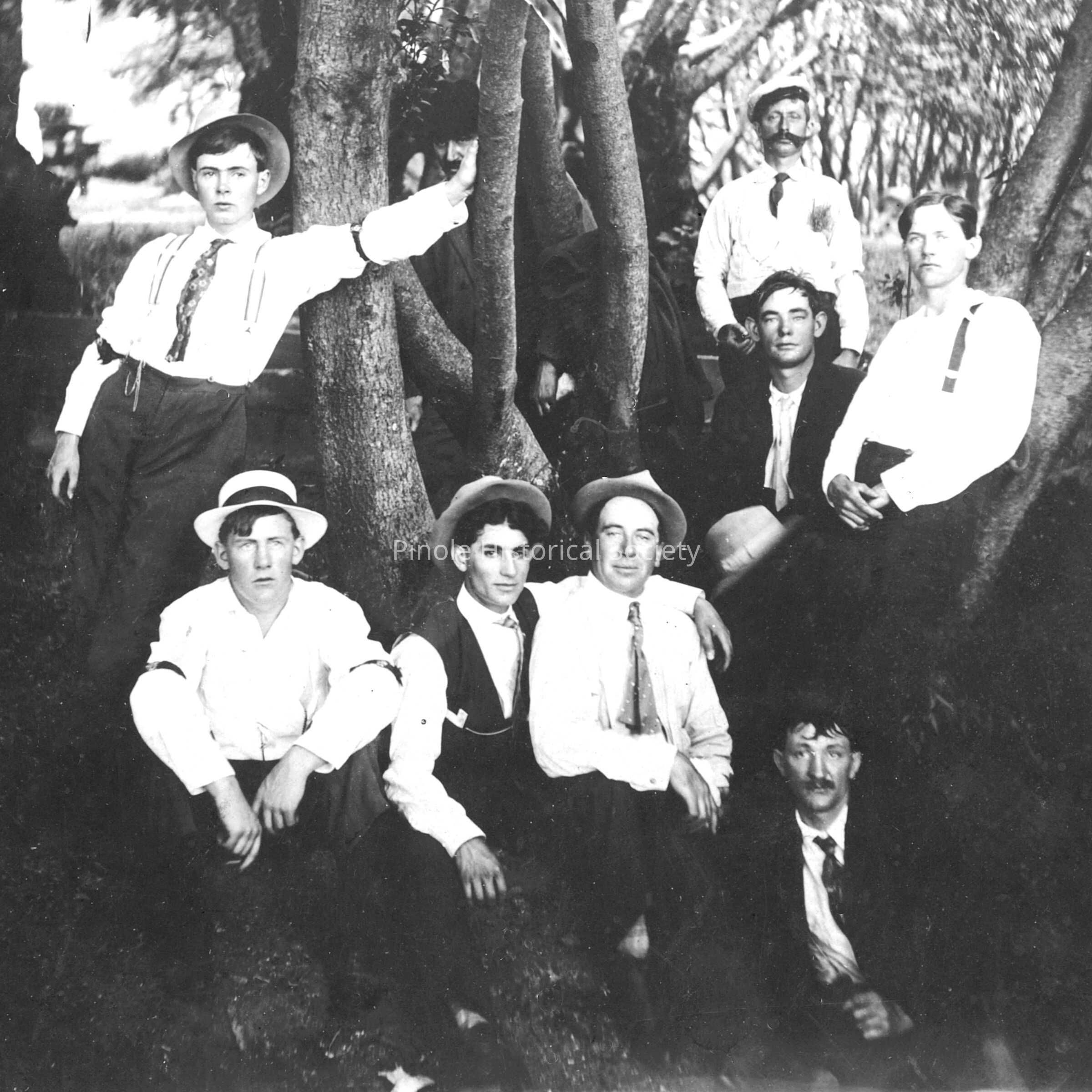 Harold Bennett (grandfather of Marilyn Bennett Ponting) is young man at far right wearing suspenders. Donated by granddaughter Marilyn Bennett Ponting 1975.Copyright