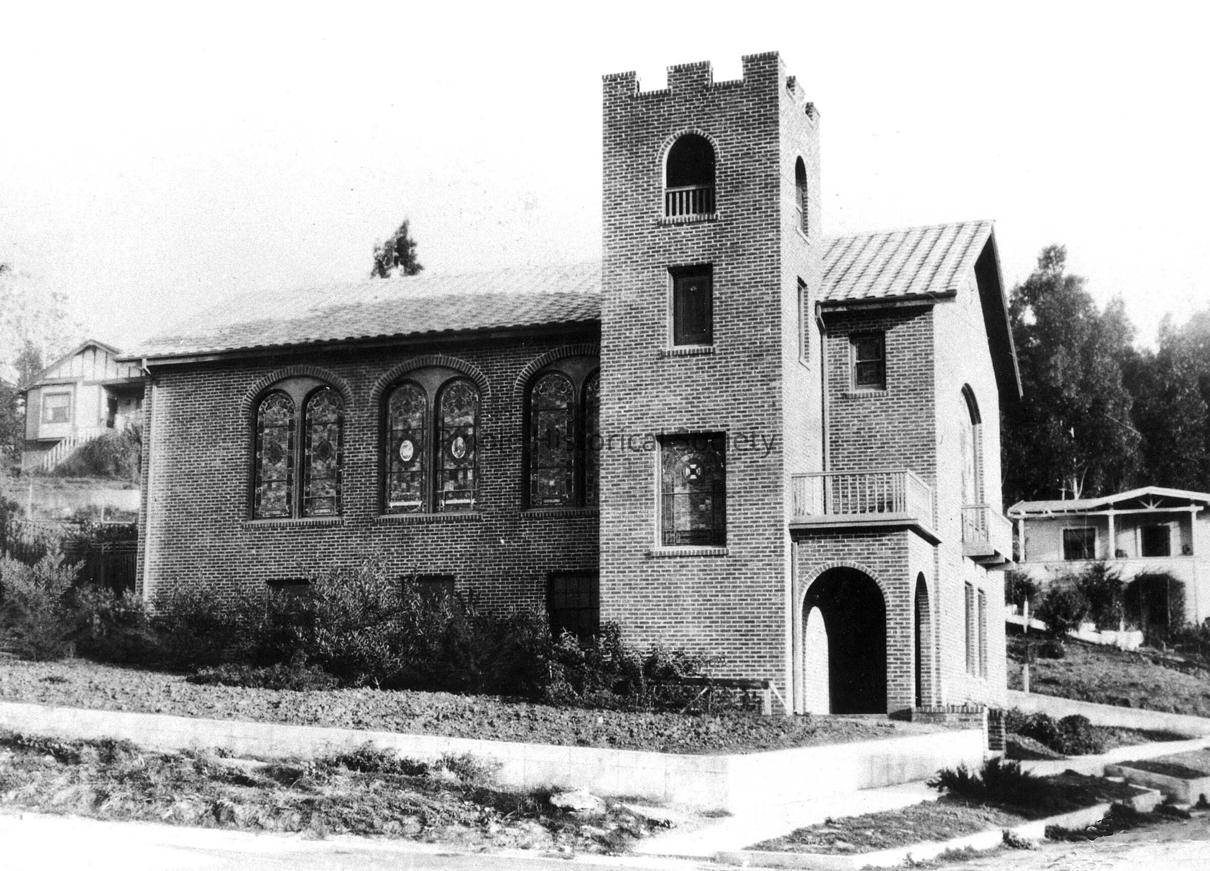 METHODIST EPISCOPAL CHURCH/CHURCH OF CHRIST: Meetings of the Pinole-Hercules Methodist Episcopal Church were held in Pinole’s schoolhouse on the city plaza when it was organized in 1890. The church built its own building on San Pablo Avenue, near School Street, in 1898, an A-frame structure that is still in use. The second Methodist Episcopal Church on Valley Avenue, a modern brick building, was built in 1925, and dedicated to the memory of Elizabeth Downer, an impassioned volunteer in the church for many years and the wife of Bank of Pinole founder E.M. Downer Sr. This Valley Avenue church is now the home of the Church of Christ.Copyright