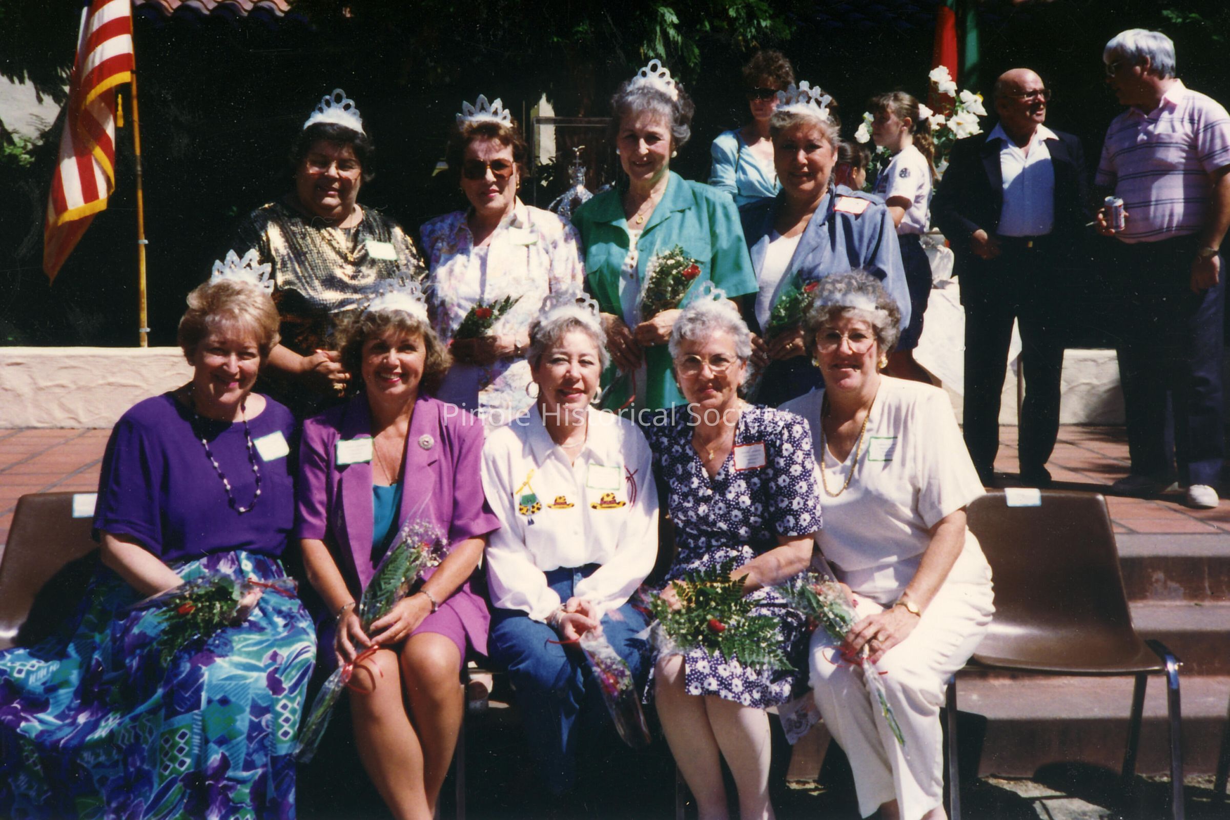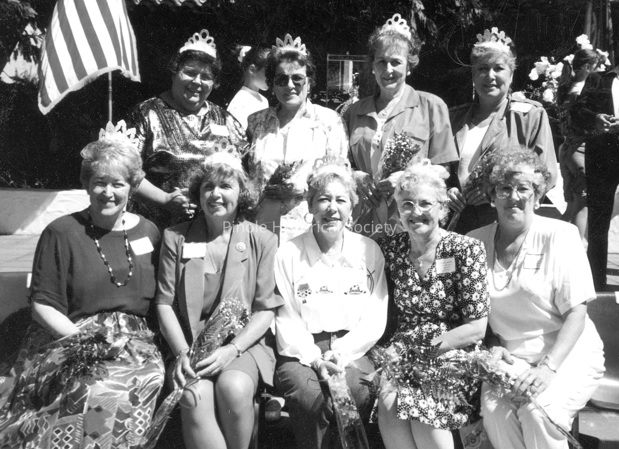 Former Holy Ghost Queens gather at a 1994 Holy Ghost reunion at San Pablo’s Alvarado Square. They are, from left to right (sitting) Marcia Marcos, Carol Costa, Deanna Faria, Jeri Nunes, and Margaret Faria; (standing) Mary Ann Pavon, Celeste Freitas, Laverne Nunes, Dolores Faria.Copyright