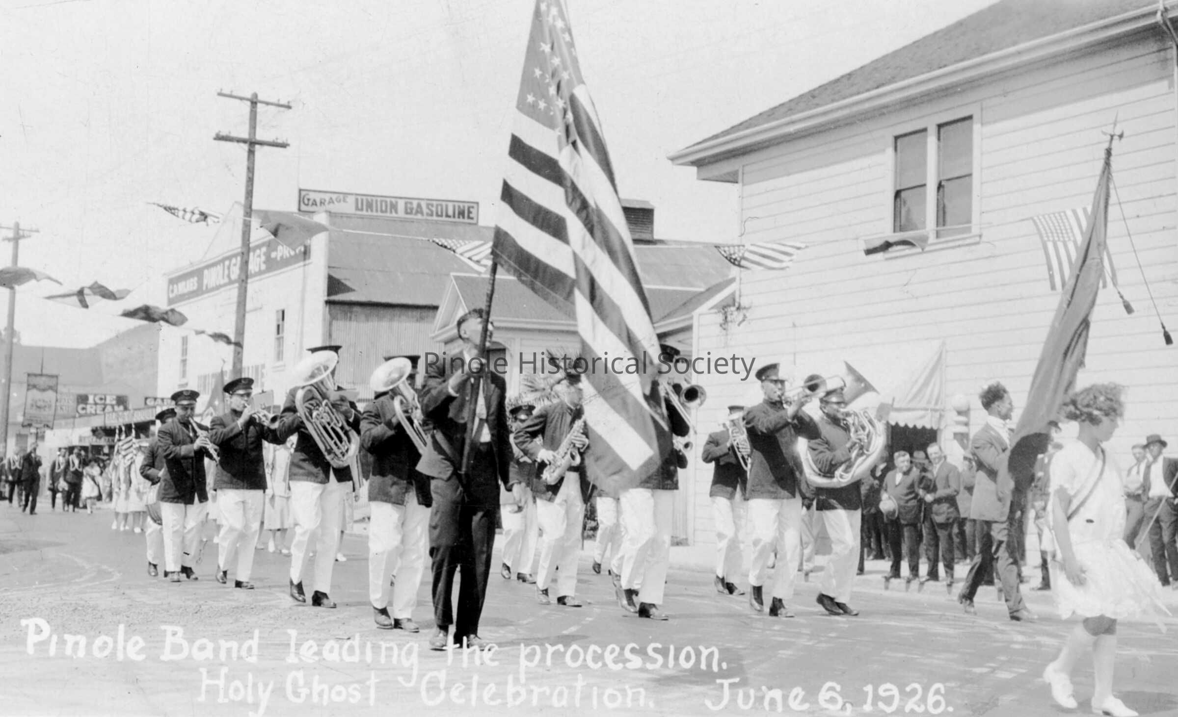 Pinole Band leading the procession. Holy Ghost Celebration June 26, 1926.Copyright