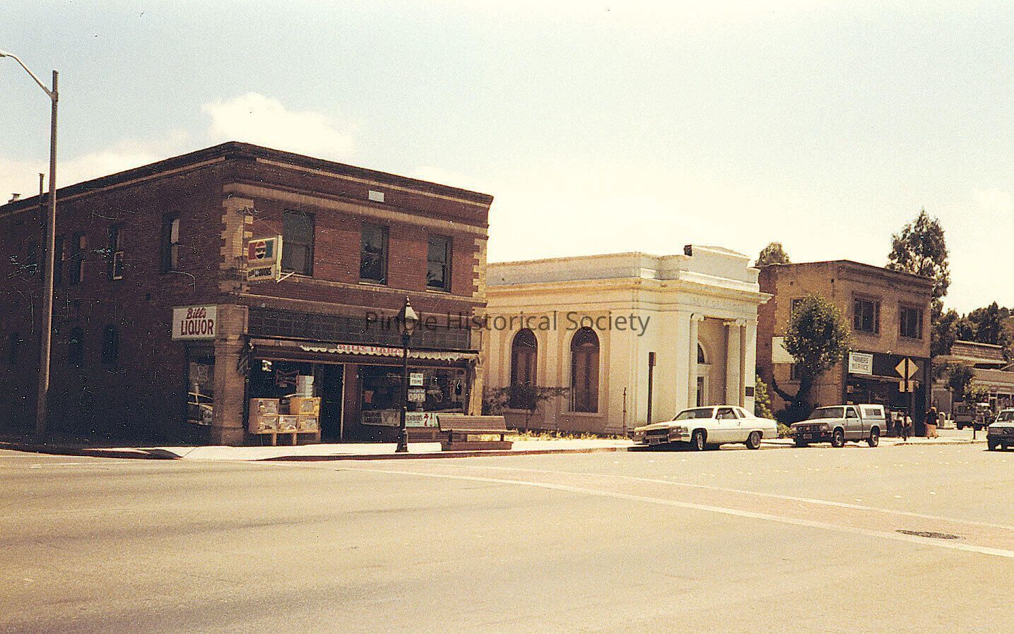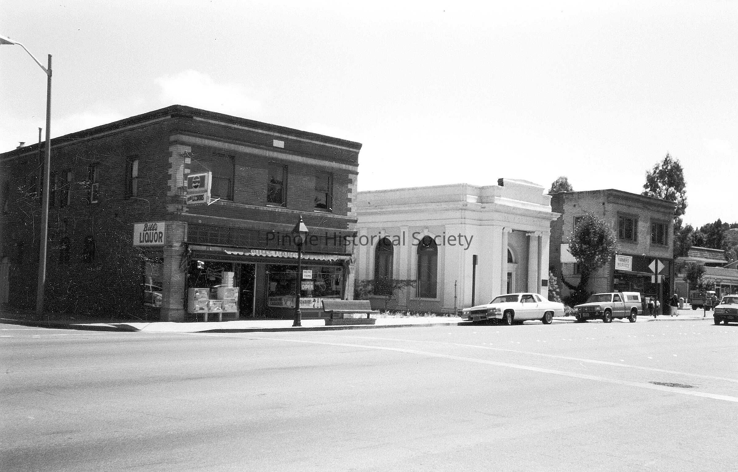 SOUTH SIDE OF SAN PABLO AVENUE LOOKING WEST: The Ruff Building, Bank of Pinole, and Downer Building were a focal point of the city’s downtown for decades, until the 1989 Loma Prieta earthquake severely damaged the two brick buildings, which were subsequently demolished. The Bank of Pinole survived the quake and is commemorating its 100th anniversary in 2015. Bill’s Liquor bought the Ruff Building from proprietor Mel Marcos (who succeeded Louis Ruff in the grocery store), and a Farmers Insurance agency eventually replaced Greenstein’s Pharmacy in the Downer Building, which housed the offices of longtime Pinole physician Manuel Fernandez on the second floor. The Pear Street Bistro was built on the lot where the Ruff Building once stood.