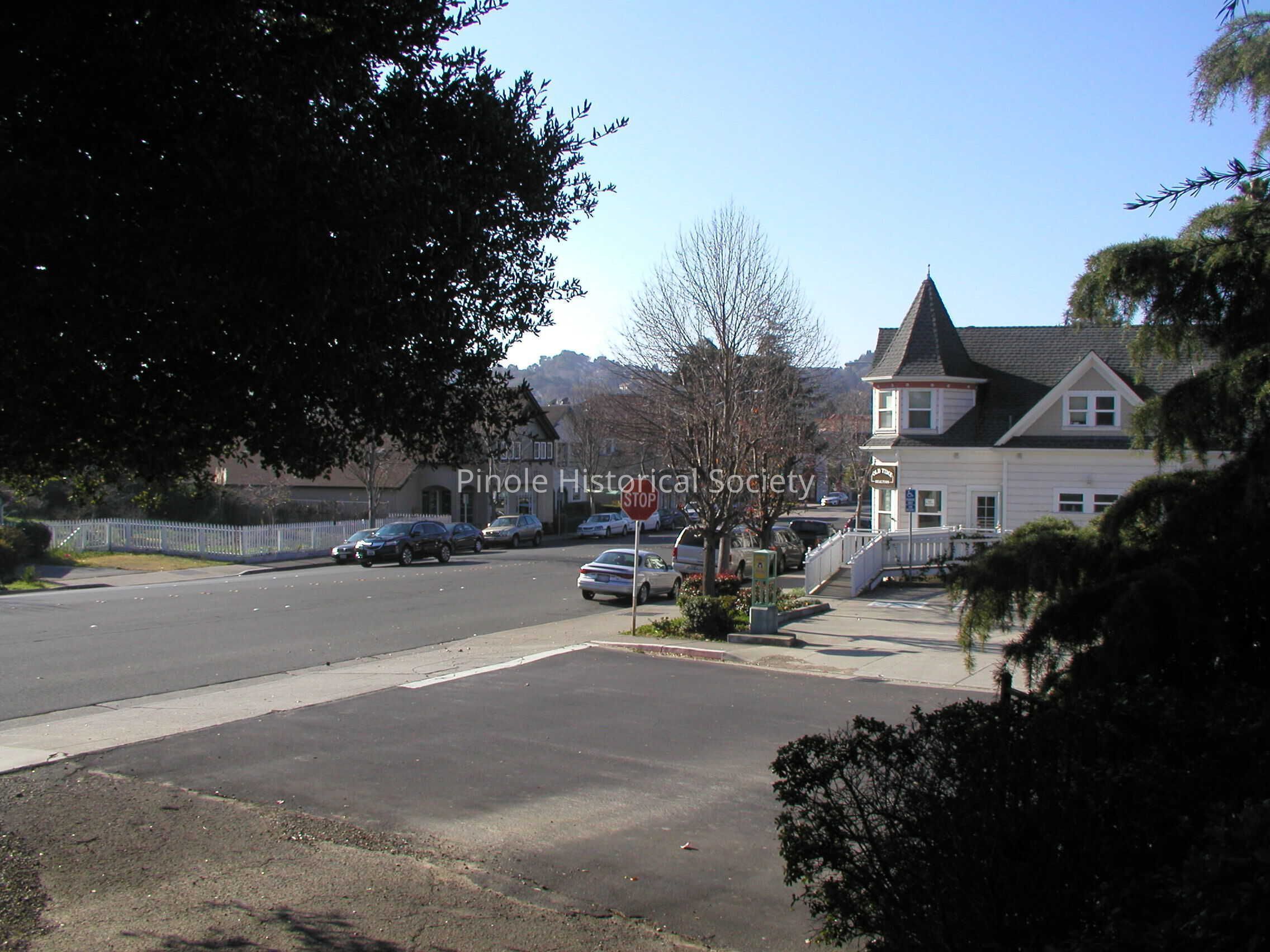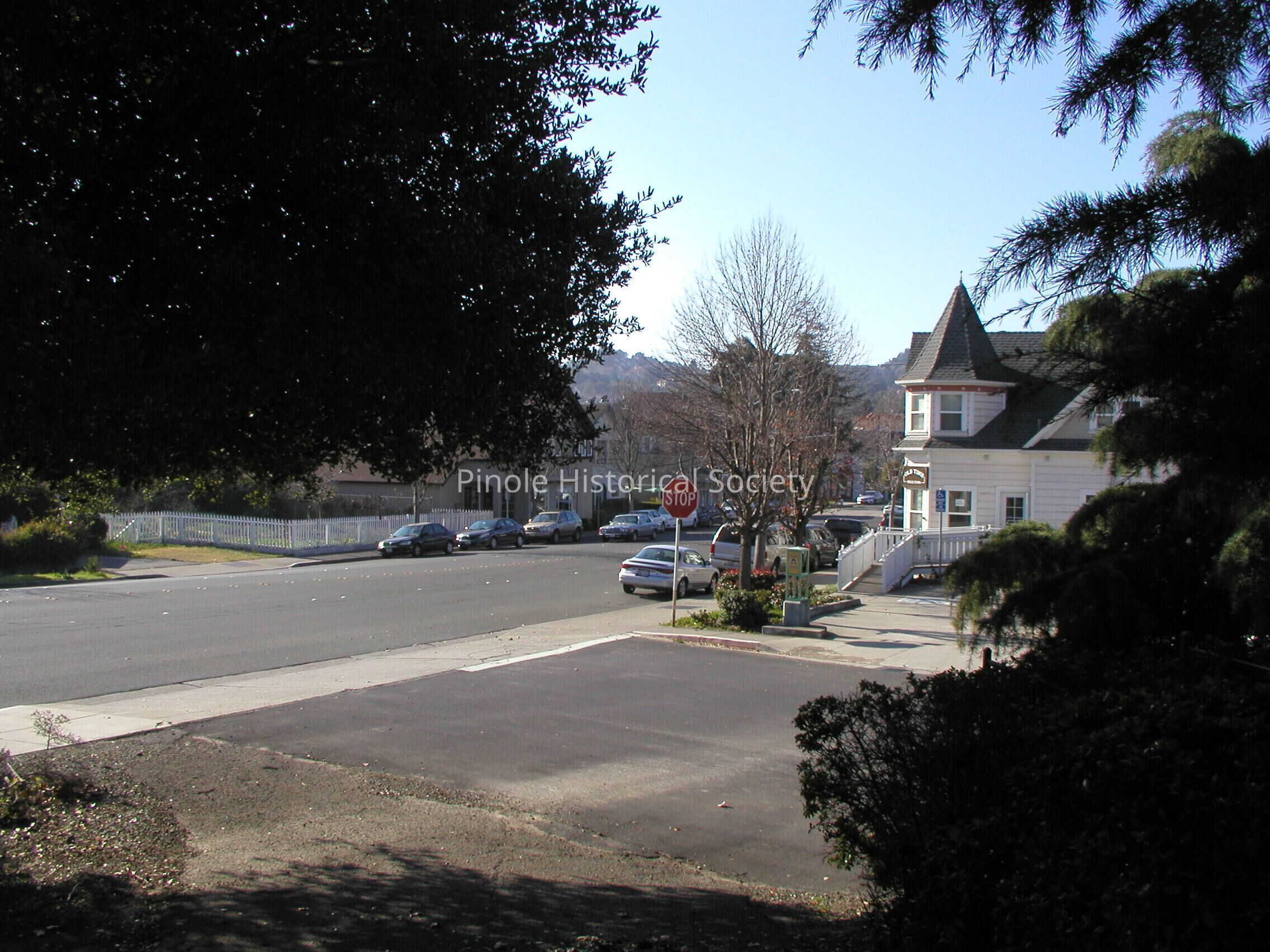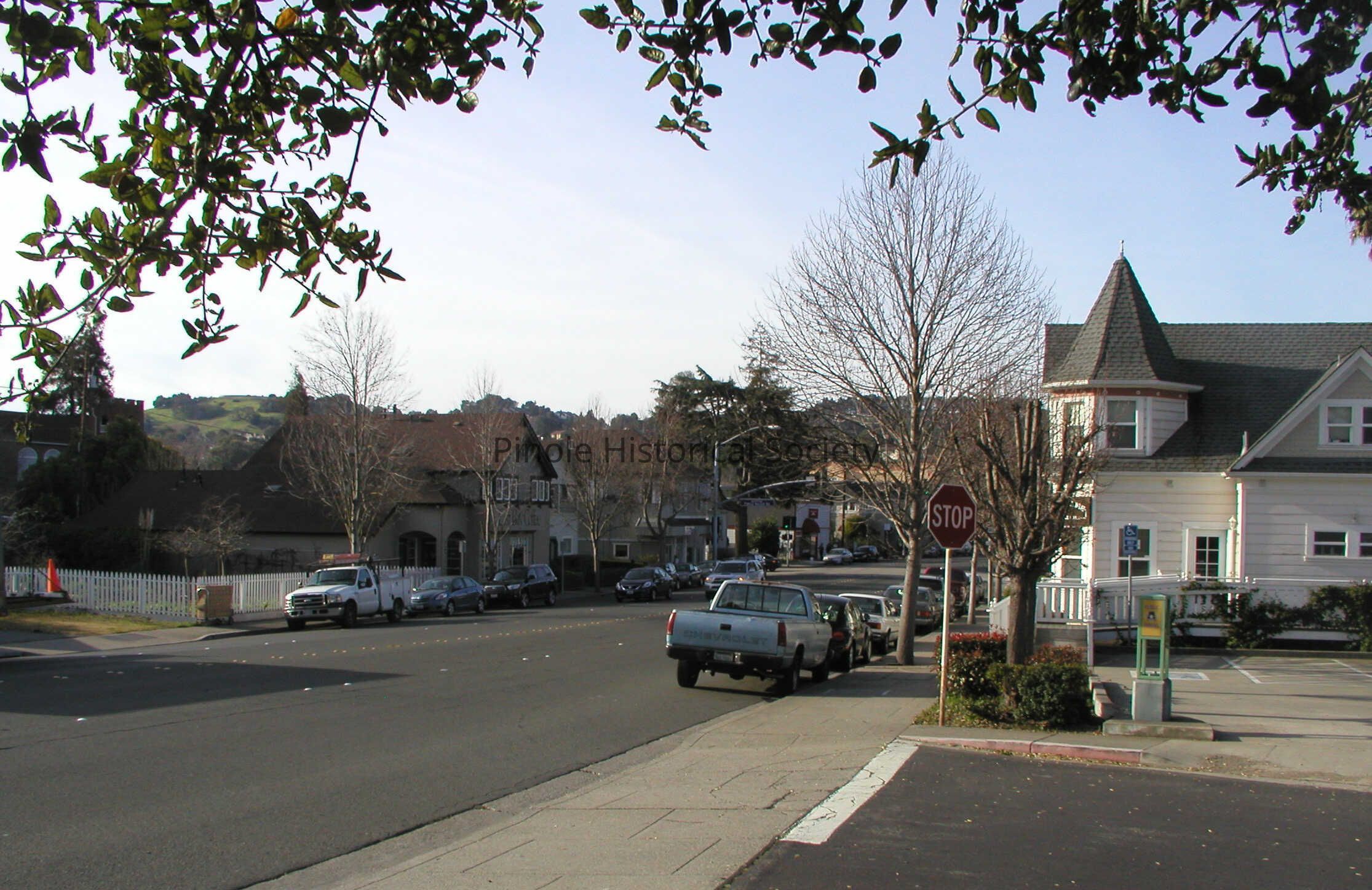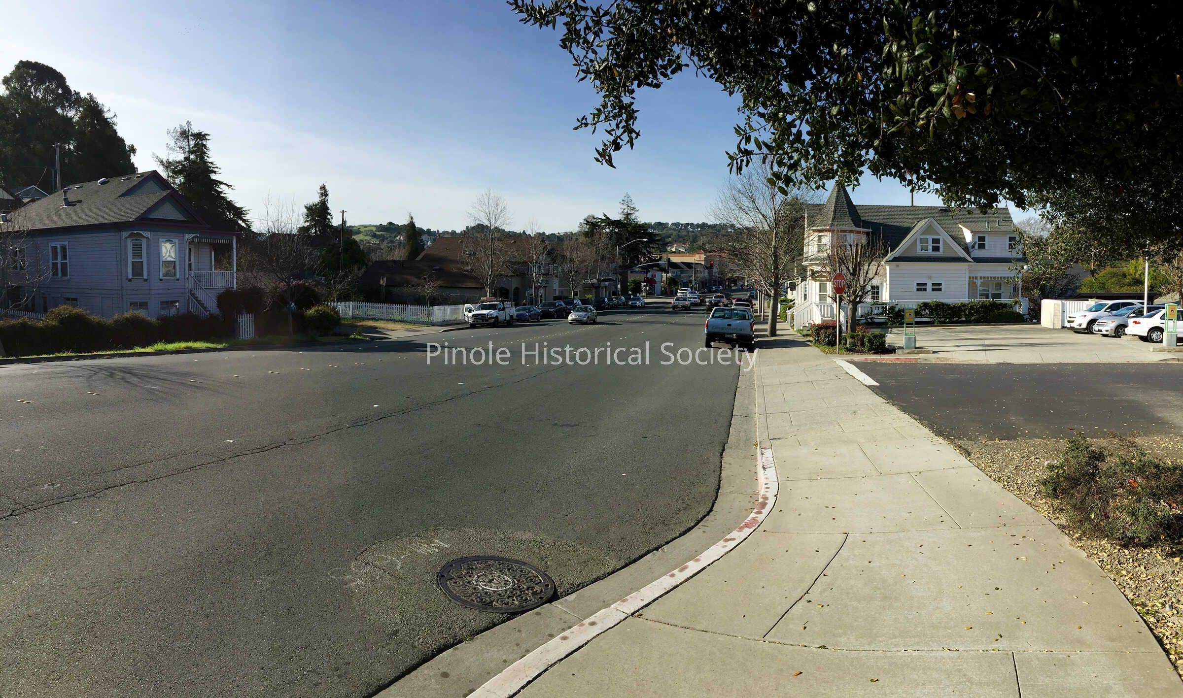 Looking west on San Pablo Avenue: San Pablo Avenue in 1910 was narrow, one lane in each direction for horse carts and the occasional automobile. The home with the steeple-like cupola, built in 1895, belonged to William W. Mann and his wife, Elizabeth. William was a foreman at the California Powder Works. The now-developed hills in the background were unspoiled, save for a reservoir that diverted water from Pinole Creek to serve the water needs of Pinole and Hercules residents and the powder works.Copyright