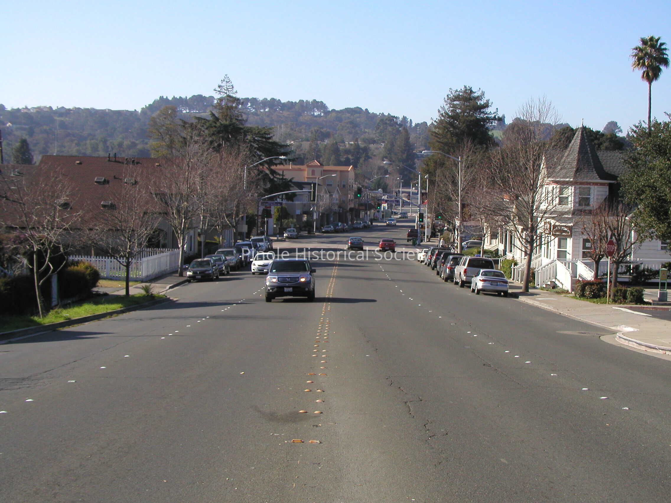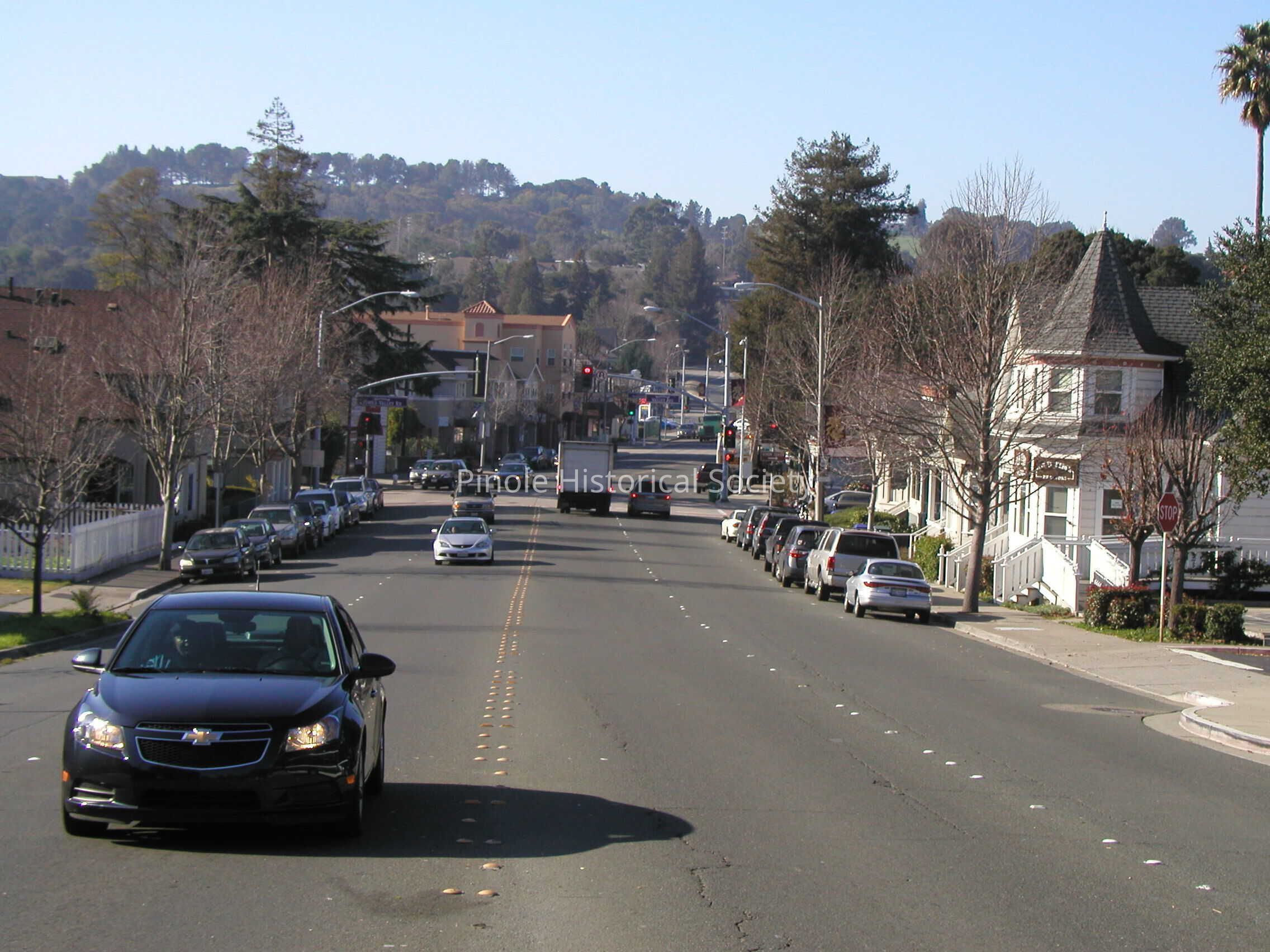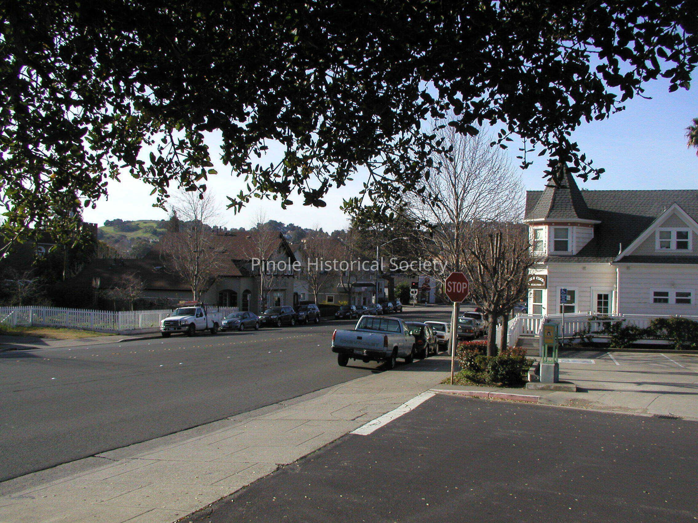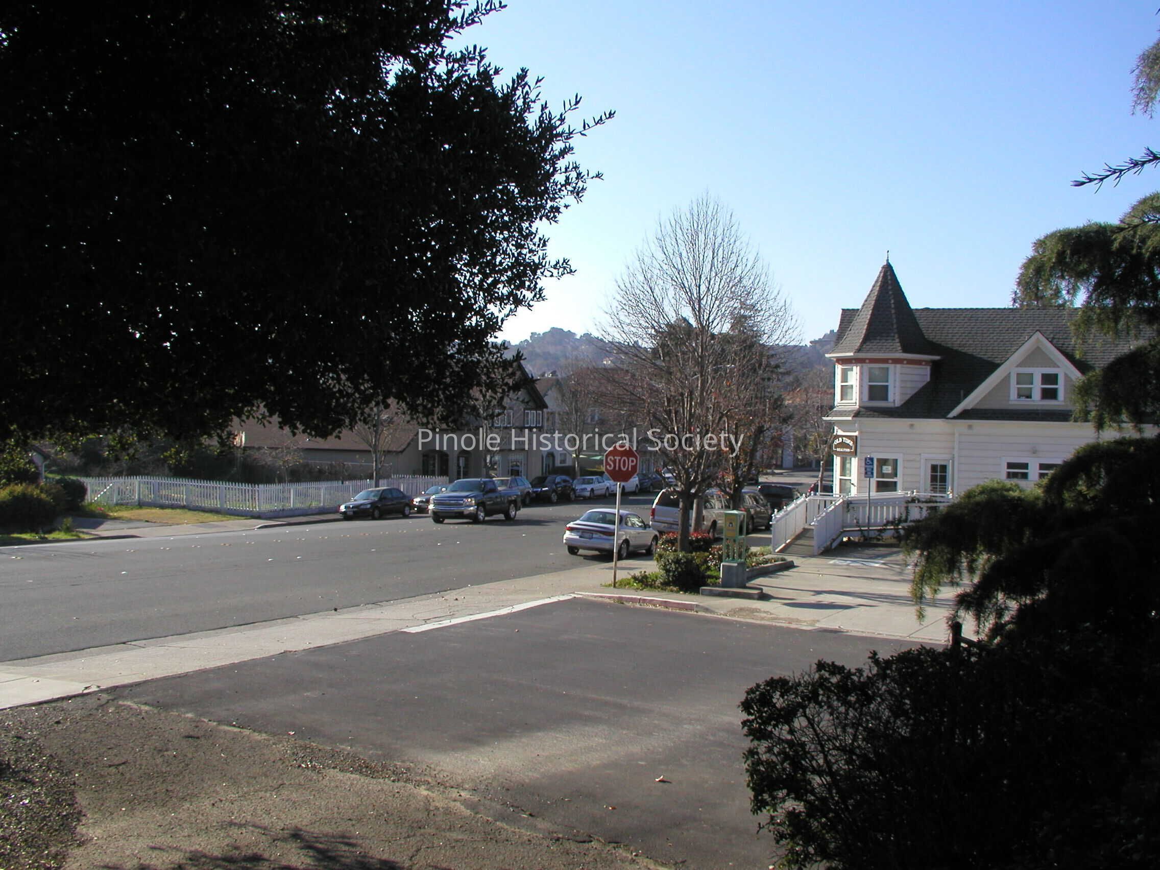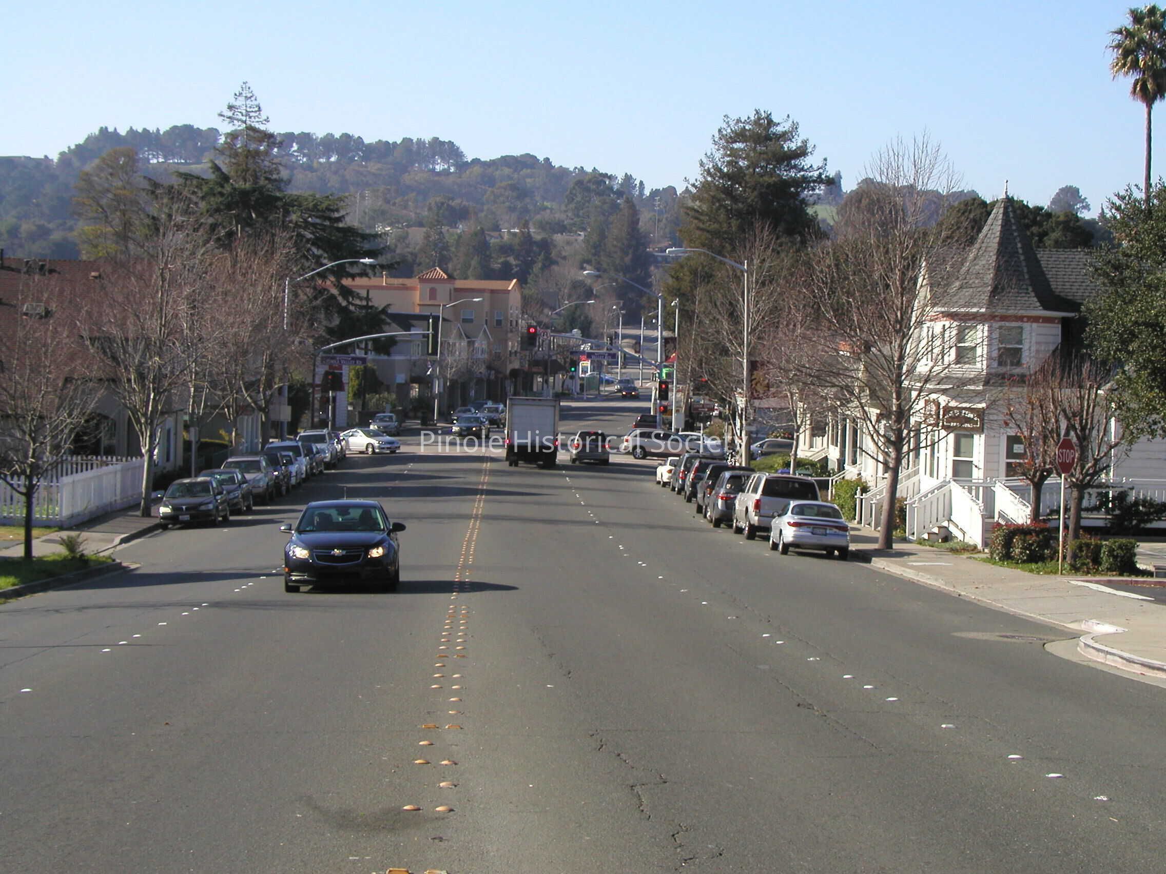 Looking west on San Pablo Avenue: San Pablo Avenue in 1910 was narrow, one lane in each direction for horse carts and the occasional automobile. The home with the steeple-like cupola, built in 1895, belonged to William W. Mann and his wife, Elizabeth. William was a foreman at the California Powder Works. The now-developed hills in the background were unspoiled, save for a reservoir that diverted water from Pinole Creek to serve the water needs of Pinole and Hercules residents and the powder works.Copyright