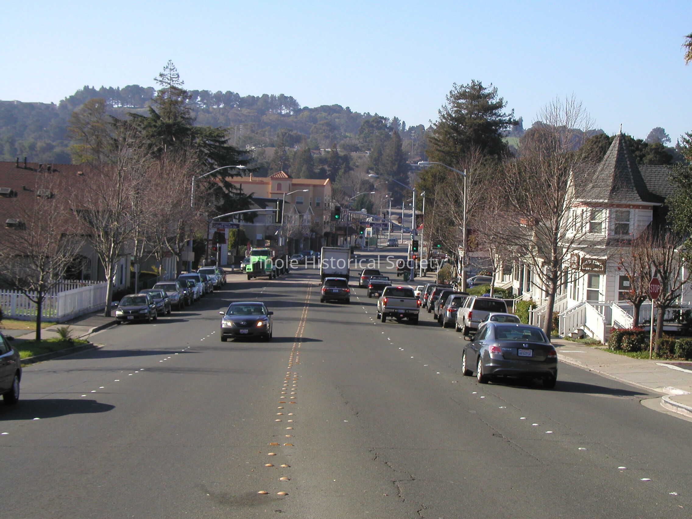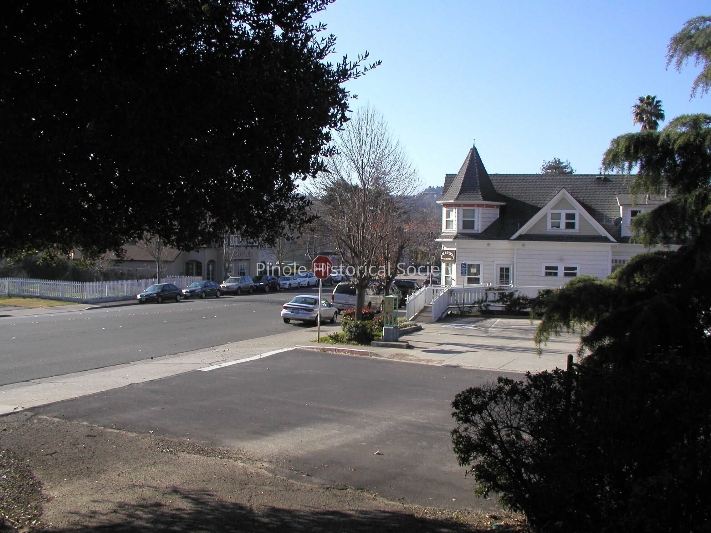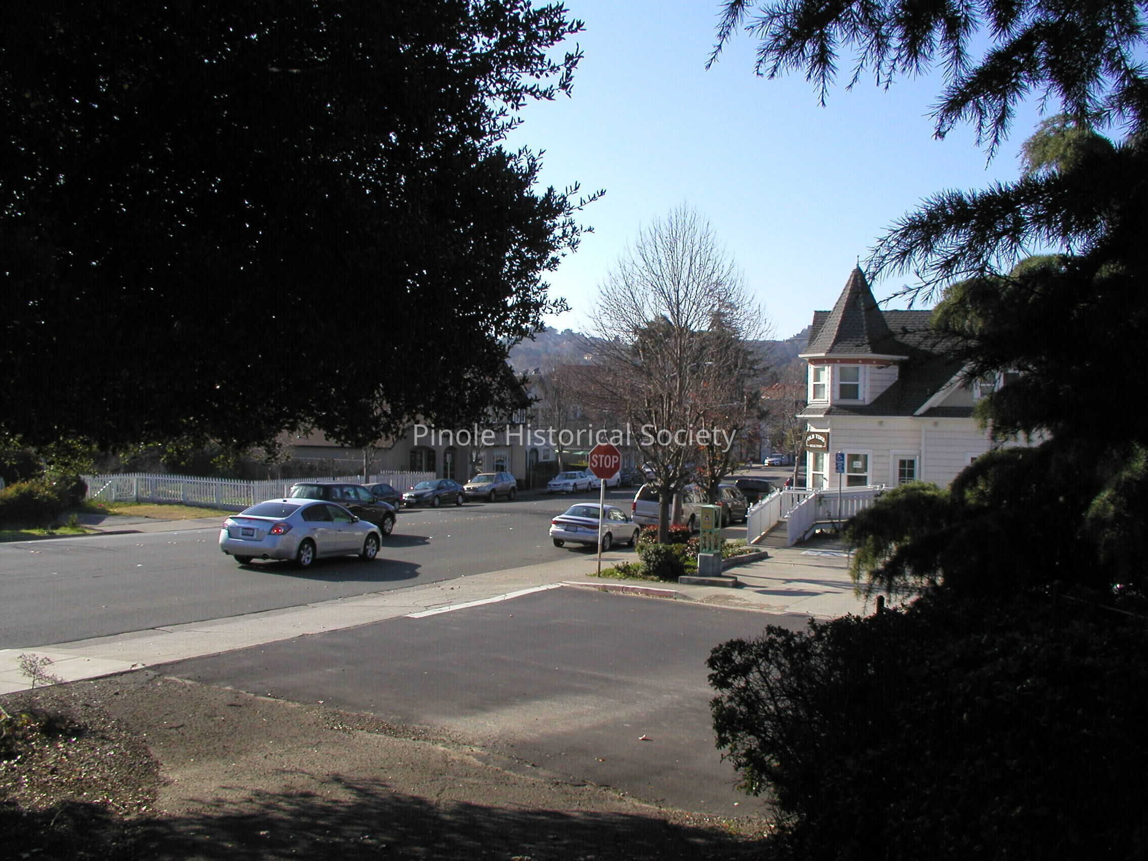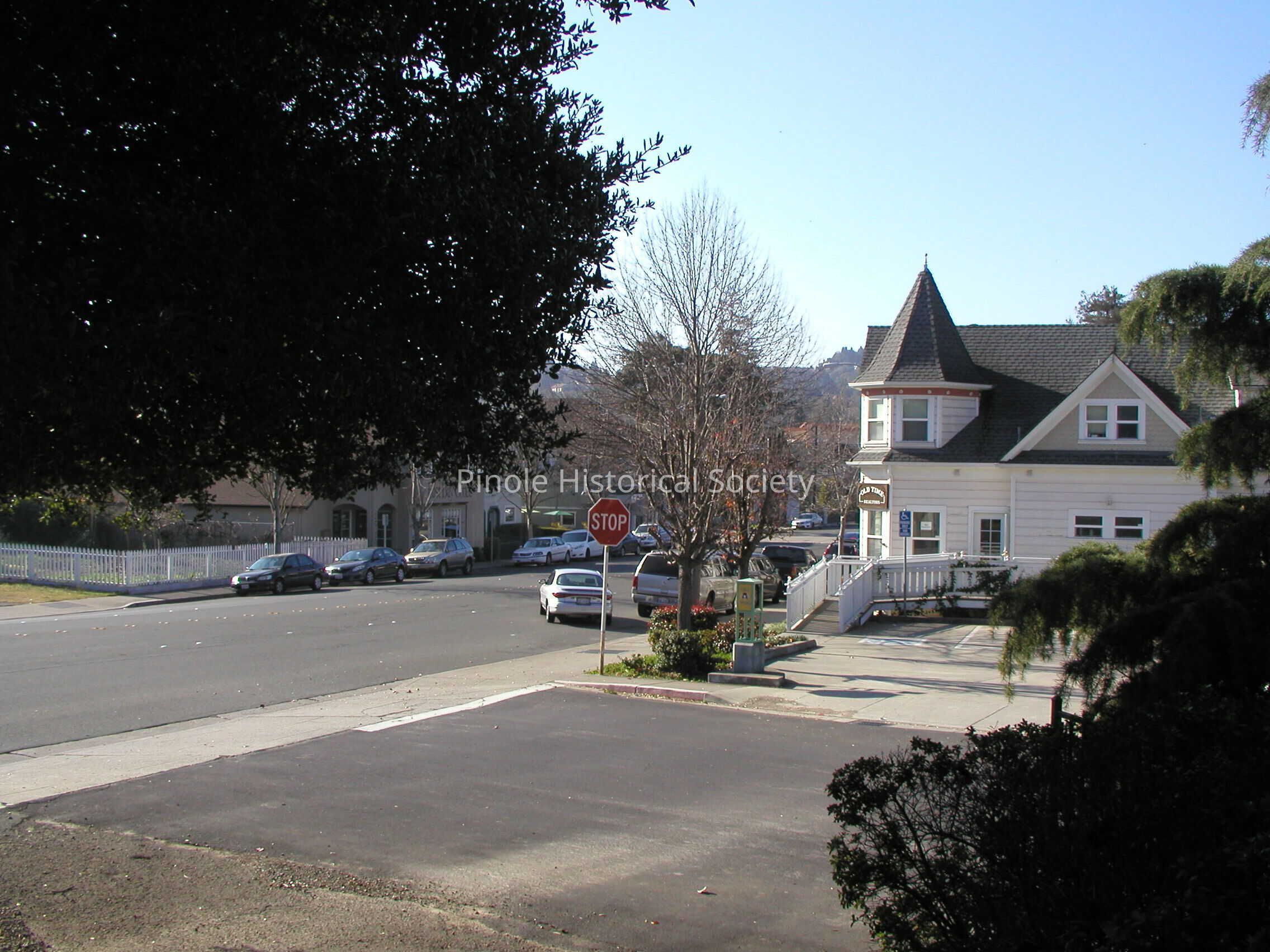 Looking west on San Pablo Avenue: San Pablo Avenue in 1910 was narrow, one lane in each direction for horse carts and the occasional automobile. The home with the steeple-like cupola, built in 1895, belonged to William W. Mann and his wife, Elizabeth. William was a foreman at the California Powder Works. The now-developed hills in the background were unspoiled, save for a reservoir that diverted water from Pinole Creek to serve the water needs of Pinole and Hercules residents and the powder works.Copyright