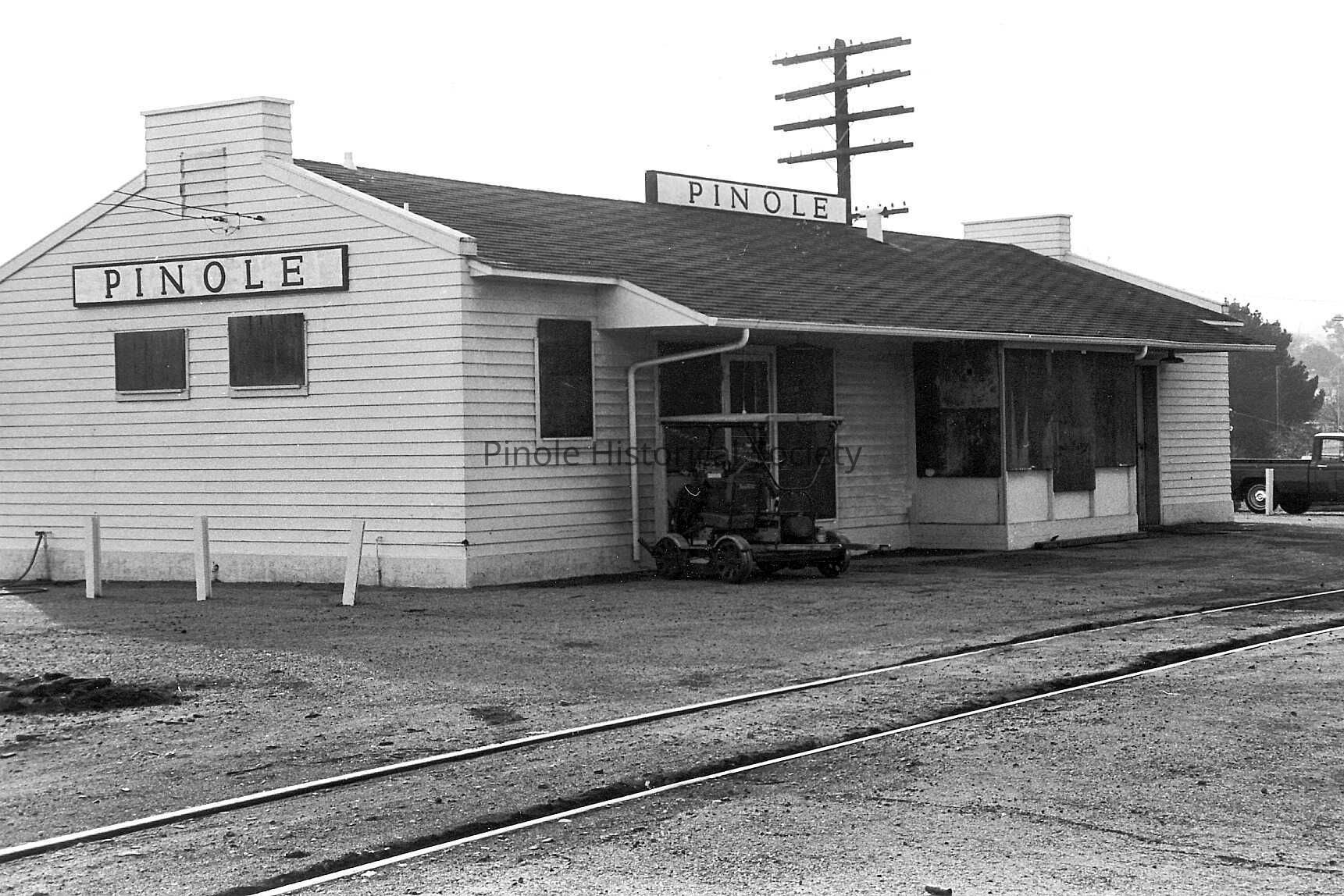 The final Santa Fe depot, designed by H. L. Gilman and built in 1945, replaced the one serving Pinole from 1901-1944, when it burned to the ground. Gilman’s design was developed for Santa Fe depots on the Coast Lines during World War II. The Pinole depot was demolished by the railroad in August 1998.Copyright
