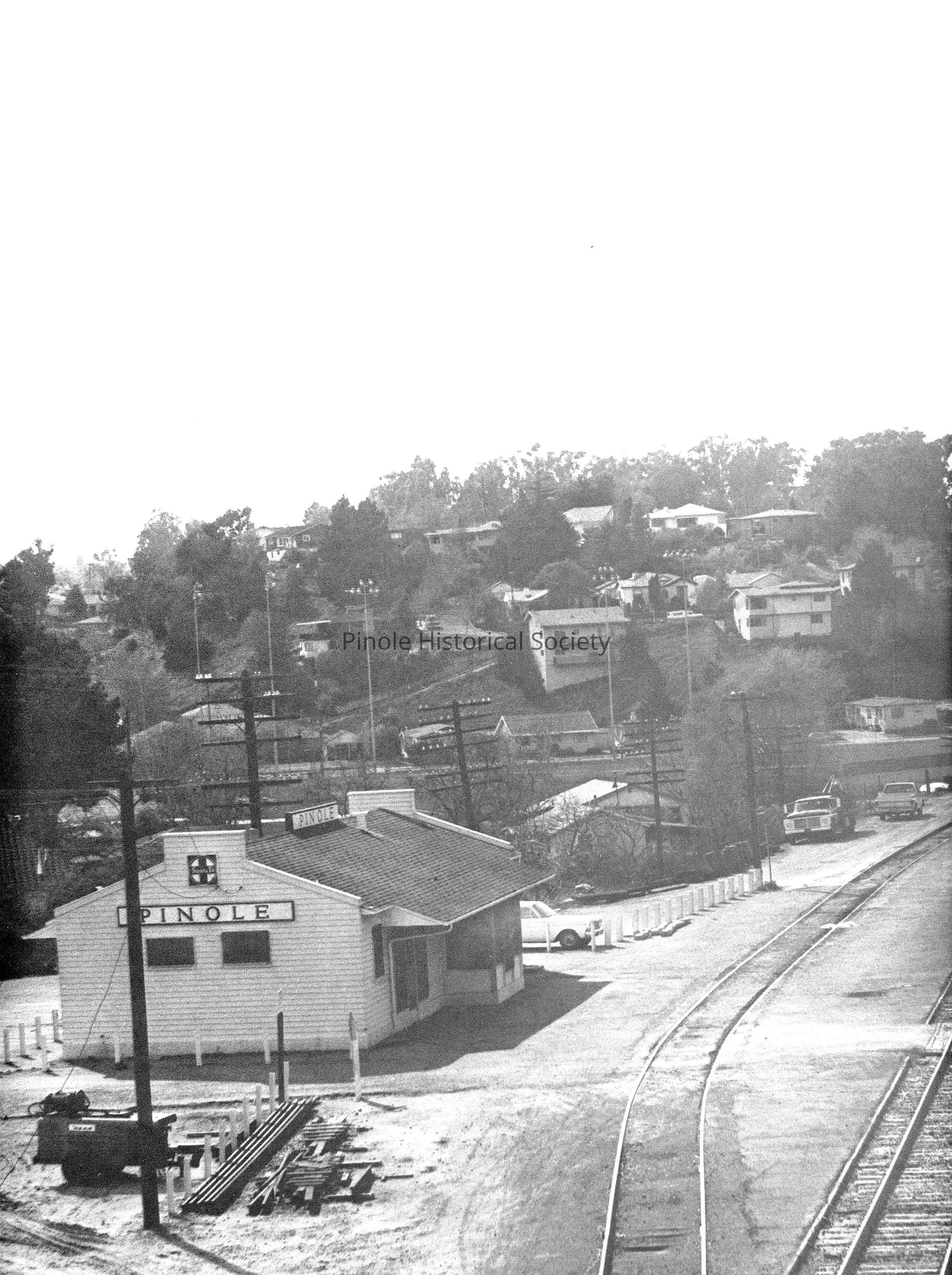 The final Santa Fe depot, designed by H. L. Gilman and built in 1945, replaced the one serving Pinole from 1901-1944, when it burned to the ground. Gilman’s design was developed for Santa Fe depots on the Coast Lines during World War II. The Pinole depot was demolished by the railroad in August 1998.Copyright