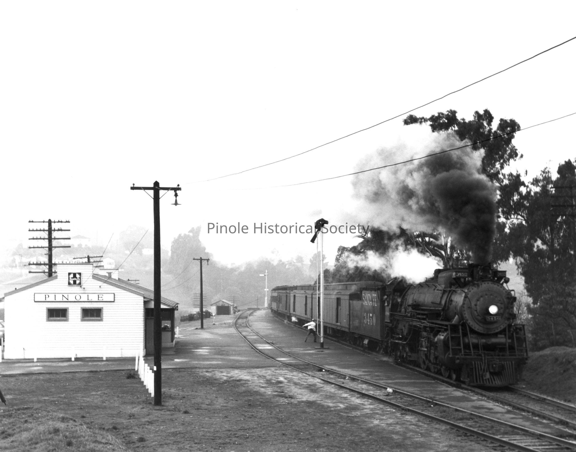 Santa Fe locomotive #3450 moves eastbound through Pinole on January 21, 1950 passing the Santa Fe Depot. The final Santa Fe depot, designed by H. L. Gilman and built in 1945, replaced the one serving Pinole from 1901-1944, when it burned to the ground. Gilman’s design was developed for Santa Fe depots on the Coast Lines during World War II. The Pinole depot was demolished by the railroad in August 1998.Copyright