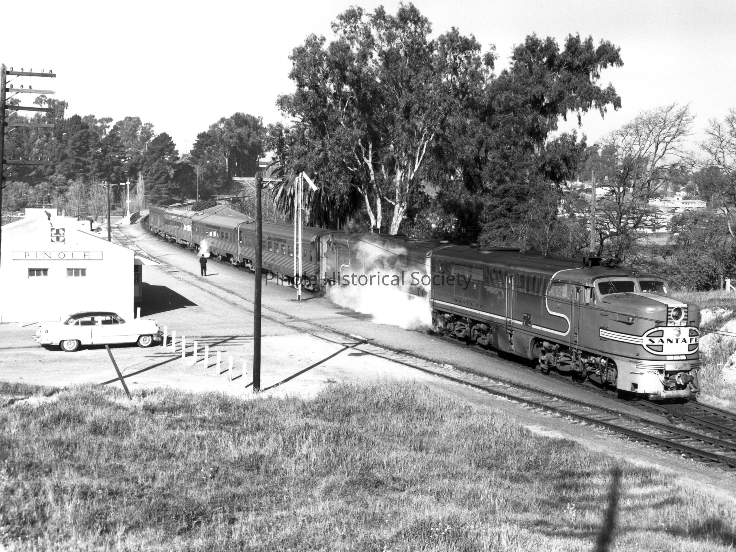 Santa Fe #72 moves eastbound through Pinole on March 20, 1965 passing the Santa Fe Depot. The final Santa Fe depot, designed by H. L. Gilman and built in 1945, replaced the one serving Pinole from 1901-1944, when it burned to the ground. Gilman’s design was developed for Santa Fe depots on the Coast Lines during World War II. The Pinole depot was demolished by the railroad in August 1998.Copyright