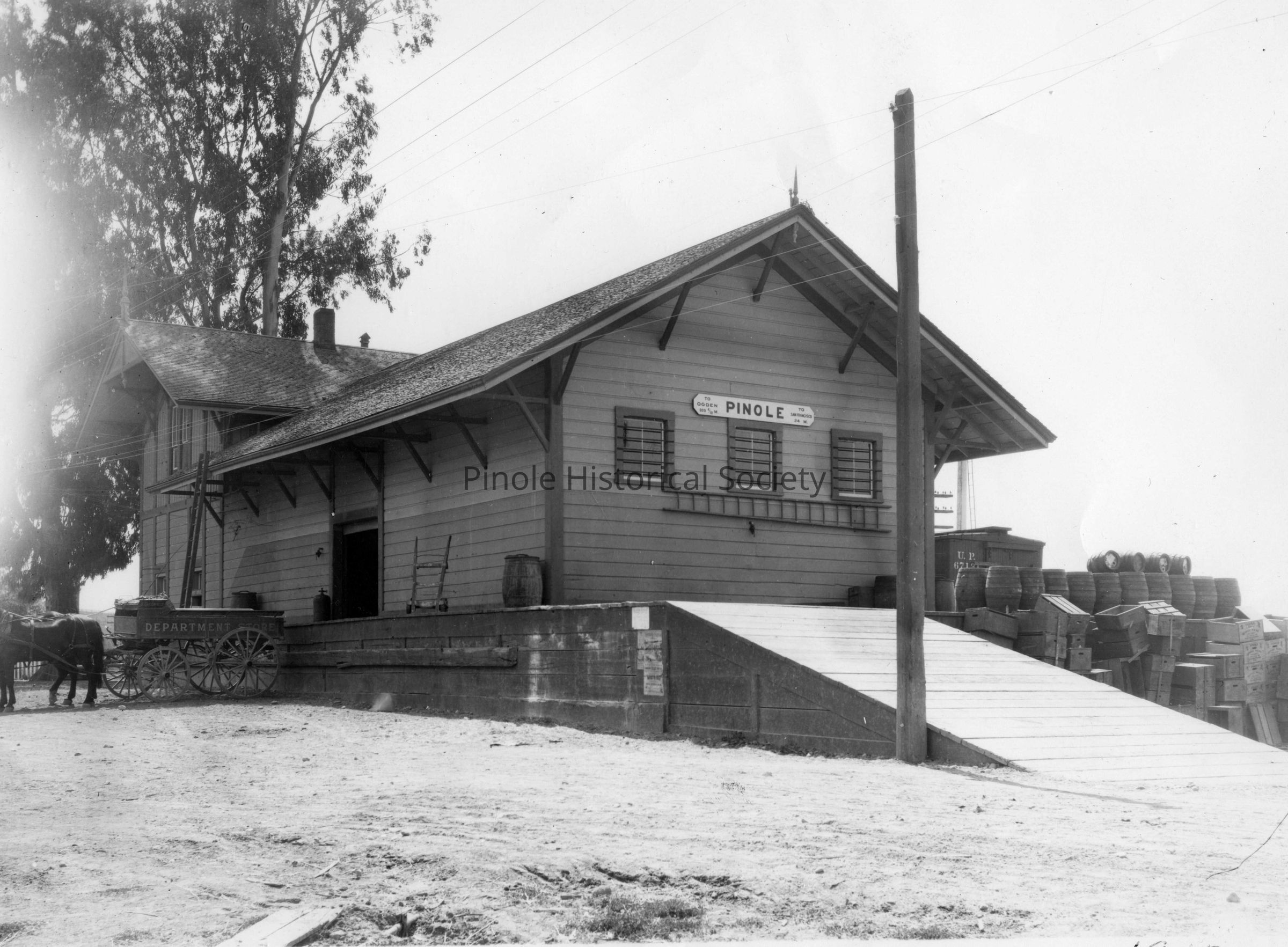 The Southern Pacific Railroad (formerly the Northern Railway and now Union Pacific) came to the Pinole waterfront in the late 1870s. With the railroad came a Pinole depot at the end of Tennent Avenue, across from the Bernardo Fernandez home. Pinole’s Southern Pacific depot was built in the 1880s. Until 1910, the depot served as Pinole’s post office. In 1889, Edward M. Downer came to Pinole at age 19 and served as the first official postmaster and the Southern Pacific’s transfer agent and telegrapher. Southern Pacific depots were always painted yellow and had a palm tree planted beside them. The original depot, by the shores of San Pablo Bay, was demolished in 1958.Copyright