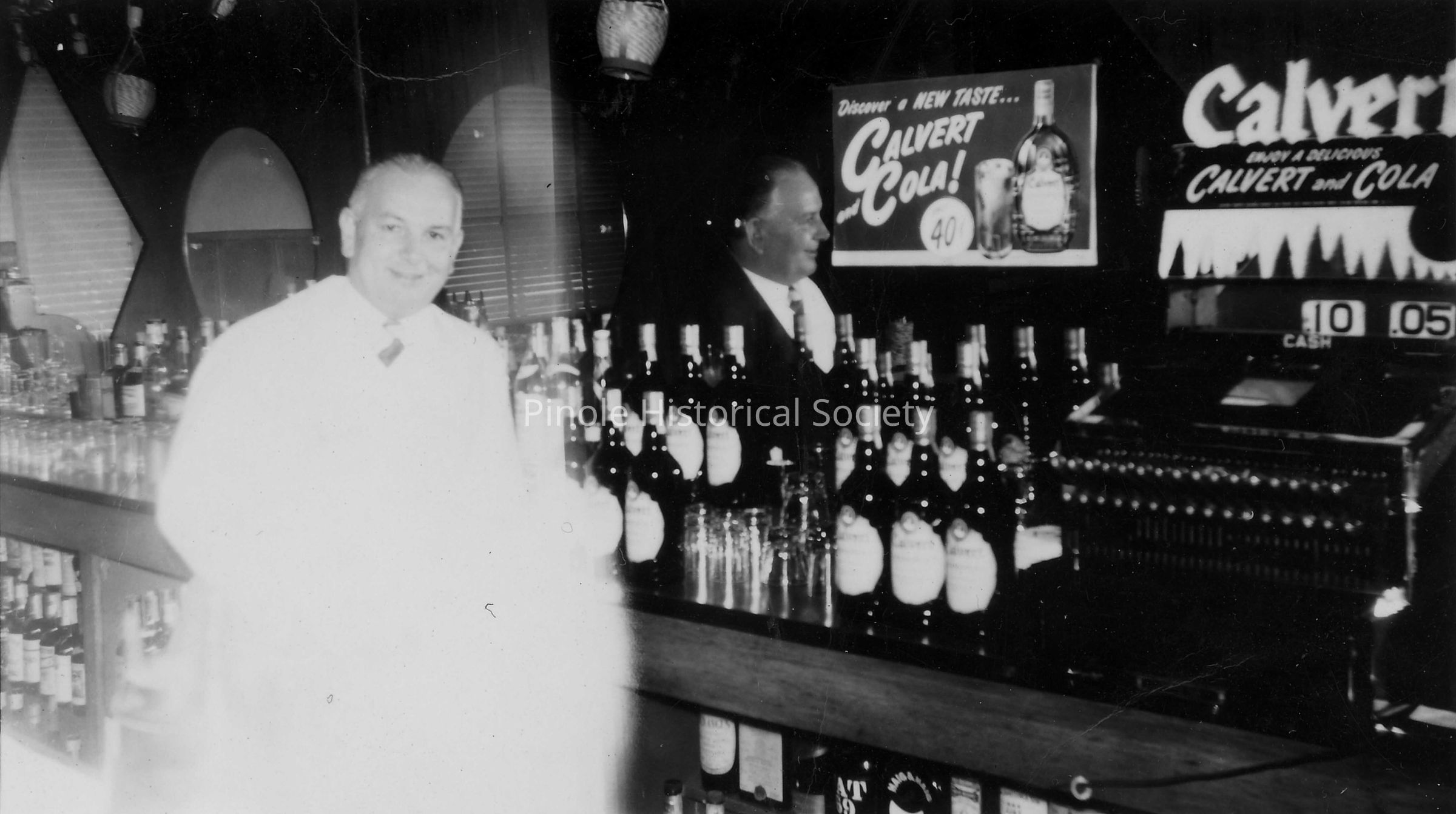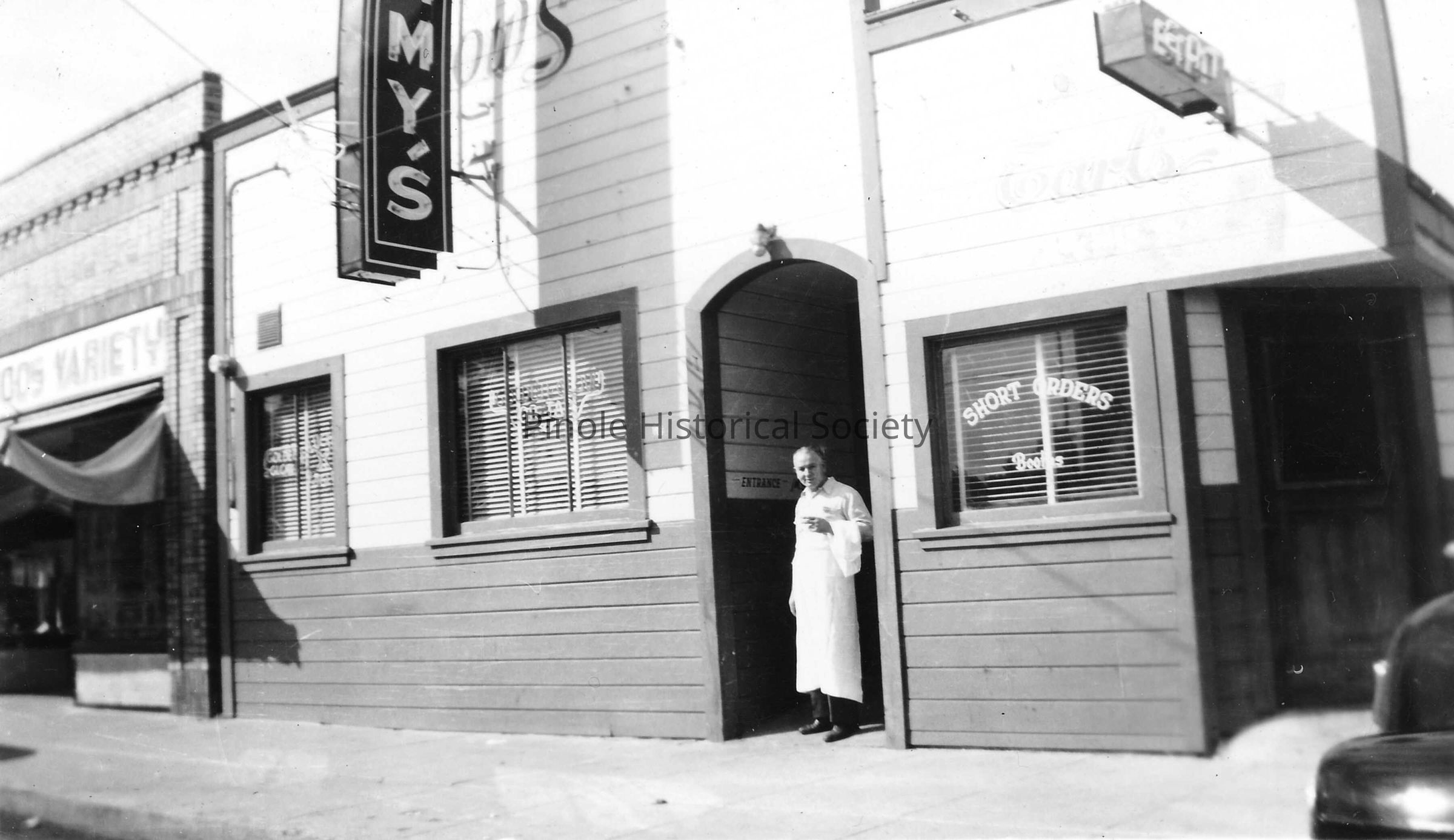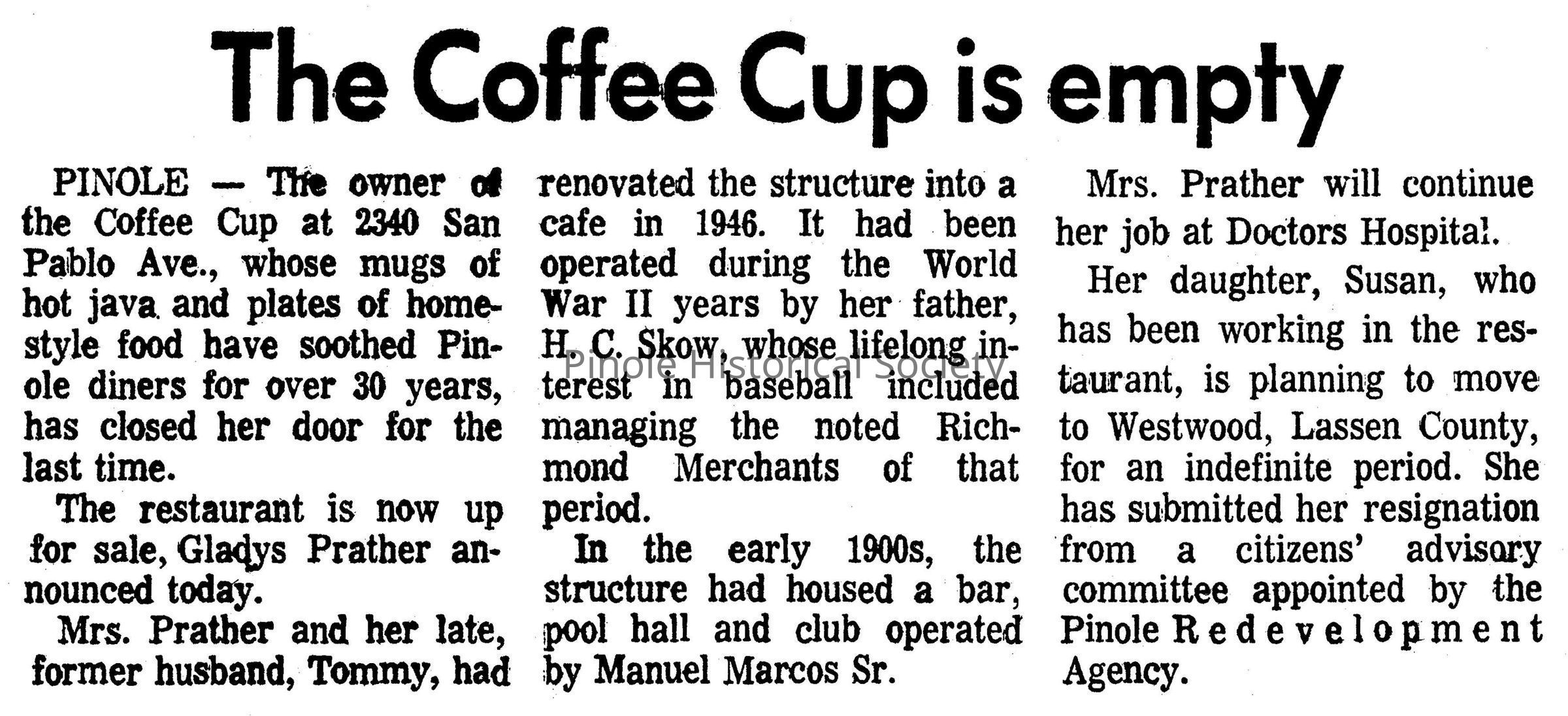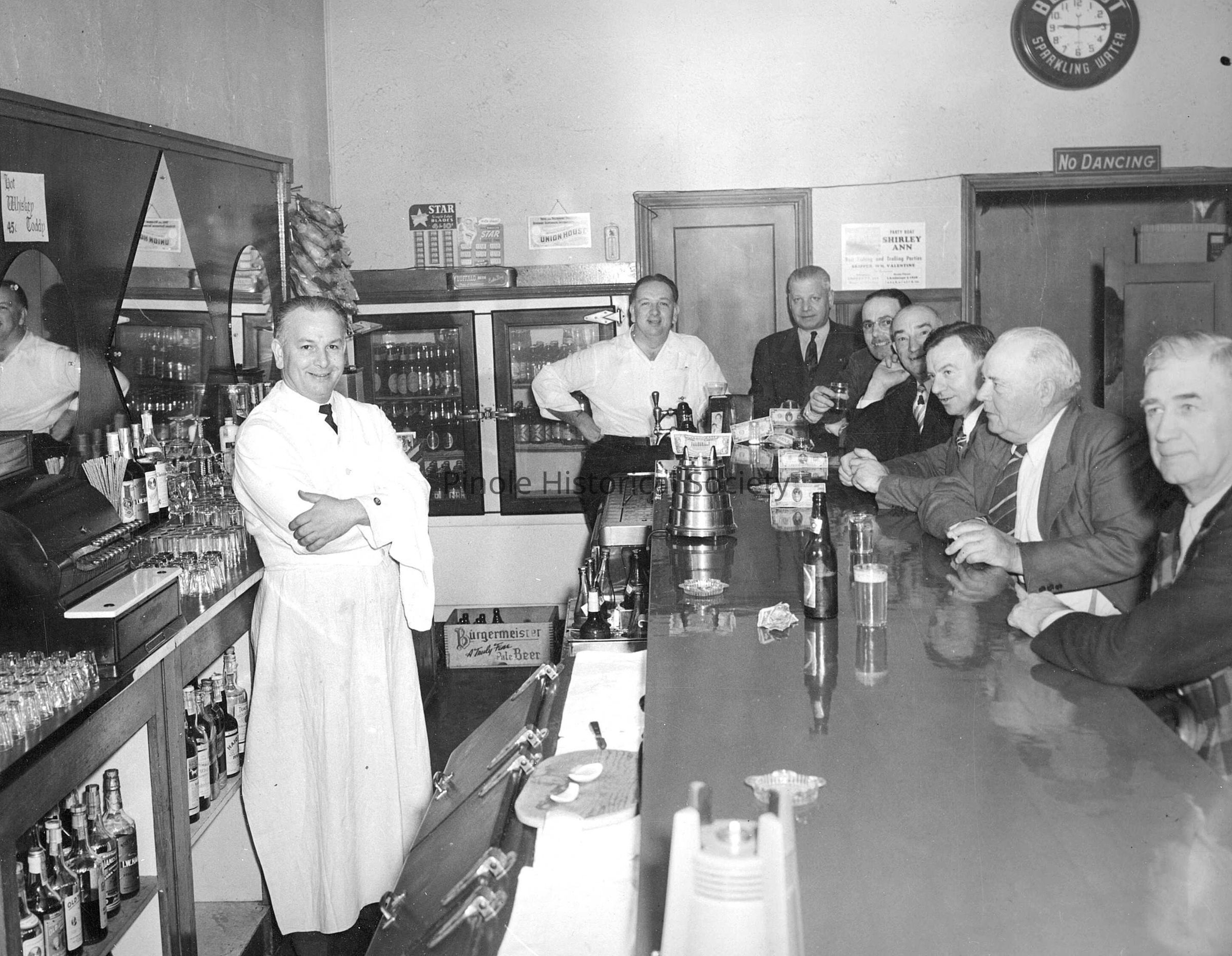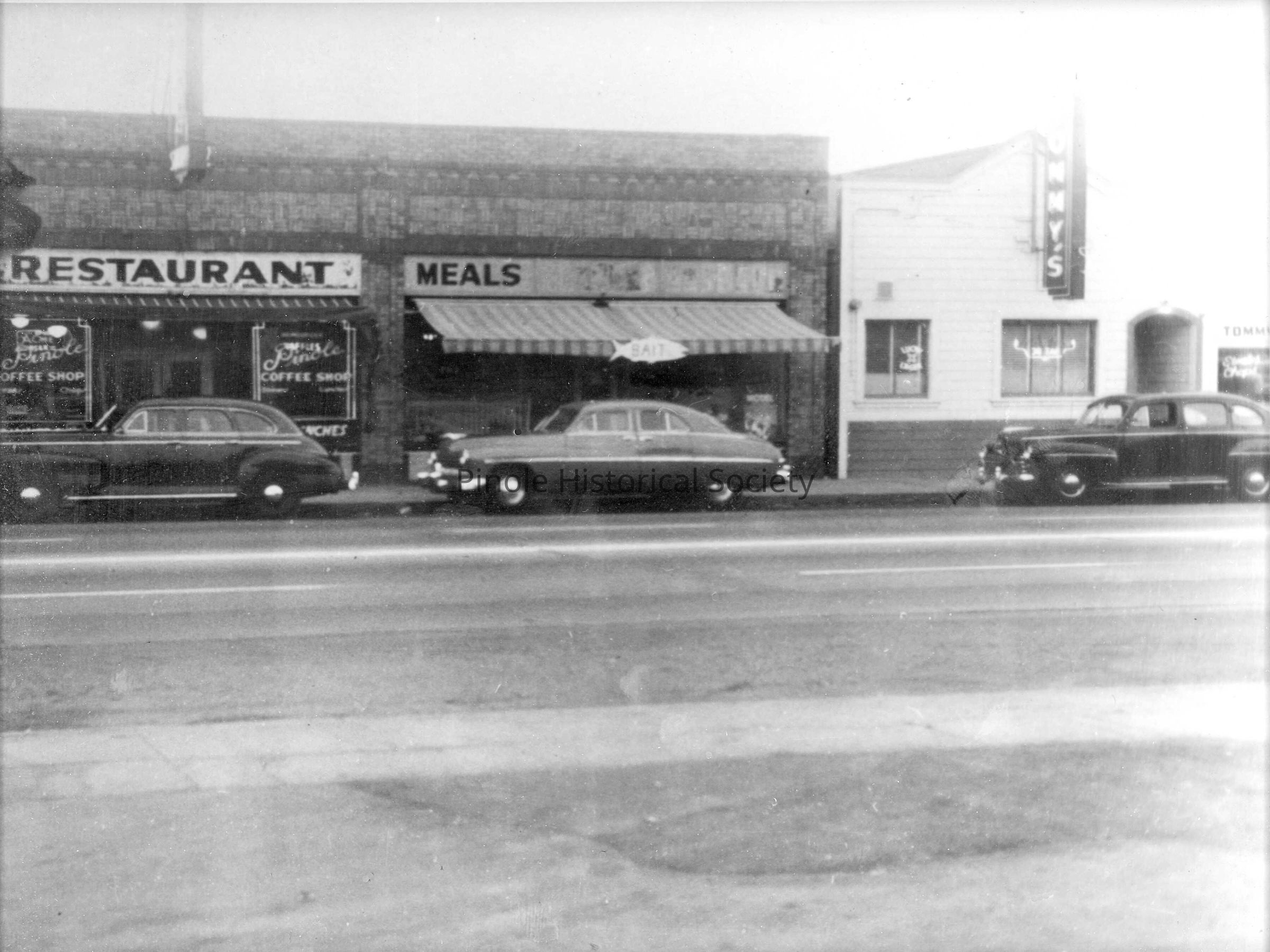 In 1945-46 Tommy’s Cafe was known as Harry Skow’s bar. Gladys Skow, Harry’s daughter, and her husband, Tommy Prather (behind the counter), took over the business, and it was called Tommy’s Cafe. It was a gathering place for coffee, conversation, and local news and gossip. It was in the same building that housed the Manuel Marcos Saloon at the turn of the 20th century. Mike and Terri Stott, two of Pinole’s most civic-minded and generous merchants, opened The Bear Claw Bakery in this building in 1982.Made/Created
