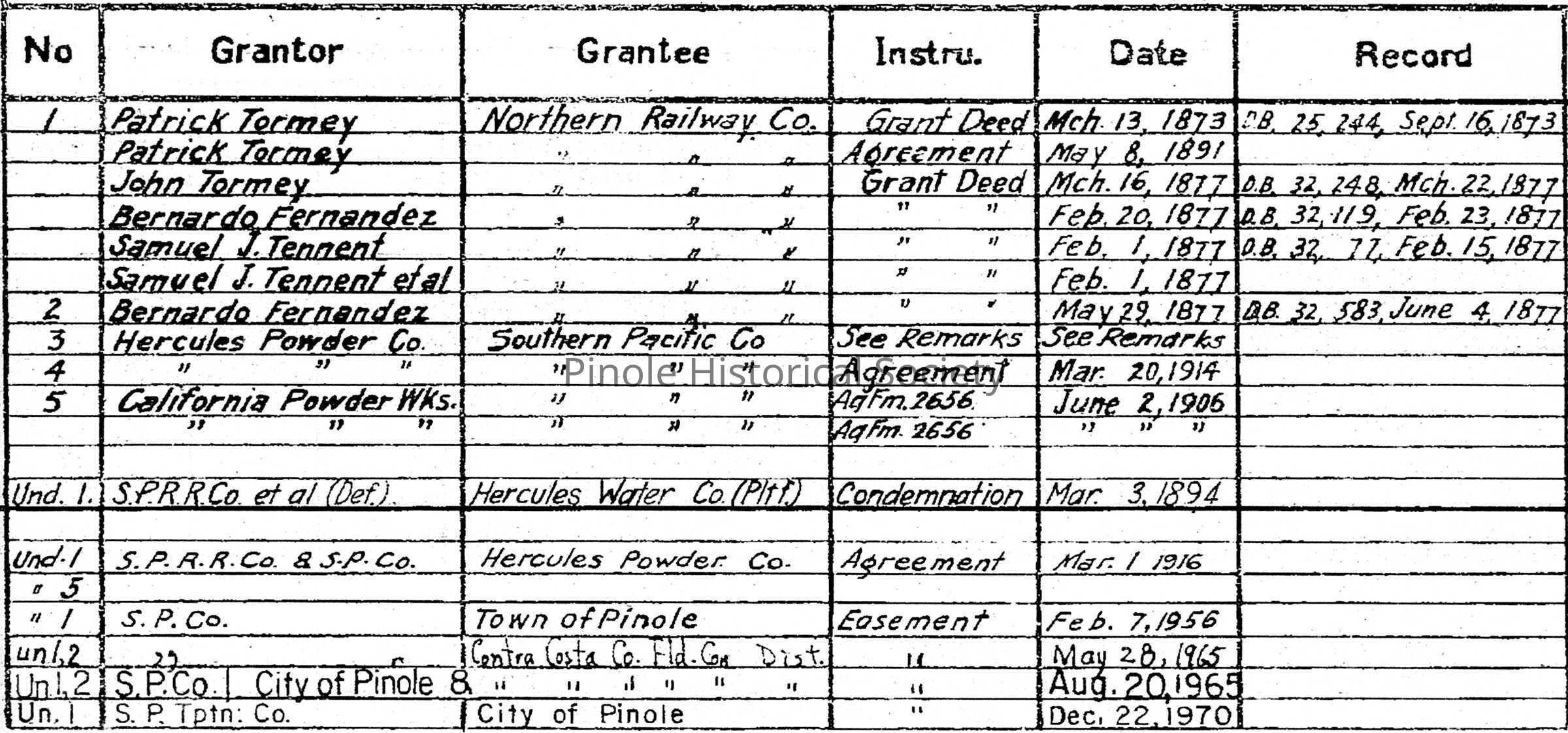 A Union Pacific schedule of property record of railroad land purchases from some of the most prominent men and businesses of the era — Patrick and John Tormey, Bernardo Fernandez, Samuel J. Tennent, the Hercules Powder Company and the California Powder Works.Copyright