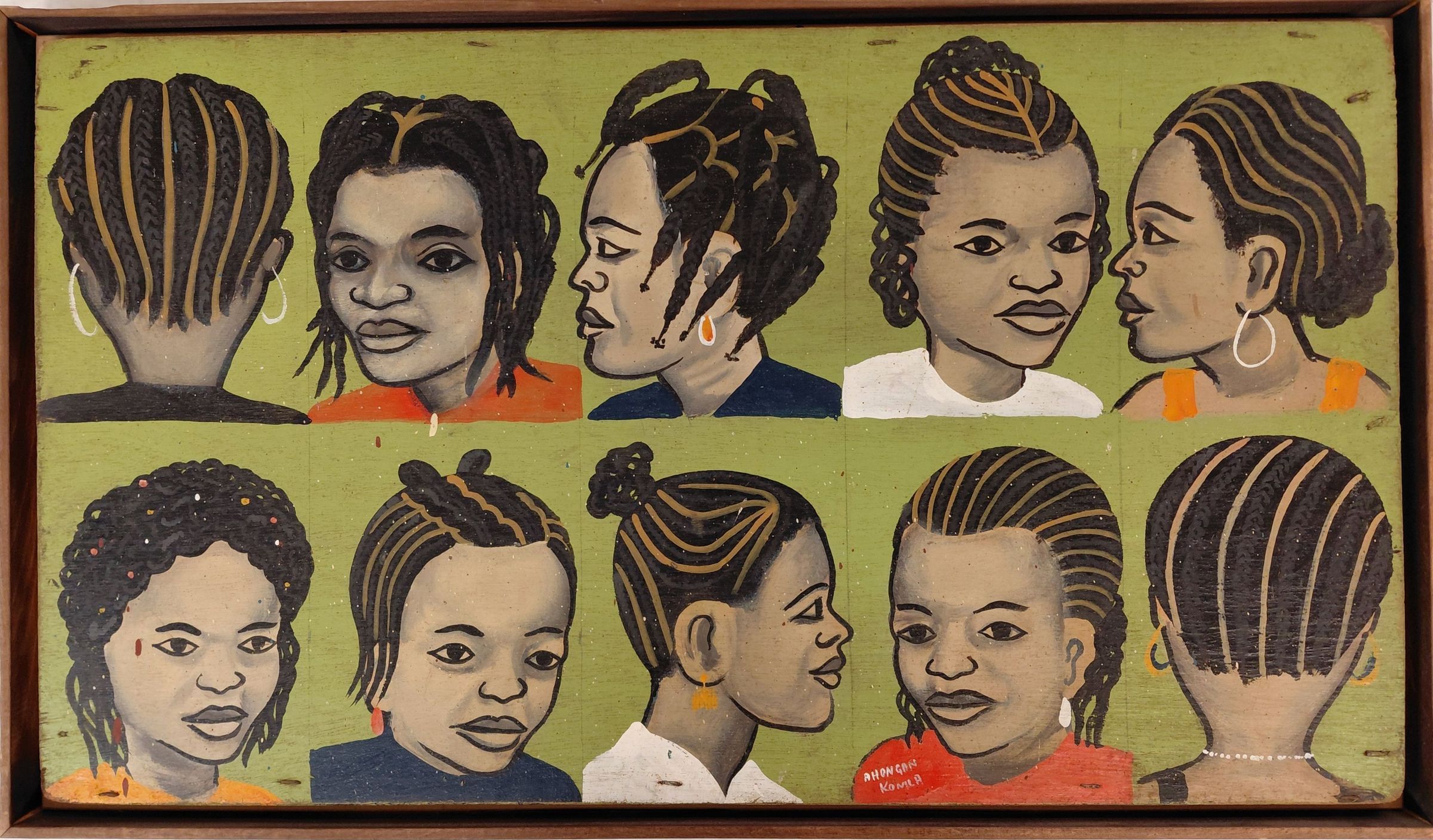 SMA60. 10 female African figures showing various hair styles, 2 rows of 5, various views (two facing away, three profile, 5 three-quarters view).Dimensions