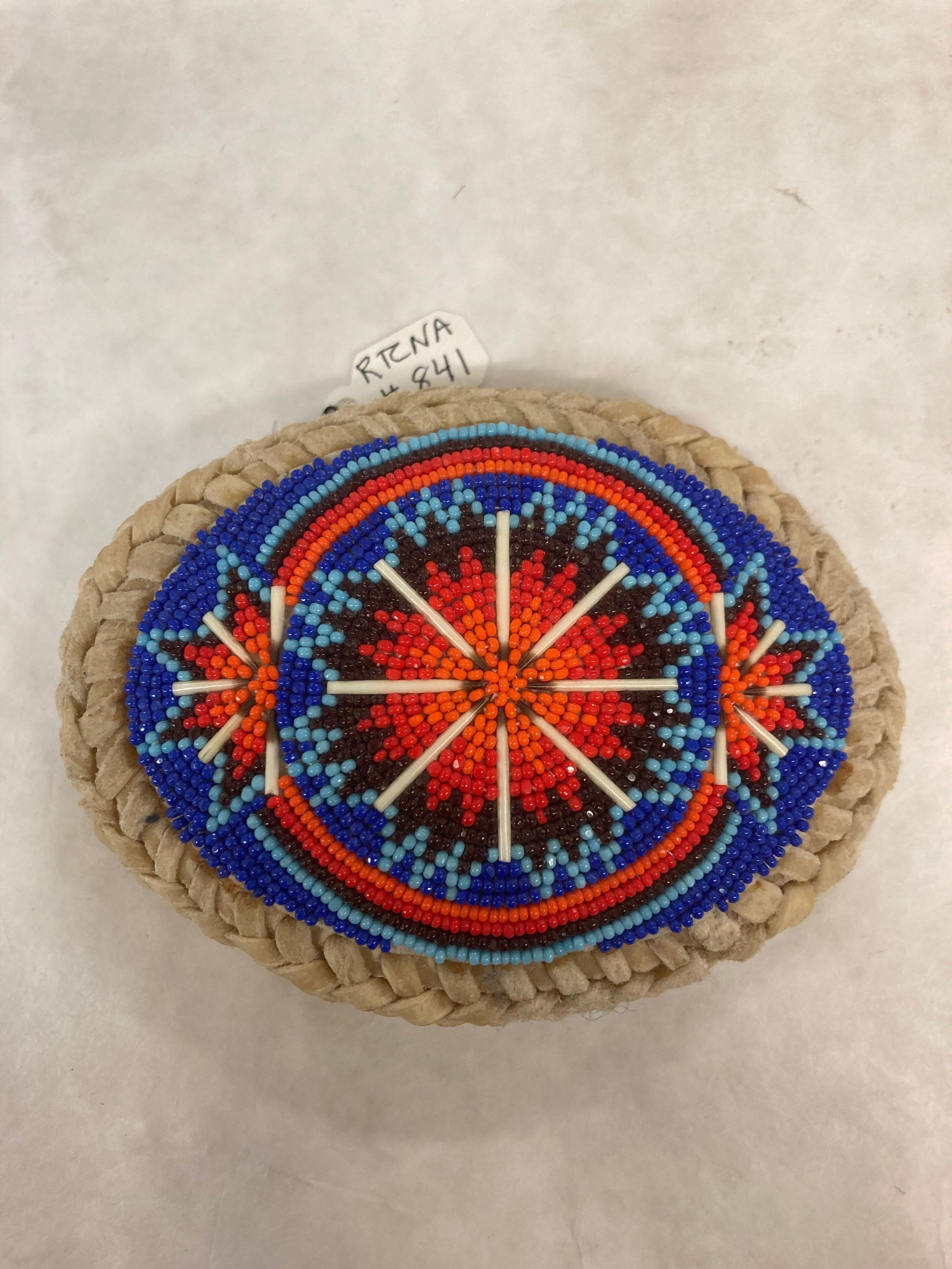 NA0841. Leather belt buckle with bead and quillwork. Blue/black/red/orange star pattern. Braided cowhide on edge.Made/Created