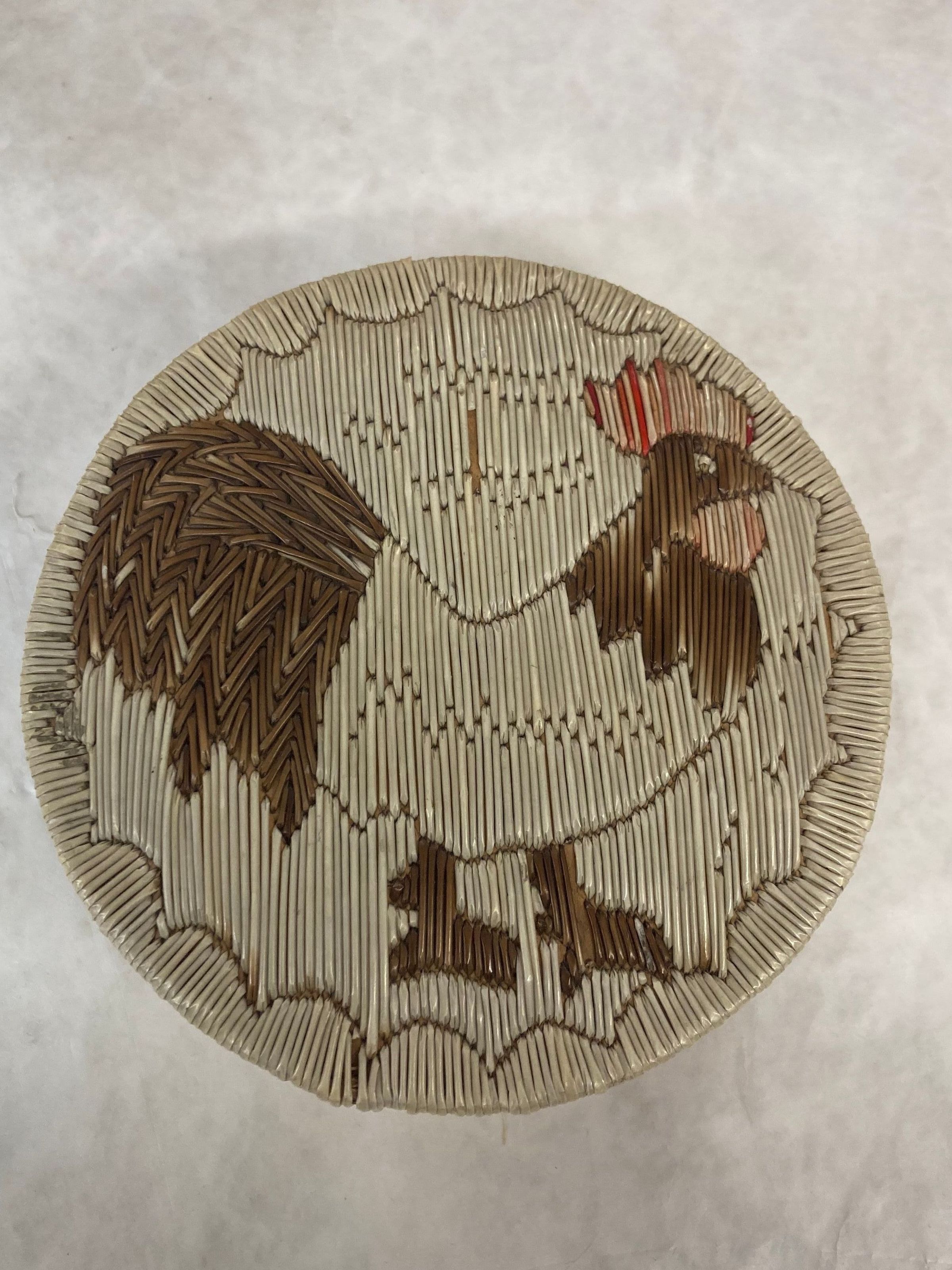 NA0256. Circular, lidded, bark container featuring quillwork on the lid and sides. Primarily white with brown/red accents depicting a rooster on the surface of the lid. Sweetgrass around lid and the opening.Made/Created