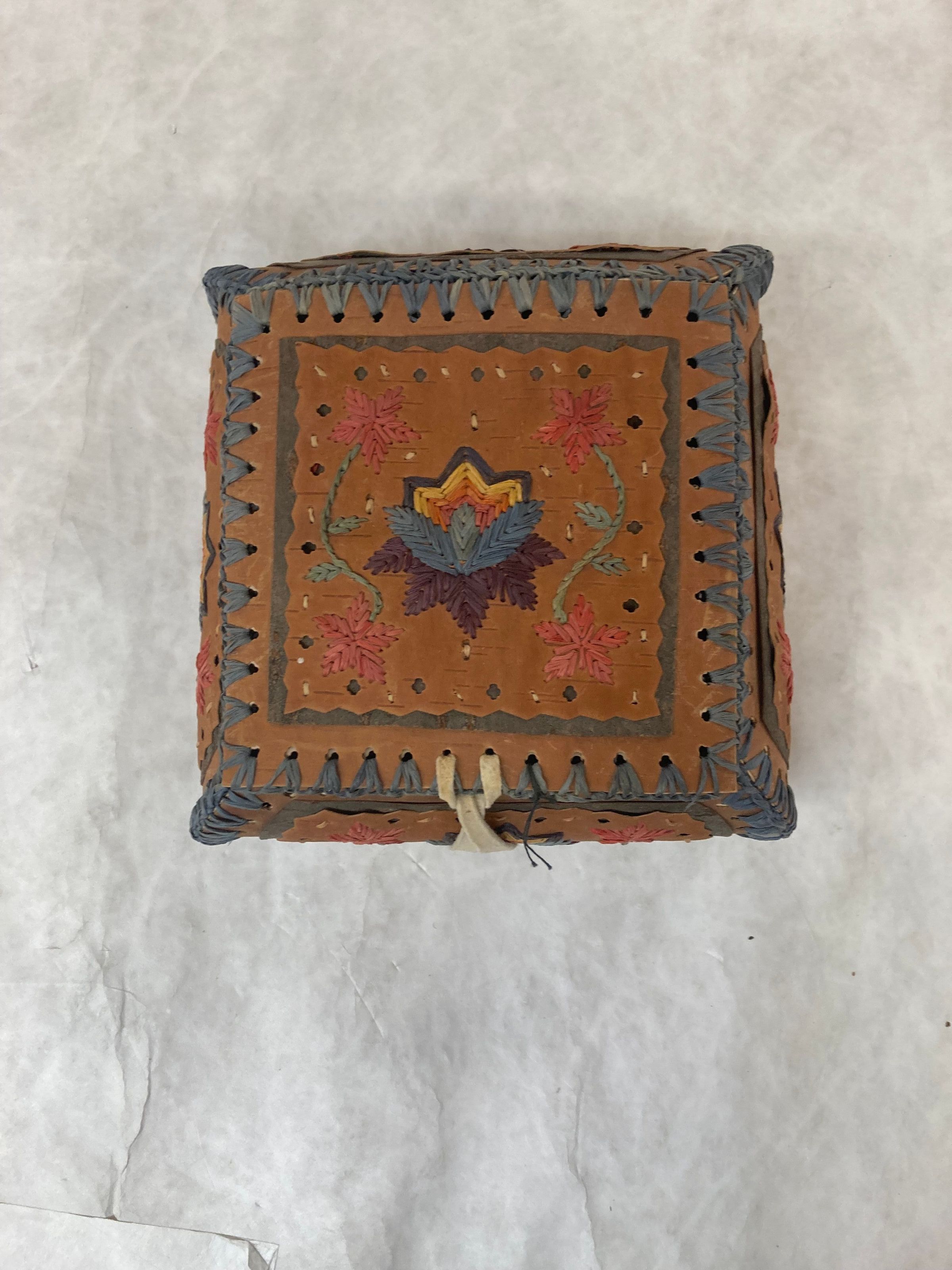 NA0277 b. Birchbark box with decorative stitching with floral designs in red/blue/yellow/orange/purple/green. Curved corners. Lid.Made/Created