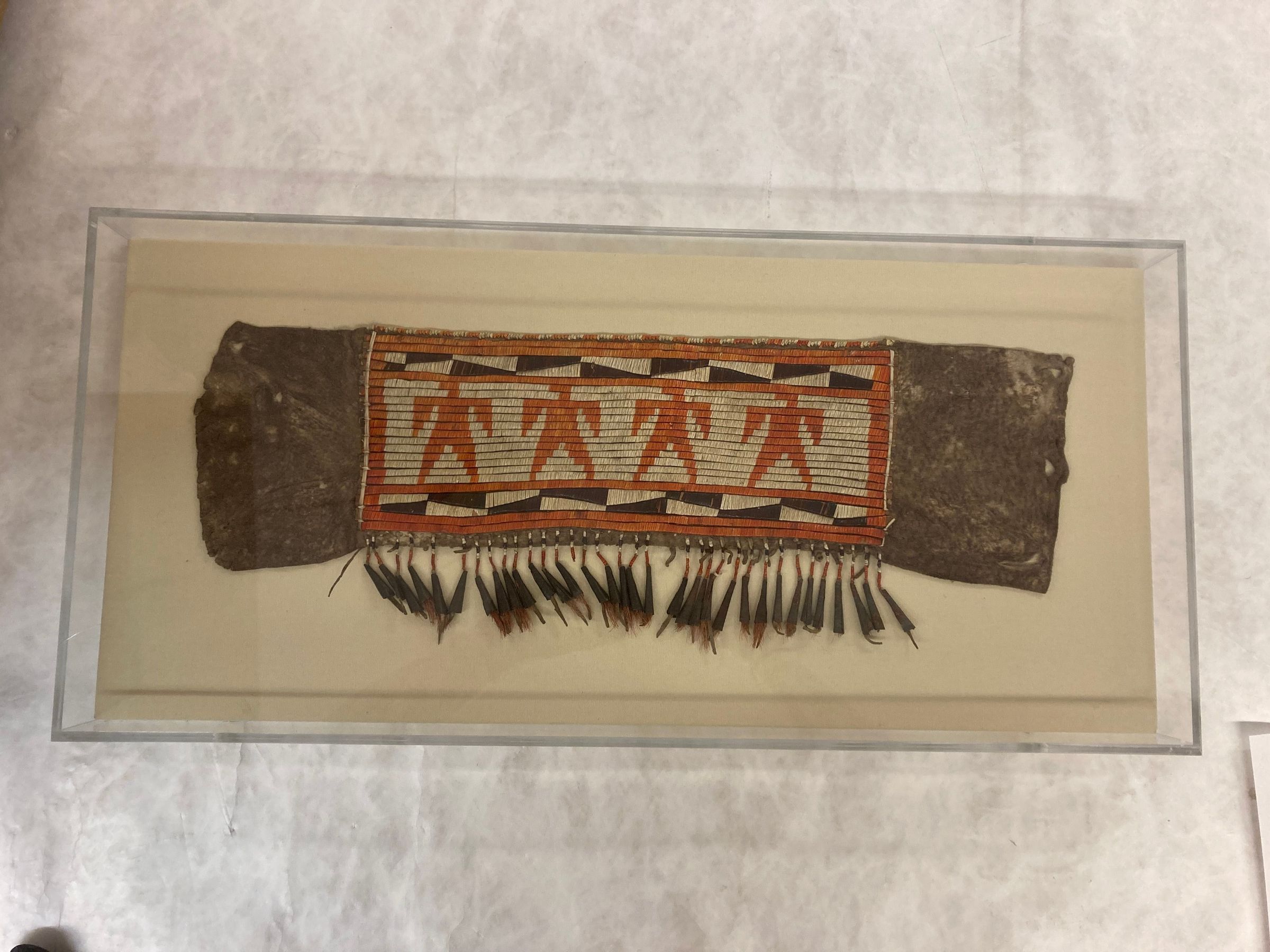 NA0683. Leather rectangle with quillwork featuring figure design (four figures). Red/white/black beaded (quill) fringe with tin cones.Made/Created