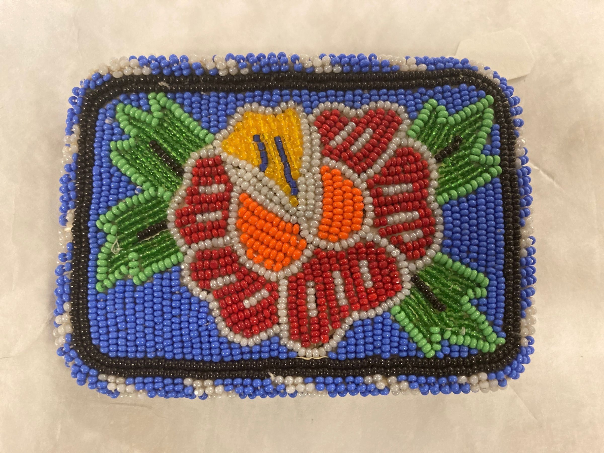 NA0843. Leather and metal belt buckle with beadwork featuring a flower in red/orange/yellow/blue/grey with leaves on a blue background. Leaves are green, outer petals are red, inner petals are orange, with yellow depicting the center of the flower. Grey linework for the flower. Edge of buckle has diagonal grey/blue stripes.Dimensions