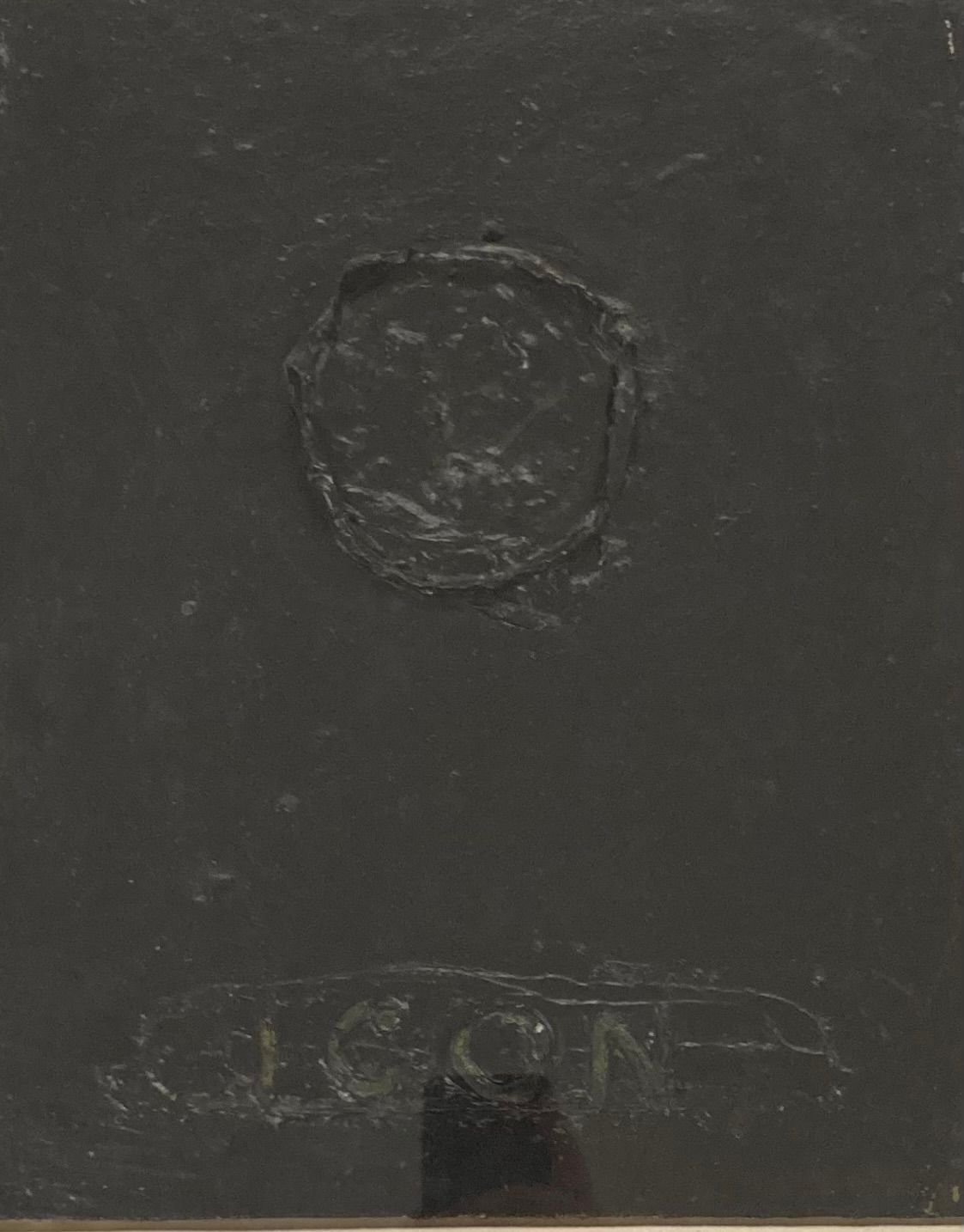 Thick black paint covering board and attached can end. "Icon" scraped into paint at bottom.
