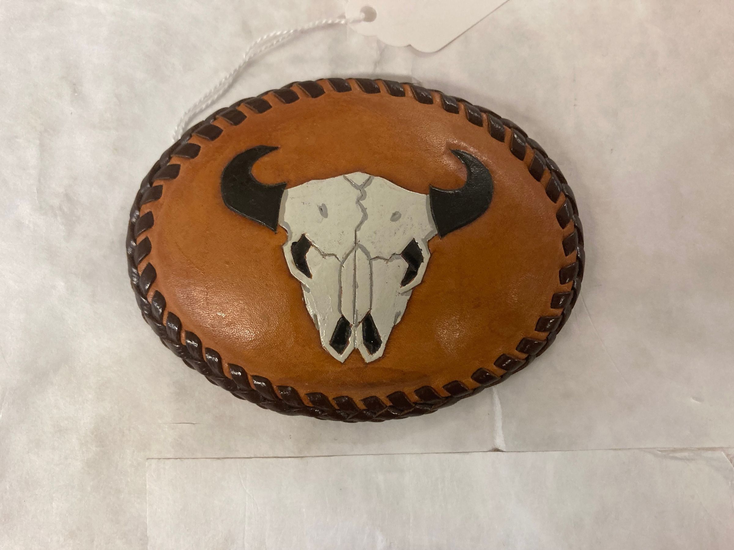 NA0844. Leather belt buckle over metal frame. Features bull skull. Darker leather edge and stitching. Metal hardware on reverse side.Dimensions