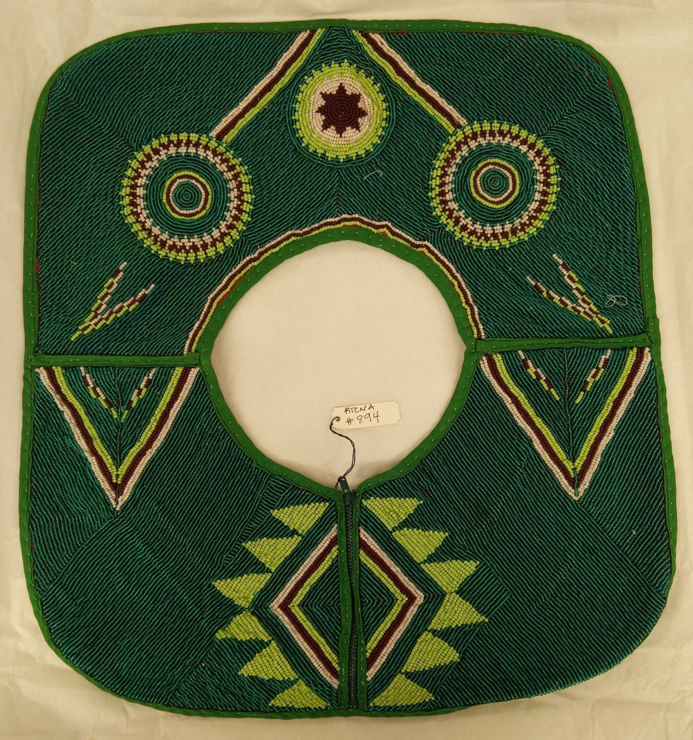 NA0894. Teal/green beaded collar. White/brown beads in design. Triangular and linear in design. 3 circles in front. Green trim, cream fabric backing. Dark green zipper on back of collar.Made/Created