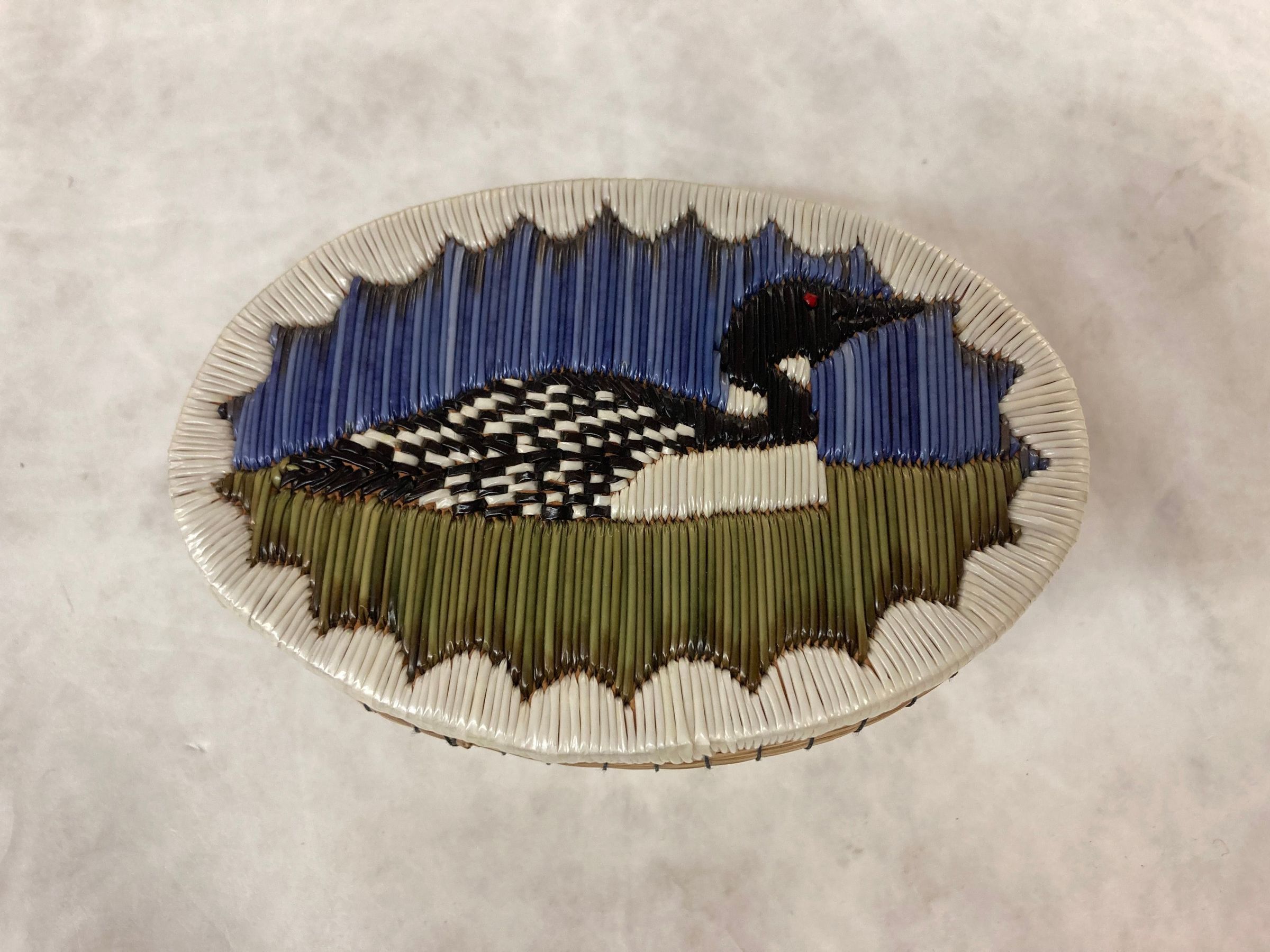 NA0915 b. Quillwork container. Mostly white, features a loon in center of lid with green and blue background. Inside of box is the bark.Made/Created