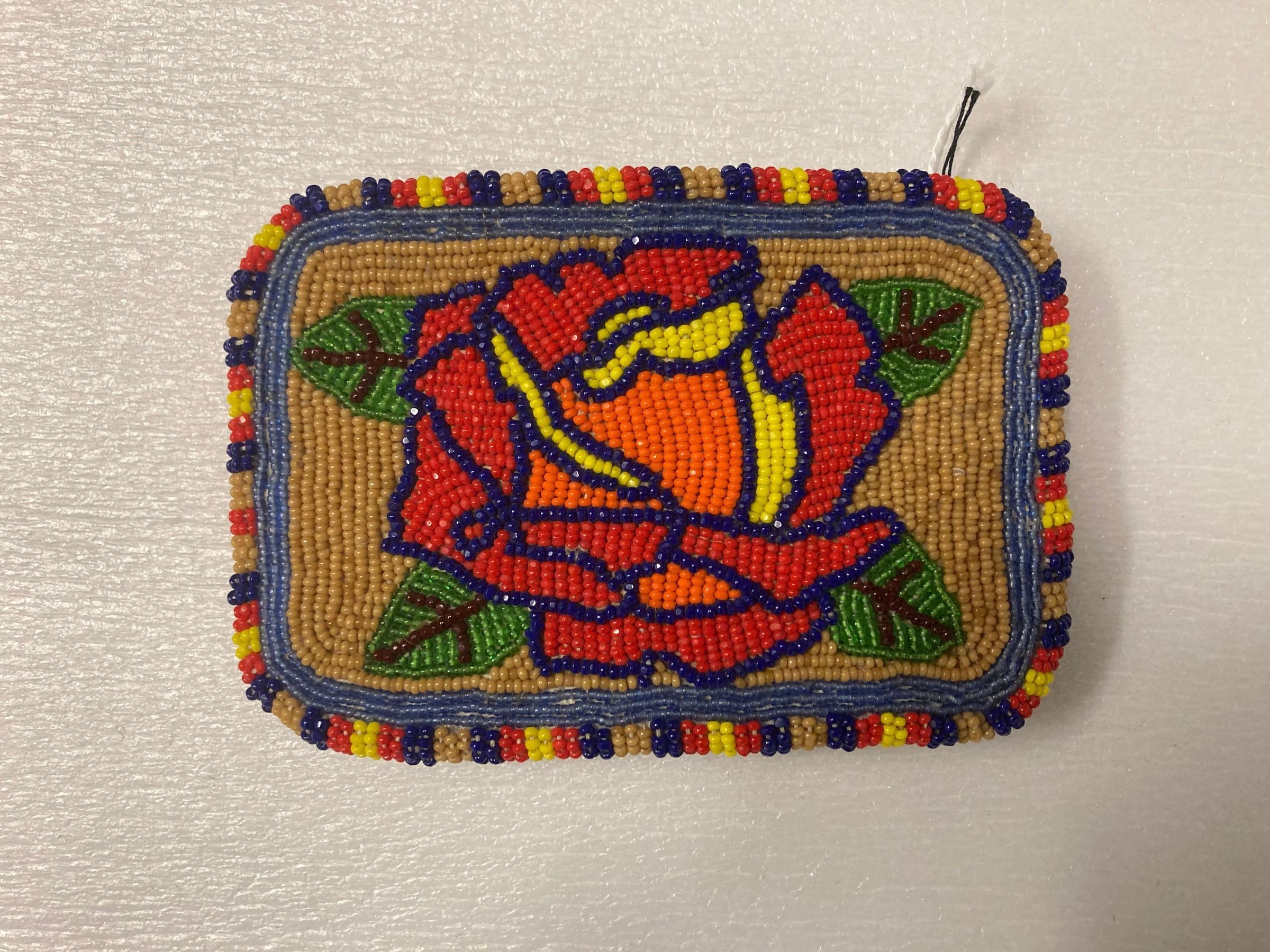 NA0839. Leather and metal belt buckle with beadwork depicting a rose. Outer petals are red, inner petals are orange, the tops of which are yellow. Dark blue outlines the flower and its petals. Leaves are green with brown. Background is tan with blue border and red/tan/yellow/blue diagonal stripes on edge.Material