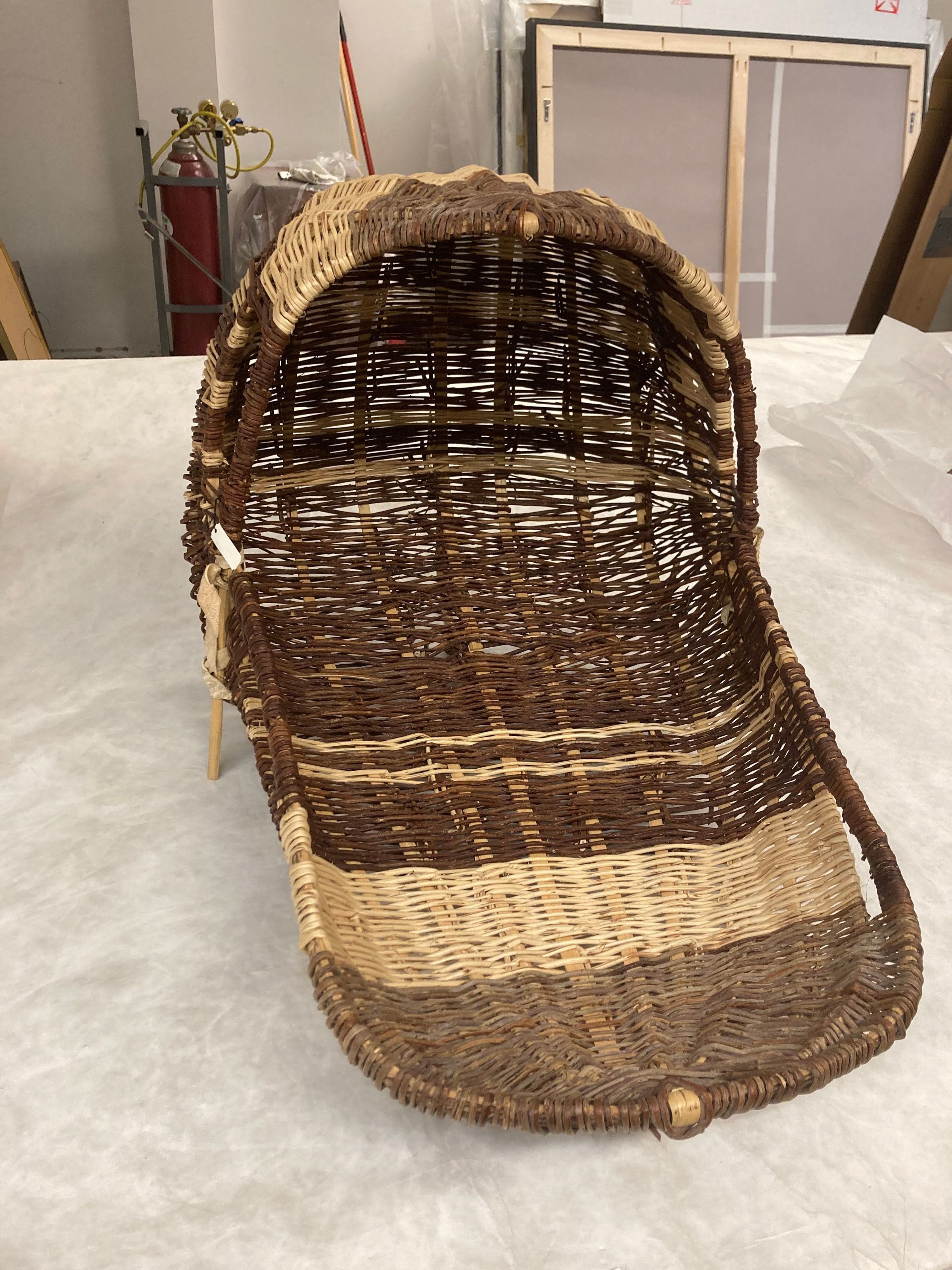 NA1093. Woven willow carrier. Rawhide ties on either side of hood. Curved wood on bottom props of head end with commercial leather tie.Made/Created