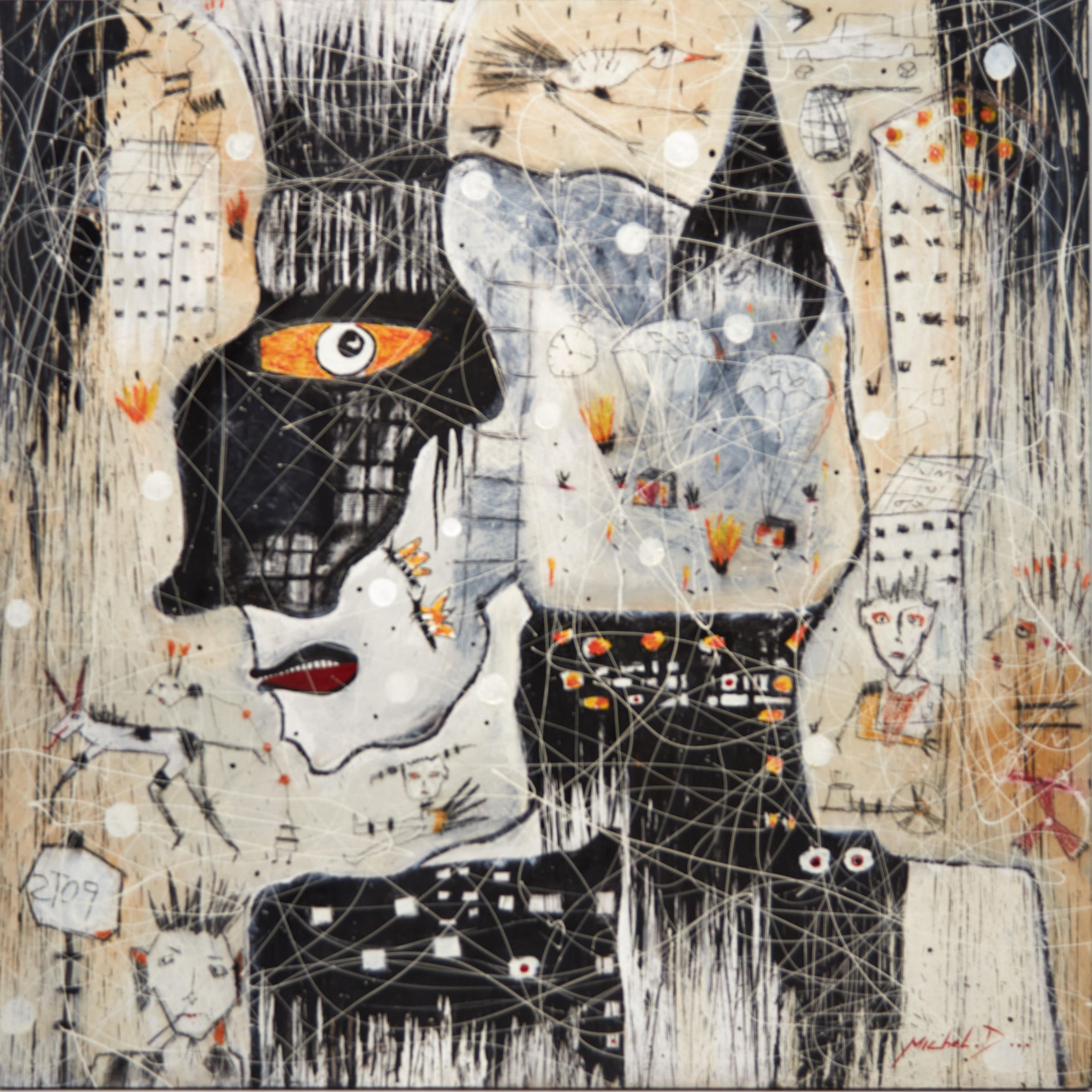 oil on board. Abstract collage style painting depicting a main portrait with smaller elements around and inside. Overall color is black/white with red/orange/yellow details. white paint drip lines over the face of the painting.Made/Created