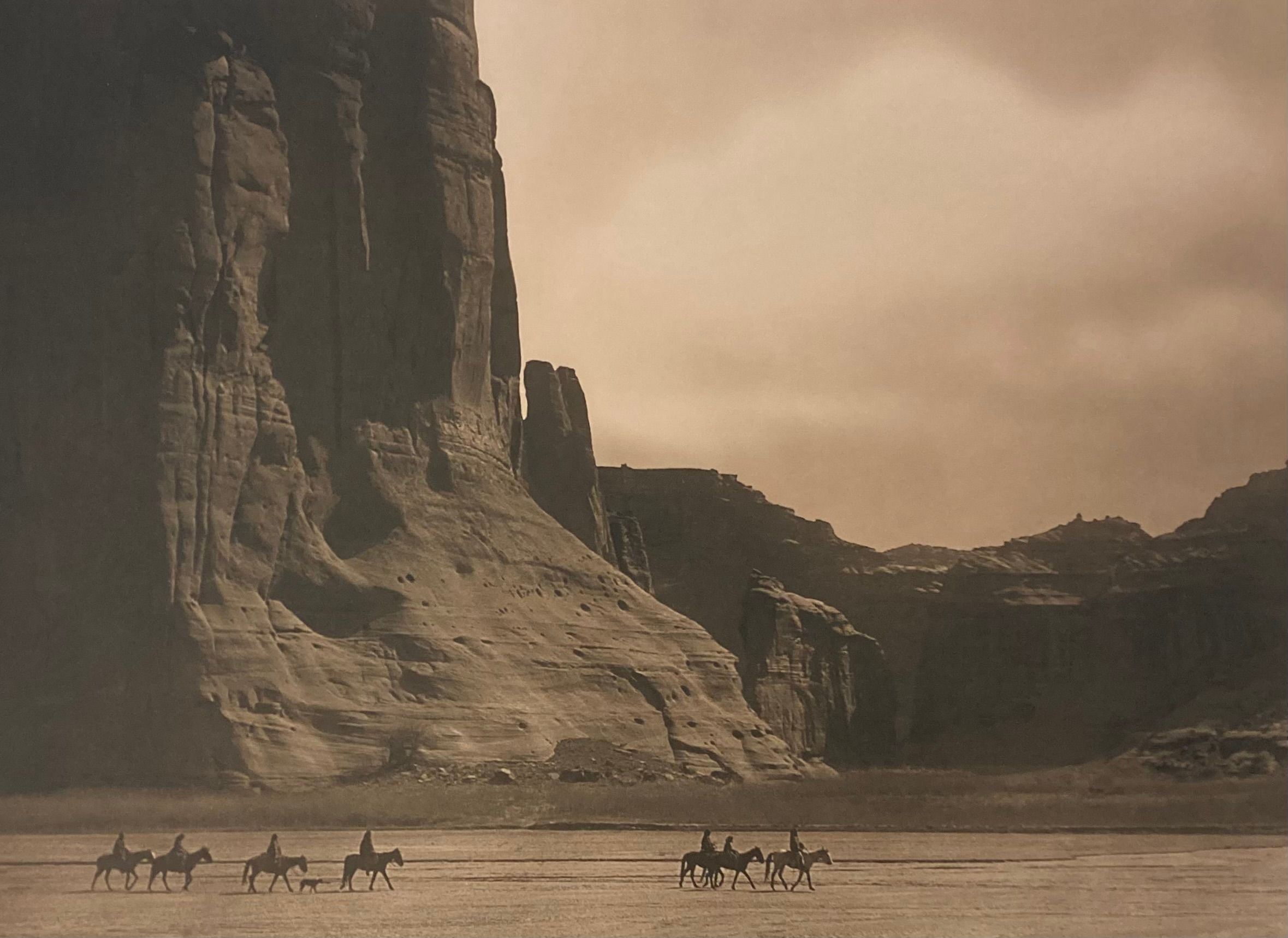 Matted artwork of seven riders on horseback in a line riding left to right in a canyon.Edition