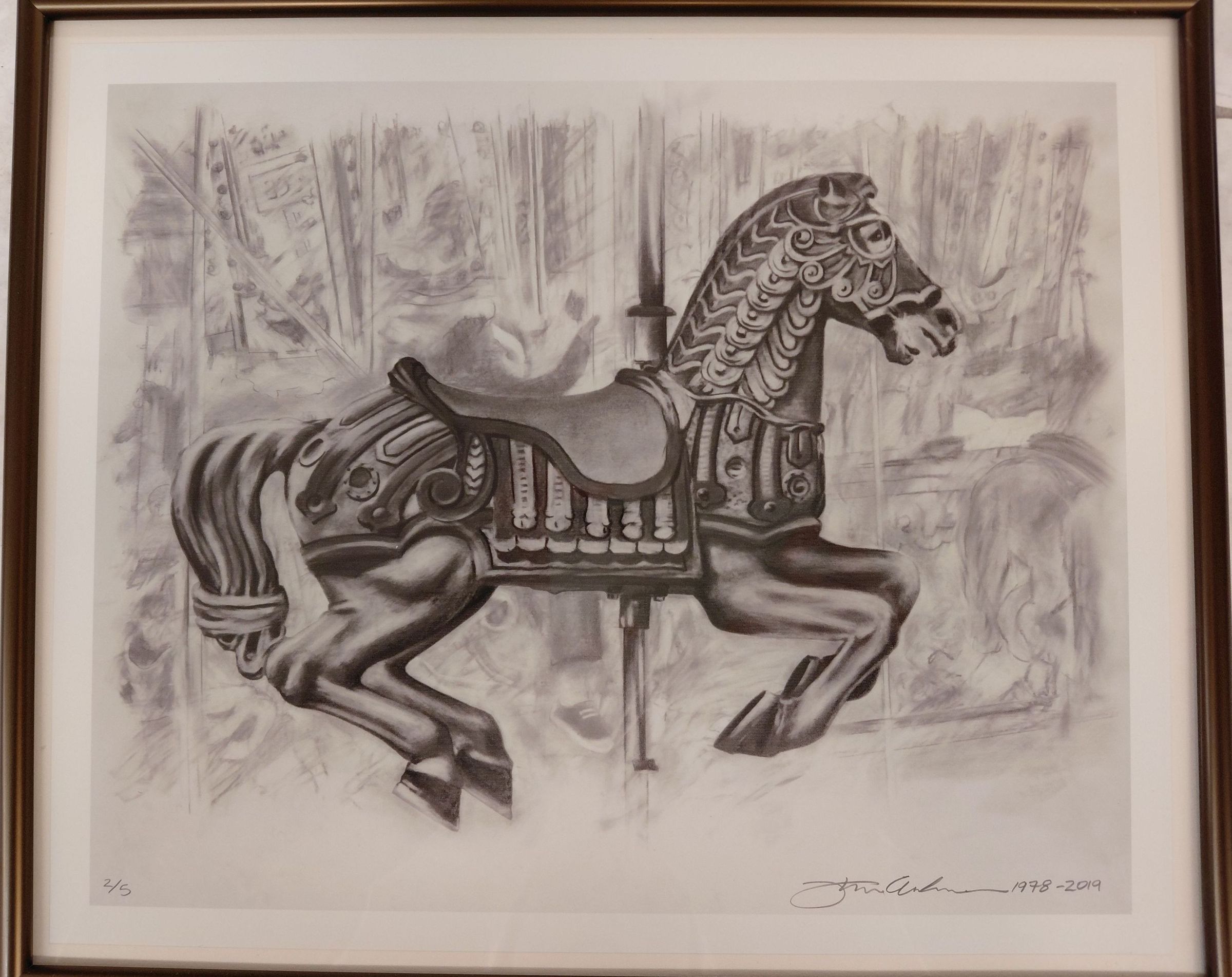 SMA-F-116. Carousel horse, profile view, head facing right, gestural background.Made/Created
