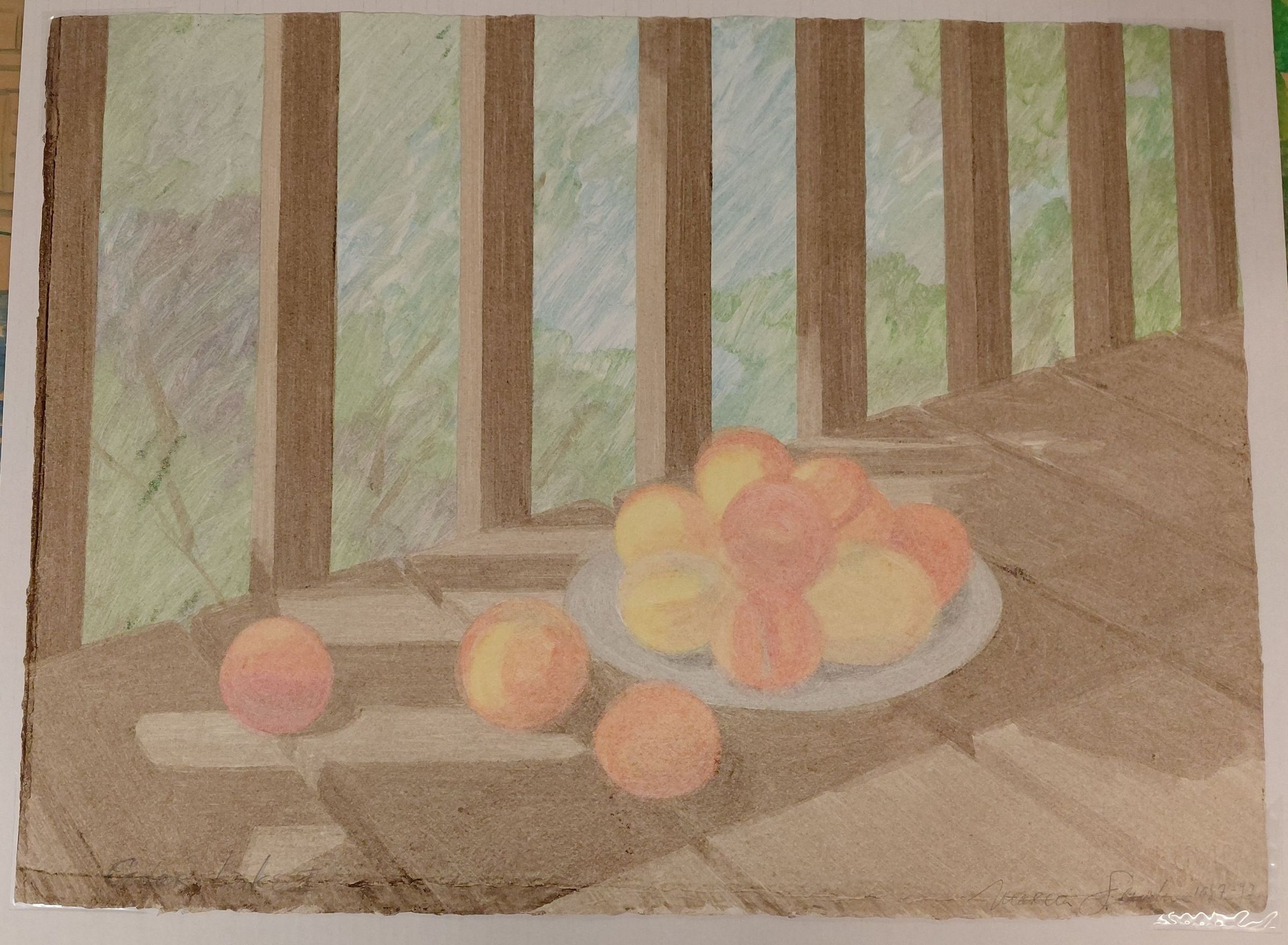 Peaches on a plate, three in front (off of plate), sitting on a wooden deck, trees in the background.
