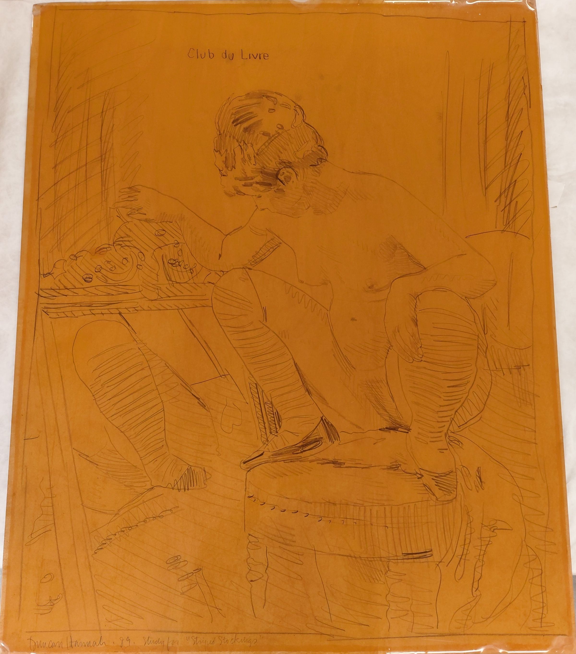 Study for Striped Stockings. SMA46. Drawing of a naked female figure squatting on a stool, facing left.