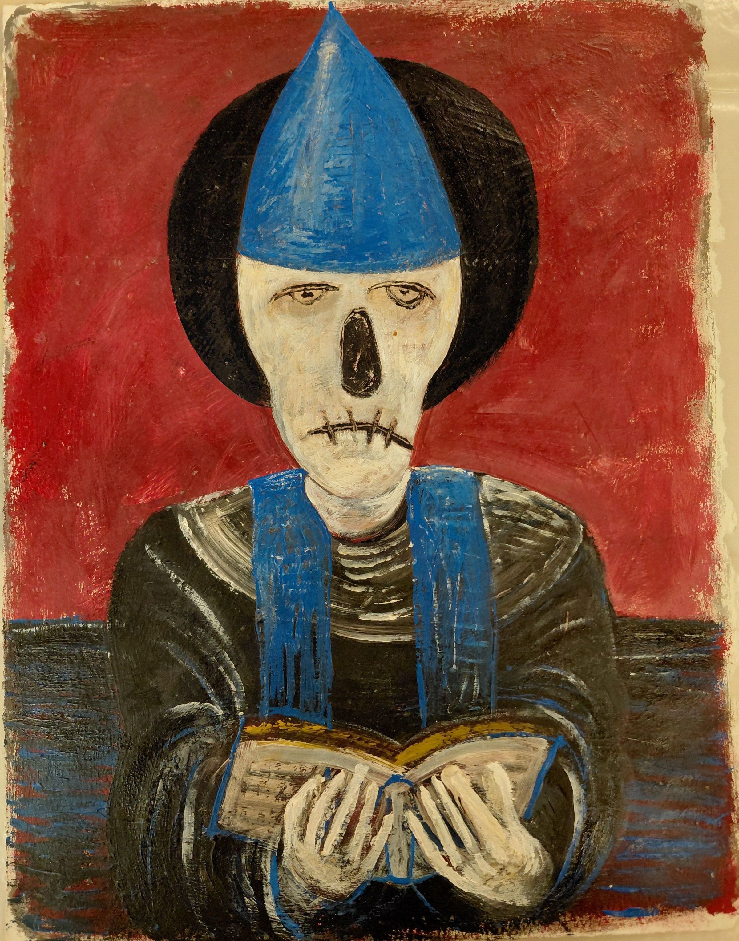 Skeleton figure (death) wearing a blue hat and stole reading from a book. Red/magenta background.