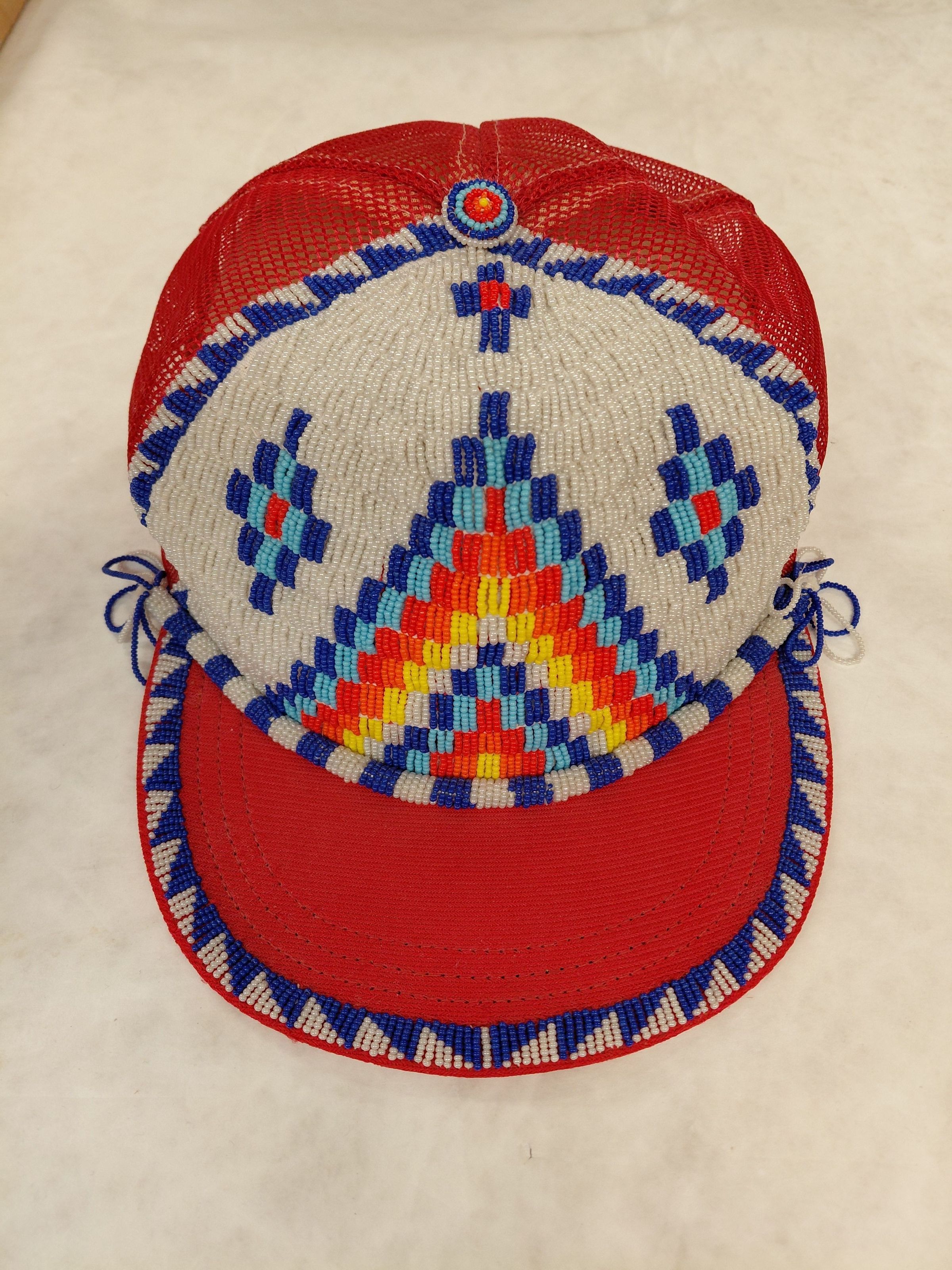 NA0421. Red, mesh backed, baseball cap. Beaded on the front with a triangular geometric design. Majority silver and blue colored beads. Red/orange/yellow sections on large triangle at front. Brim of hat is trimmed with blue/silver beads, flat surface of hat bill is not beaded. Beaded loops on either side where bill meets the rest of the hat.Made/Created