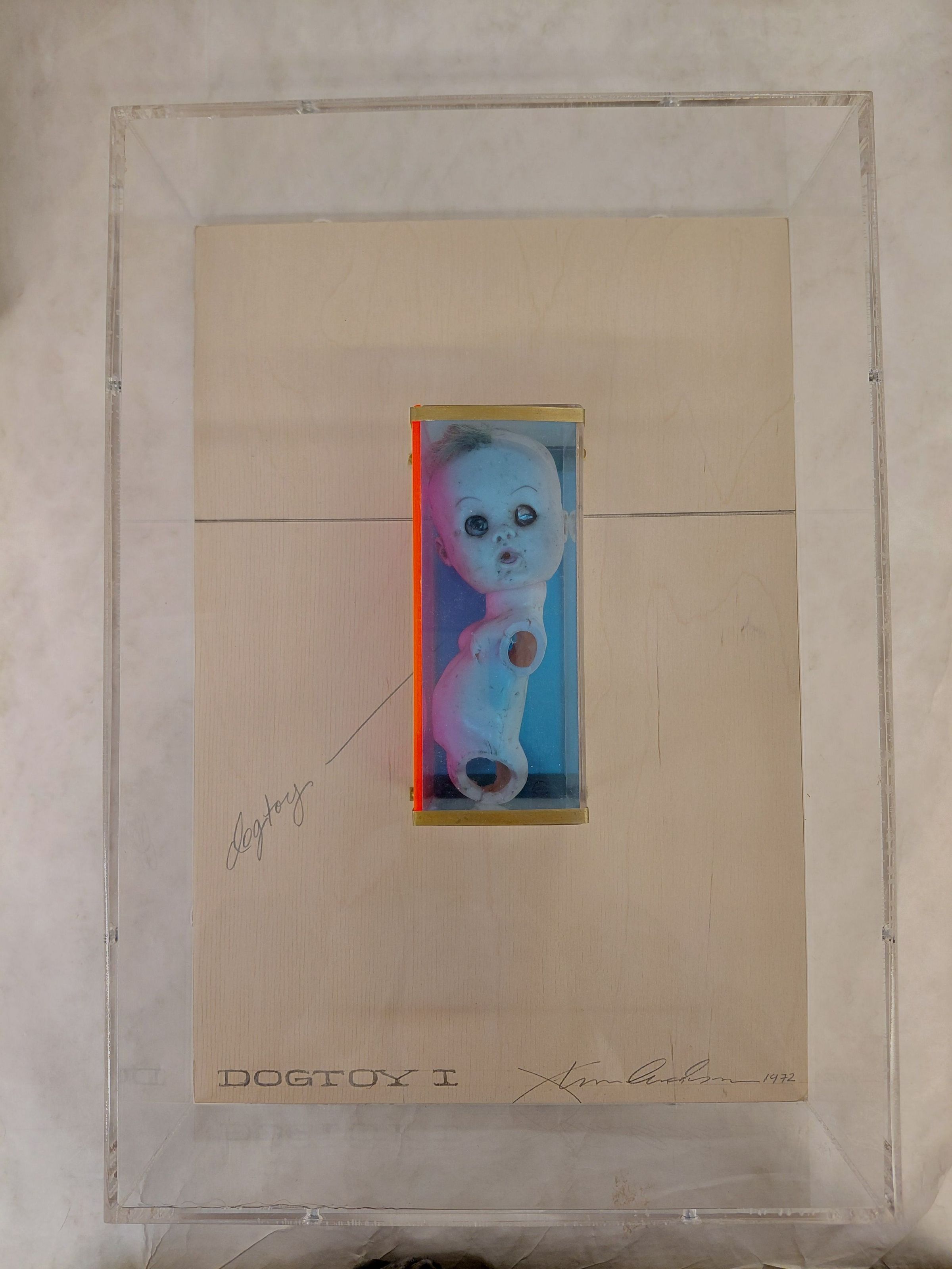Head and torso of a chewed up doll in a multicolored box, bolted onto wood. Labeled "dogtoy" on left side.Made/Created