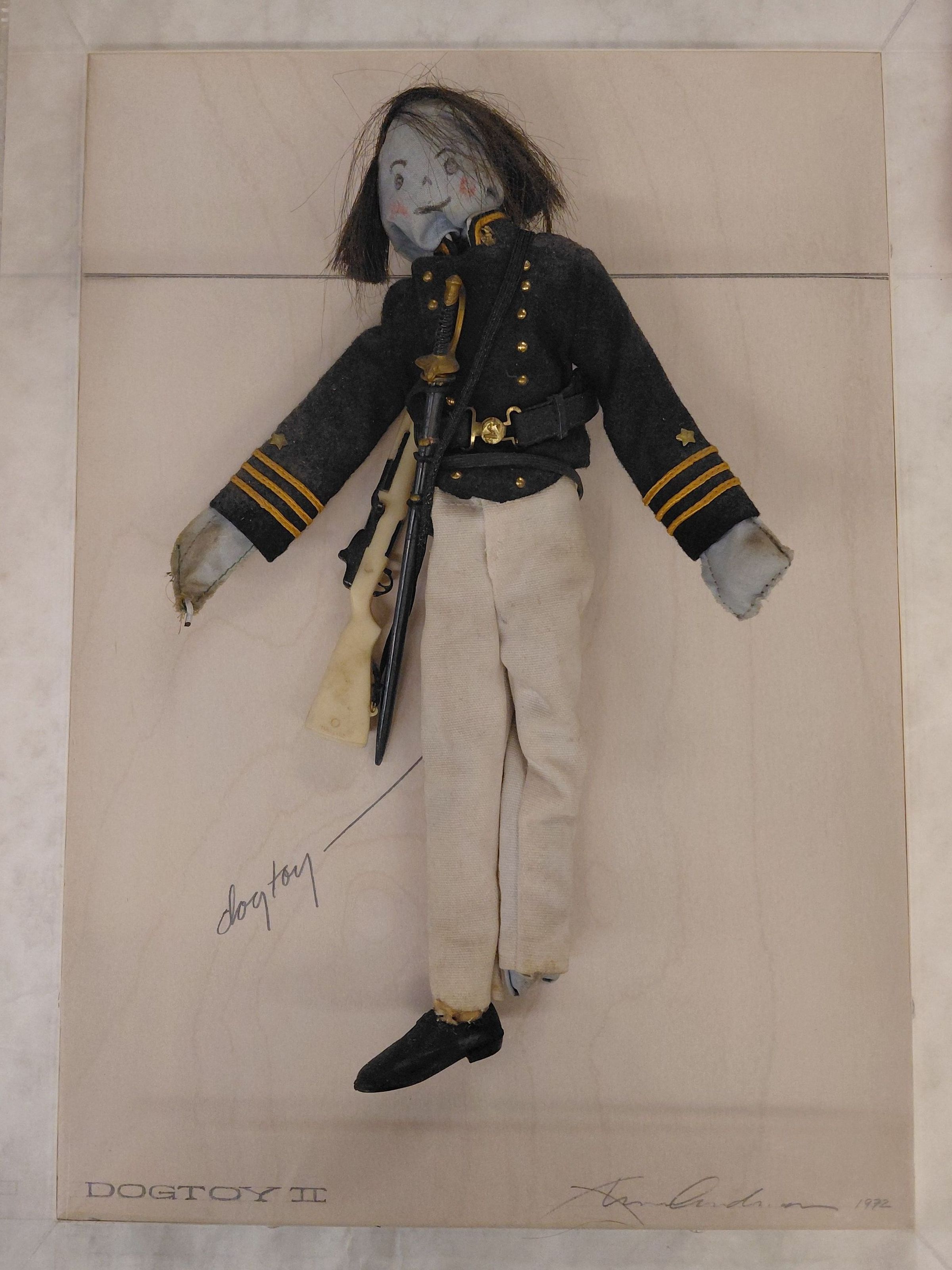 Cloth doll soldier, drawn on face, plastic gun and sword, missing one shoe. Labeled "dogtoy" on left side.Made/Created
